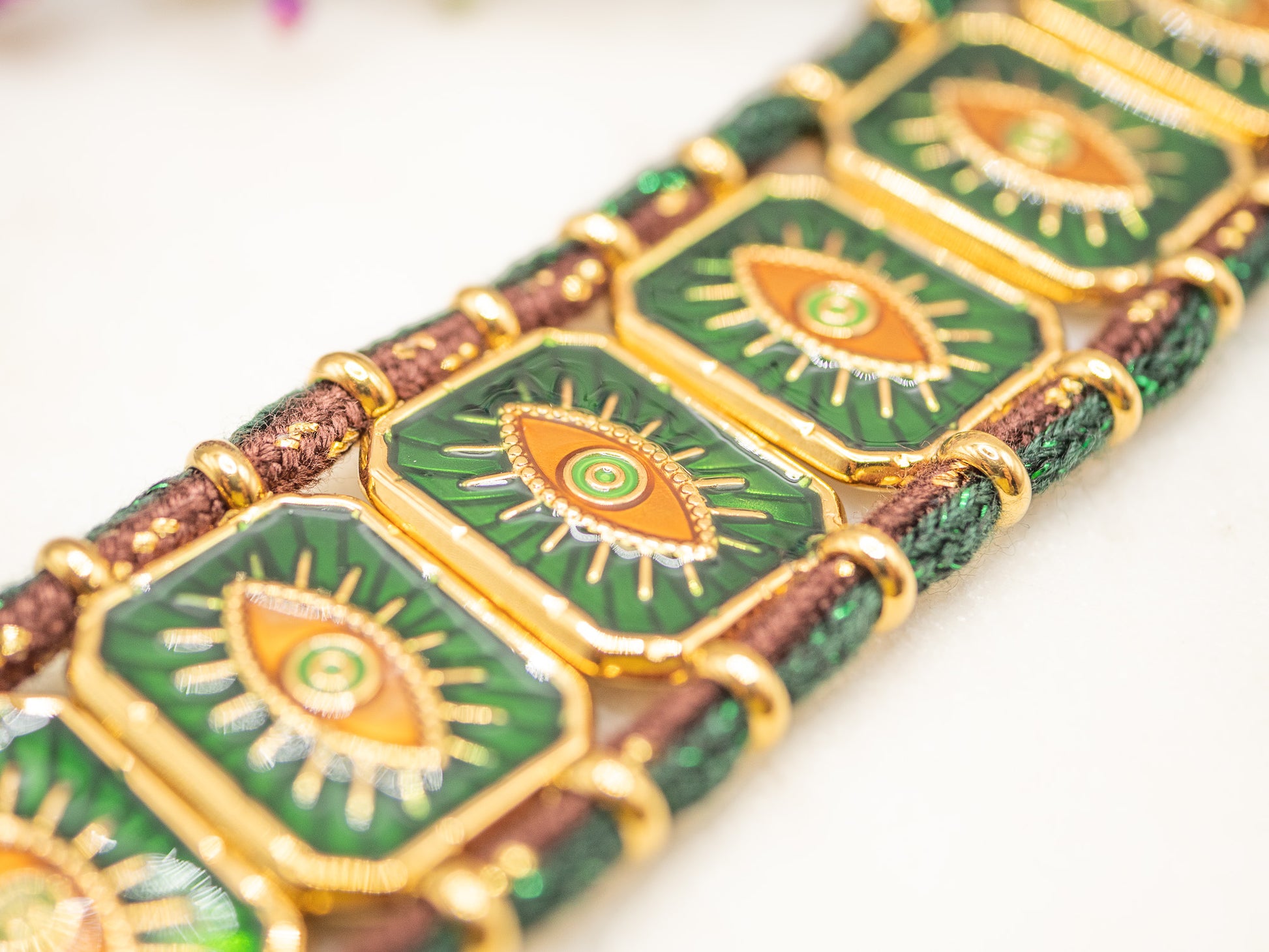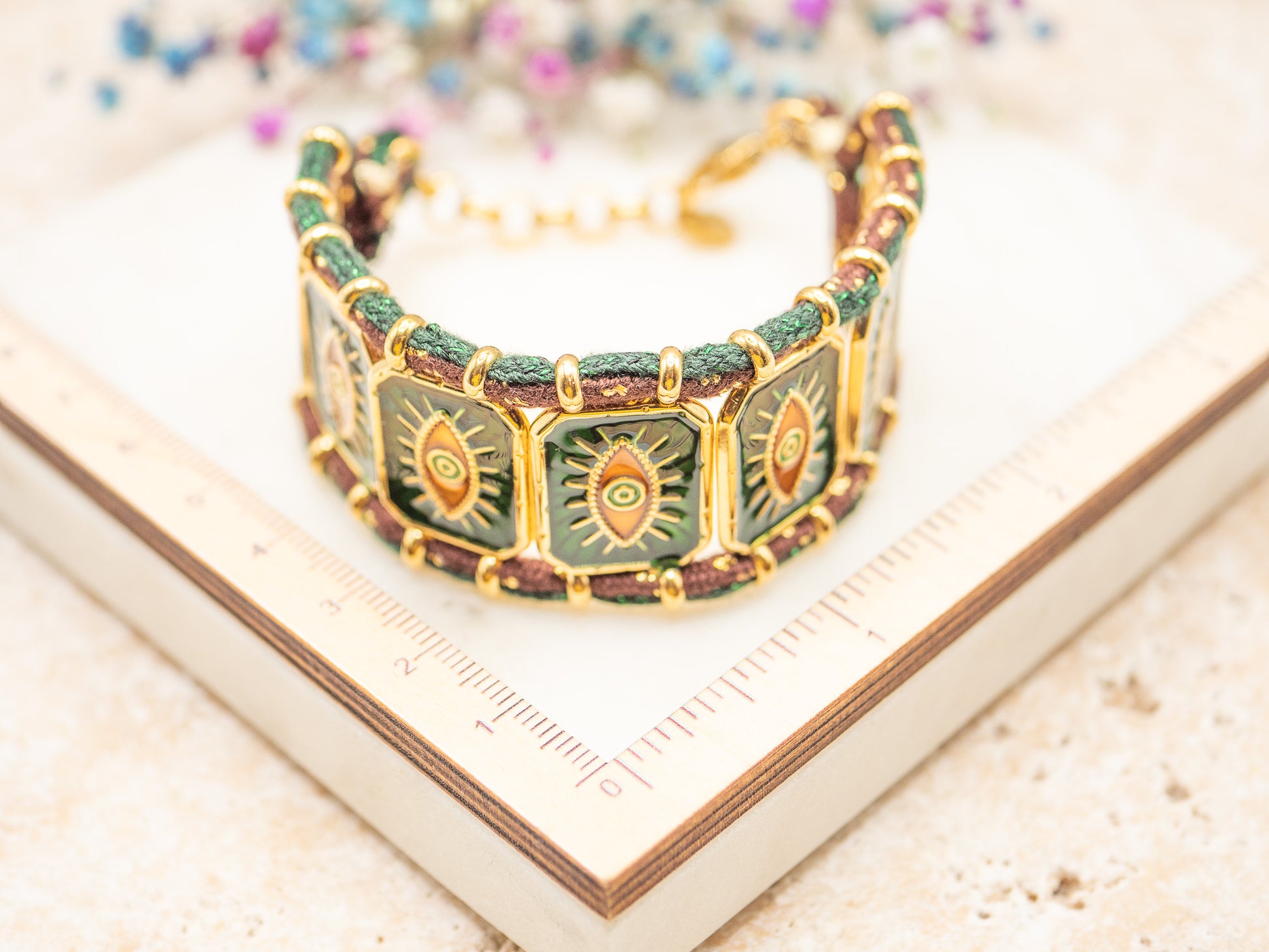 Audacieux, protecteur et intensément stylé, Emerald Custard est le bracelet statement de la collection British Christmas. Ce bijou tisse un lien entre les fêtes mystiques des Highlands et l’esprit excentrique d’un Noël londonien. Avec ses motifs œil stylisé doré, sertis dans des carrés vert émeraude rehaussés de détails bronze, il évoque à la fois la magie, l’élégance victorienne et une touche de folklore revisité.
