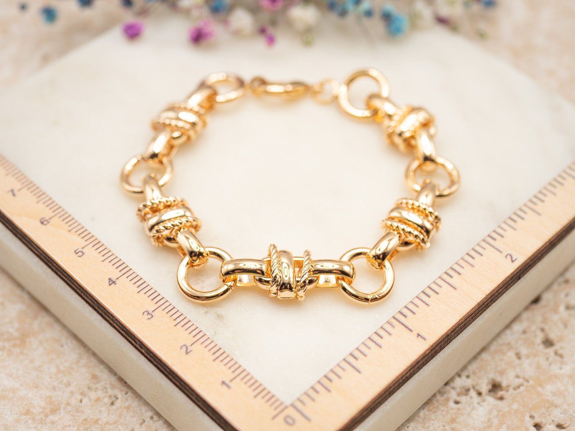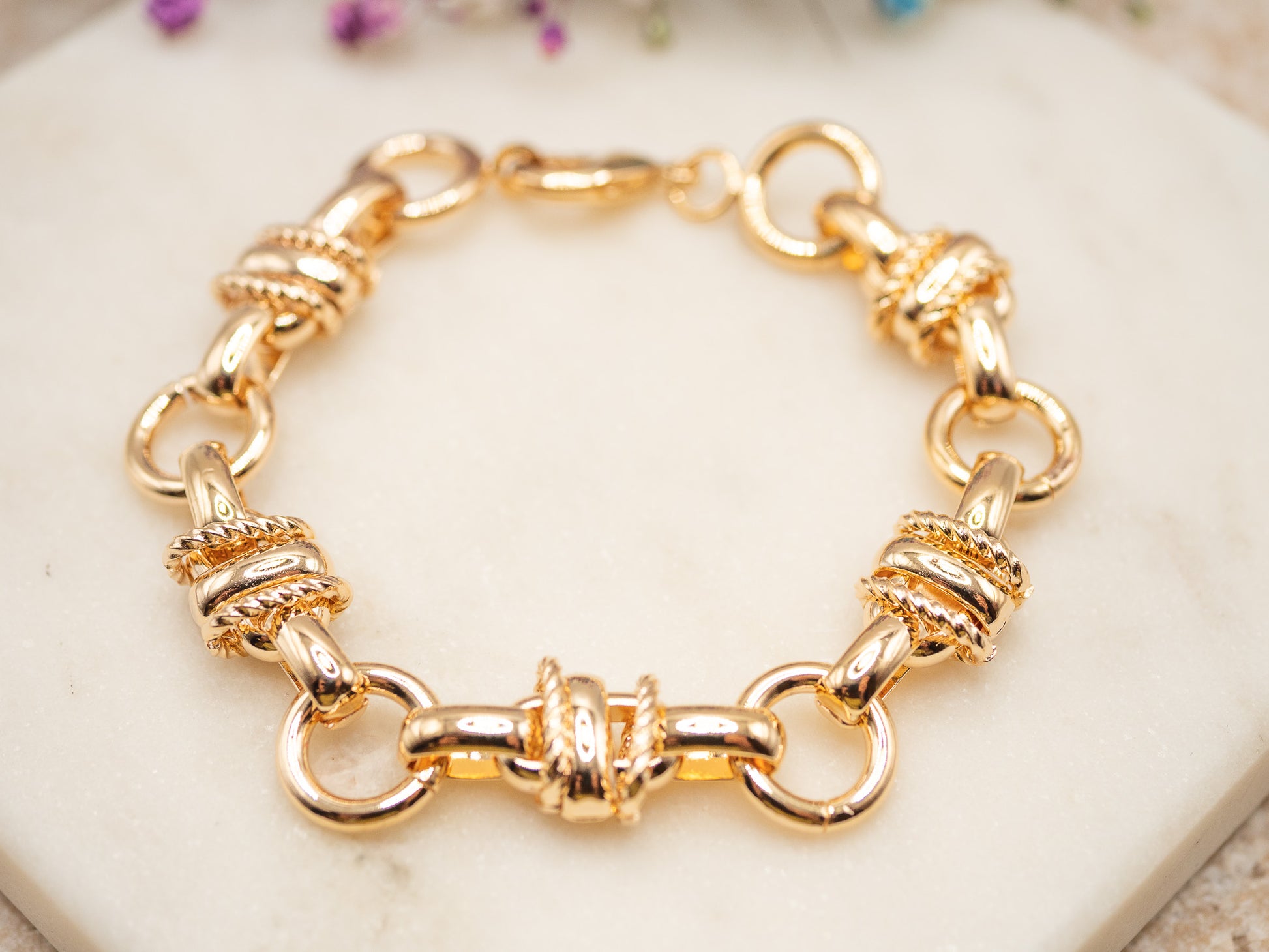 Évoquant le raffinement des parures anciennes revisitées avec modernité, Daisy est un bracelet chaîne à maillons larges au design sculptural. Chaque maillon doré est rehaussé de détails torsadés rappelant les cordages nobles des décors royaux, apportant du relief et une élégance assumée. Son plaqué or 18 carats lui confère une brillance chaleureuse et intemporelle, idéale pour illuminer les tenues d’hiver comme les plus festives.