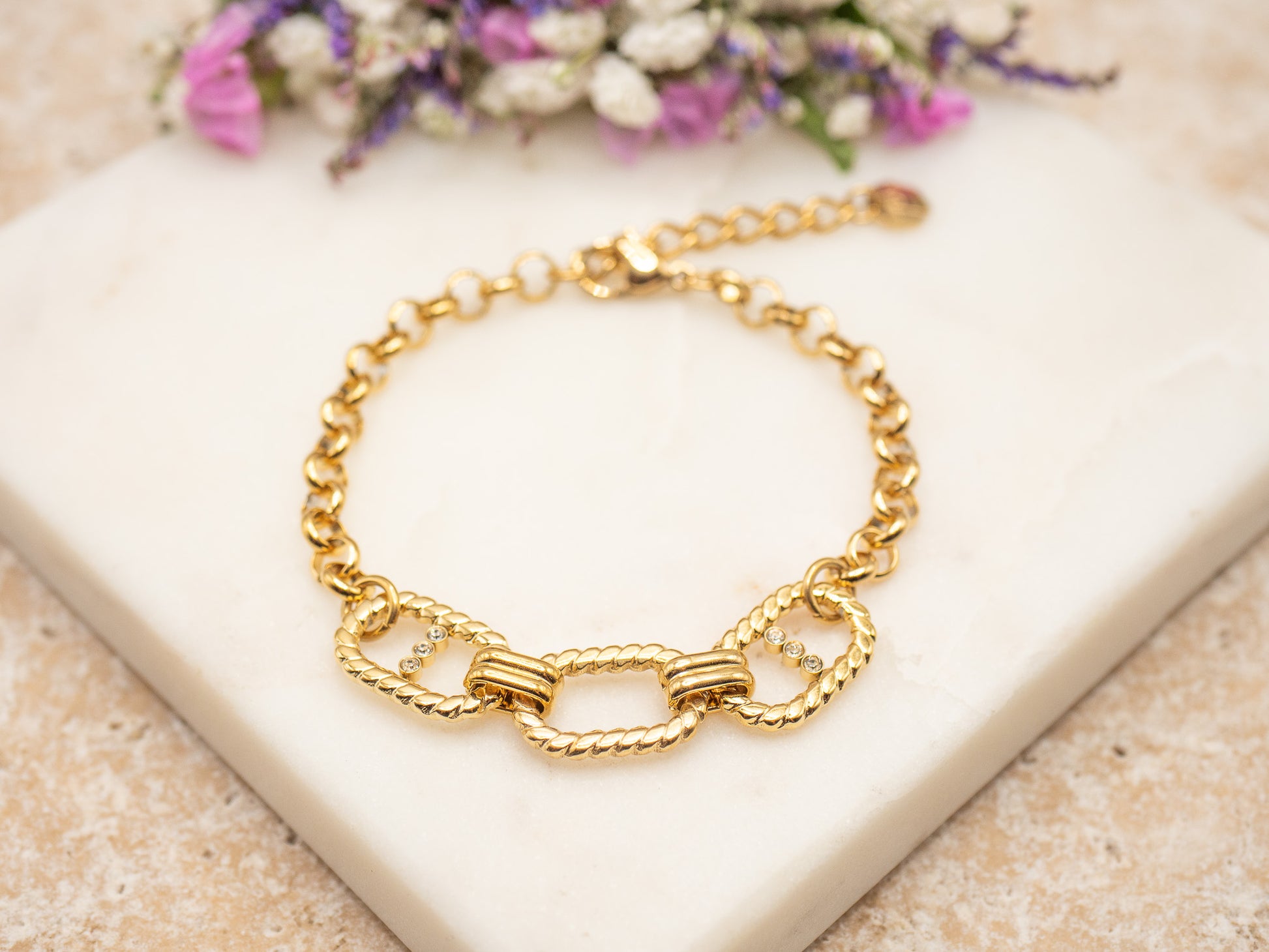 Deneuve incarne une élégance sculpturale et assumée, avec un soupçon d’attitude. Ce bracelet à maillons en acier inoxydable joue sur la géométrie et la texture : des maillons torsadés, soulignés de détails sertis, s’imposent comme une signature forte et intemporelle. L’équilibre parfait entre structure vintage et allure contemporaine.