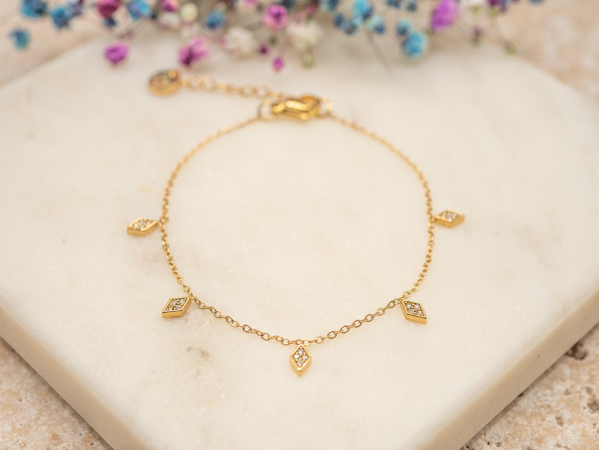 Composé d’une fine chaîne en plaqué or 18 carats, il est orné de cinq pampilles losanges serties de zirconiums scintillants. Chaque mouvement du poignet fait danser la lumière, comme une neige brillante au soleil.