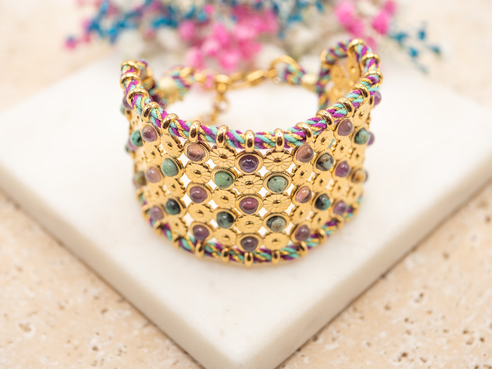 La tresse multicolore qui encadre le bracelet apporte une touche bohème et solaire, comme un fil reliant la nature à l’architecture. Azahara est un bijou généreux, expressif, profondément féminin. Il ne se contente pas d’orner le poignet : il raconte une histoire de beauté, de liberté et d’harmonie.