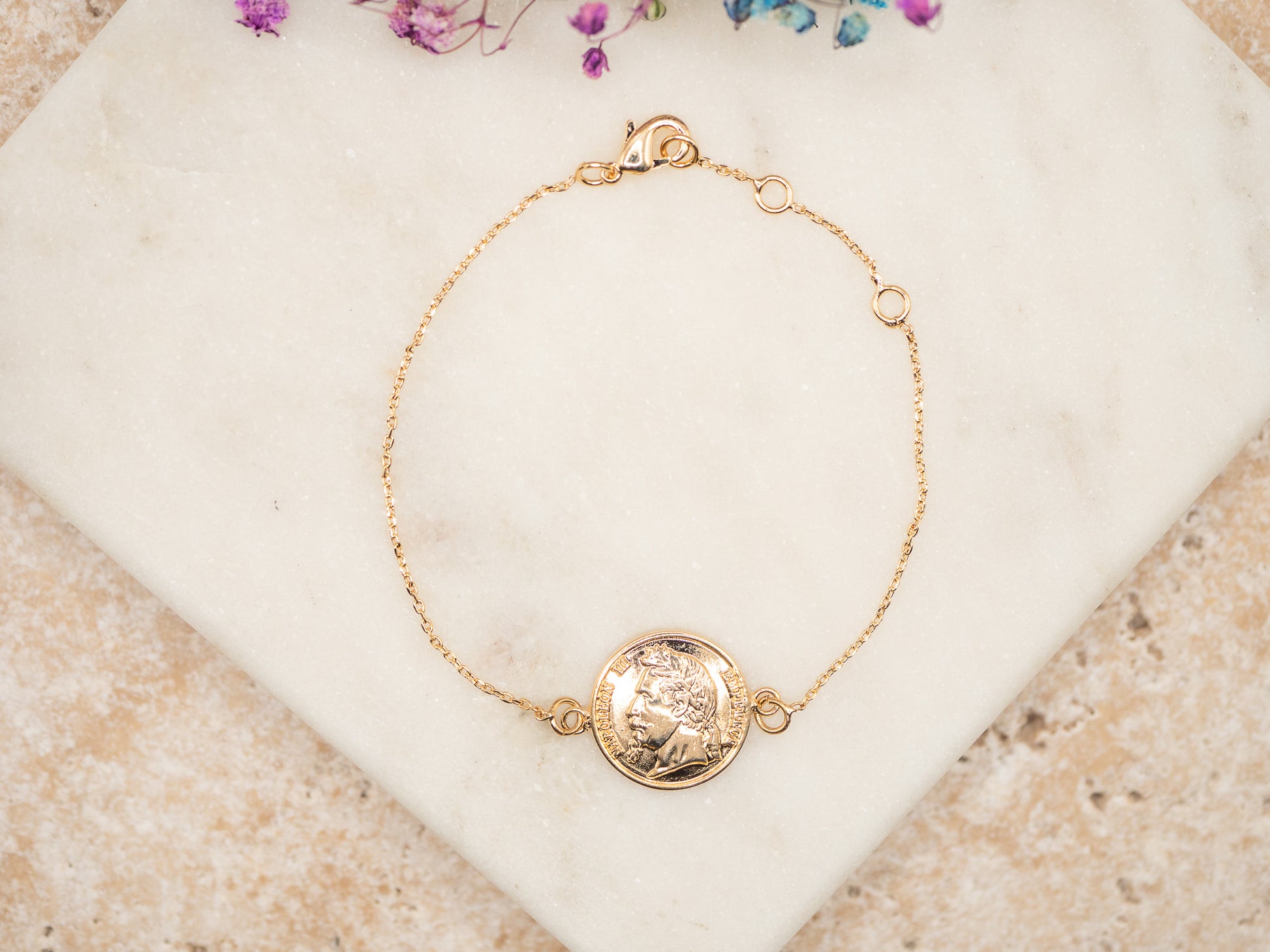 Elizabeth est un bracelet empreint d’élégance intemporelle et d’histoire. Sa médaille centrale arbore une silhouette royale gravée, comme un clin d’œil raffiné aux anciennes pièces de monnaie britanniques. Montée sur une chaîne fine et délicate plaquée or 18 carats, cette pièce évoque le charme de l’ancien monde avec une touche contemporaine. Subtile mais pleine de caractère, elle apporte une aura de noblesse discrète à n’importe quelle tenue.