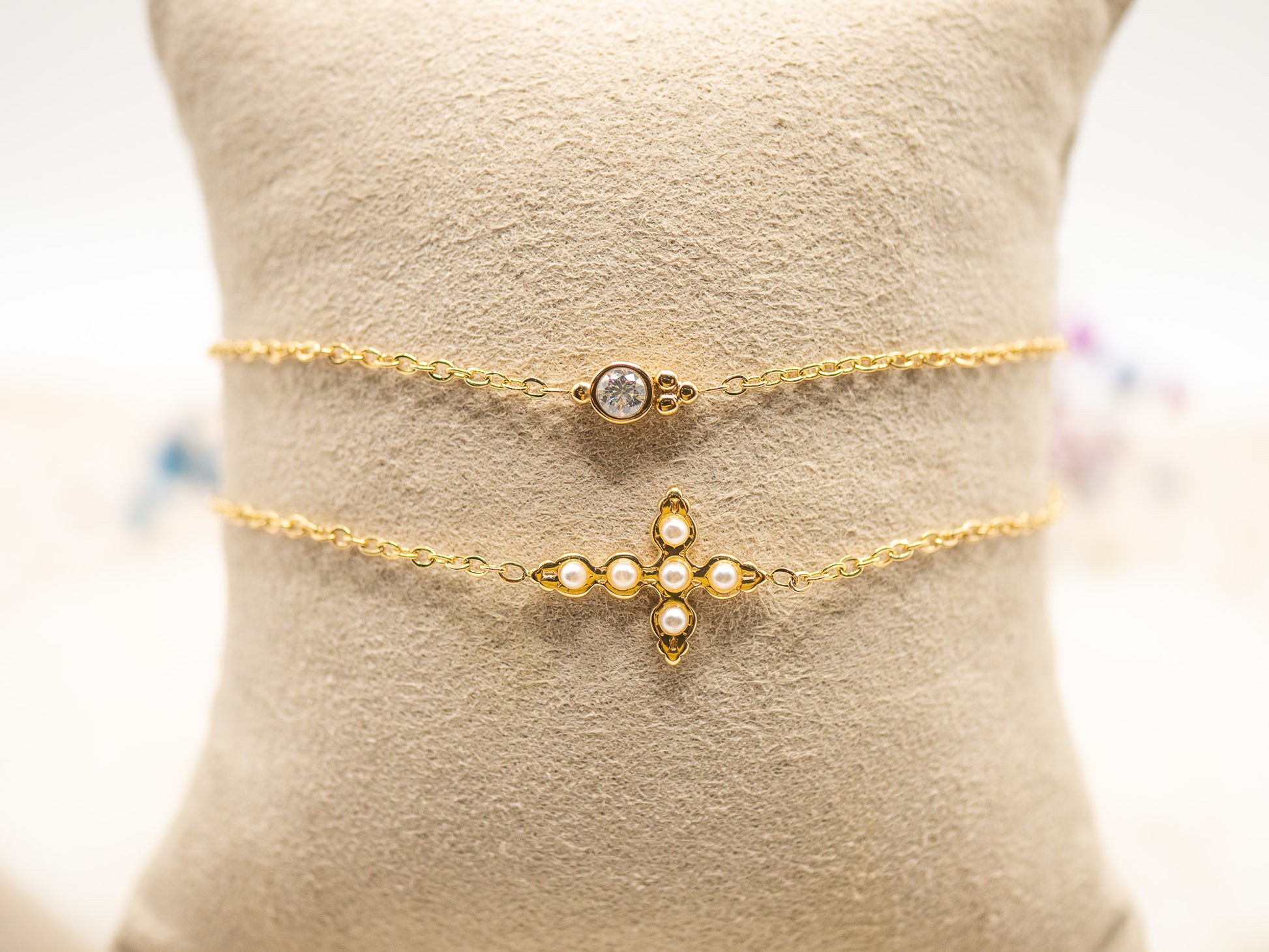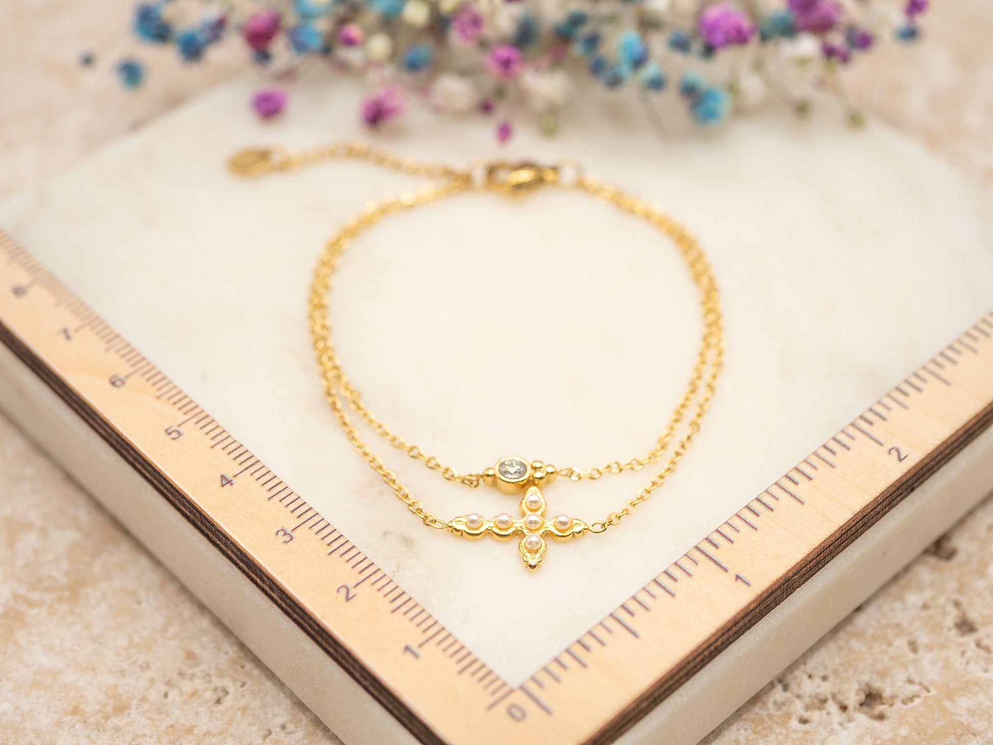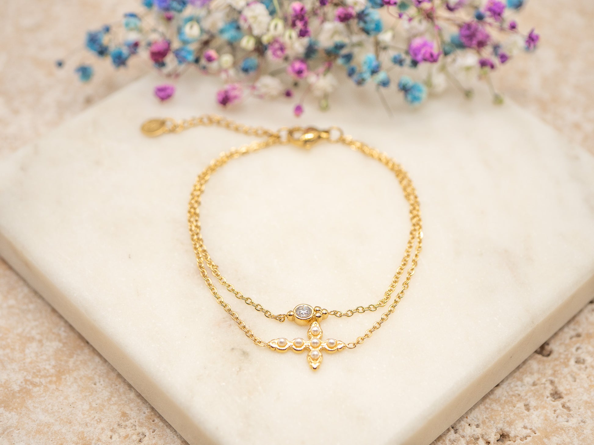 Le bracelet Livia en plaqué or 18 carats séduit par sa délicatesse et son élégance discrète. Son design à double chaîne dorée est rehaussé d’un motif central en forme de croix fleurie, serti de petits zirconiums dont un central étincelant. Raffiné et féminin, il évoque la grâce d’un bijou ancien revisité pour la femme contemporaine.