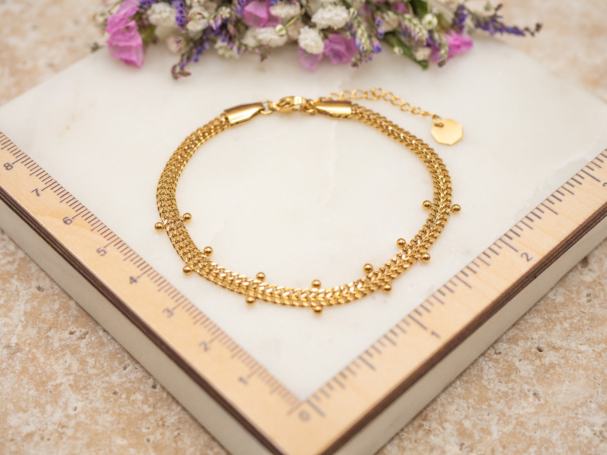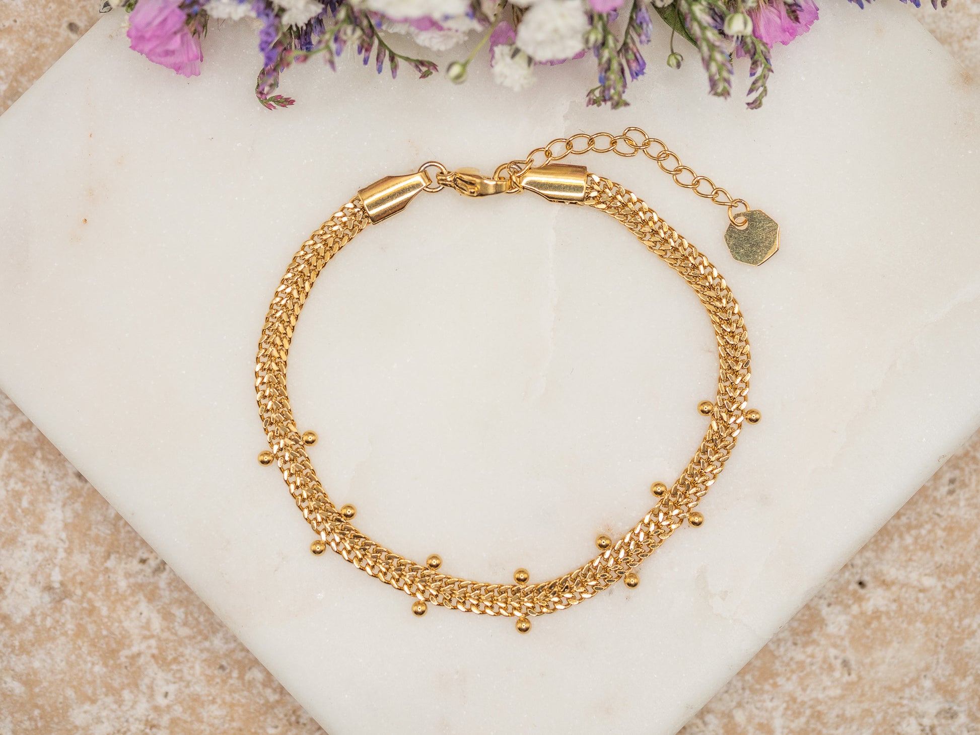 Composé d’une double maille plate en acier inoxydable, il est ponctué de petites perles dorées (environ 2 mm de diamètre) réparties en alternance pour un effet à la fois graphique et féminin. La maille elle-même mesure environ 4 mm de large. Longueur du bracelet : 18 cm, ajustable jusqu’à 21 cm grâce à une chaînette d’extension terminée par un médaillon géométrique.