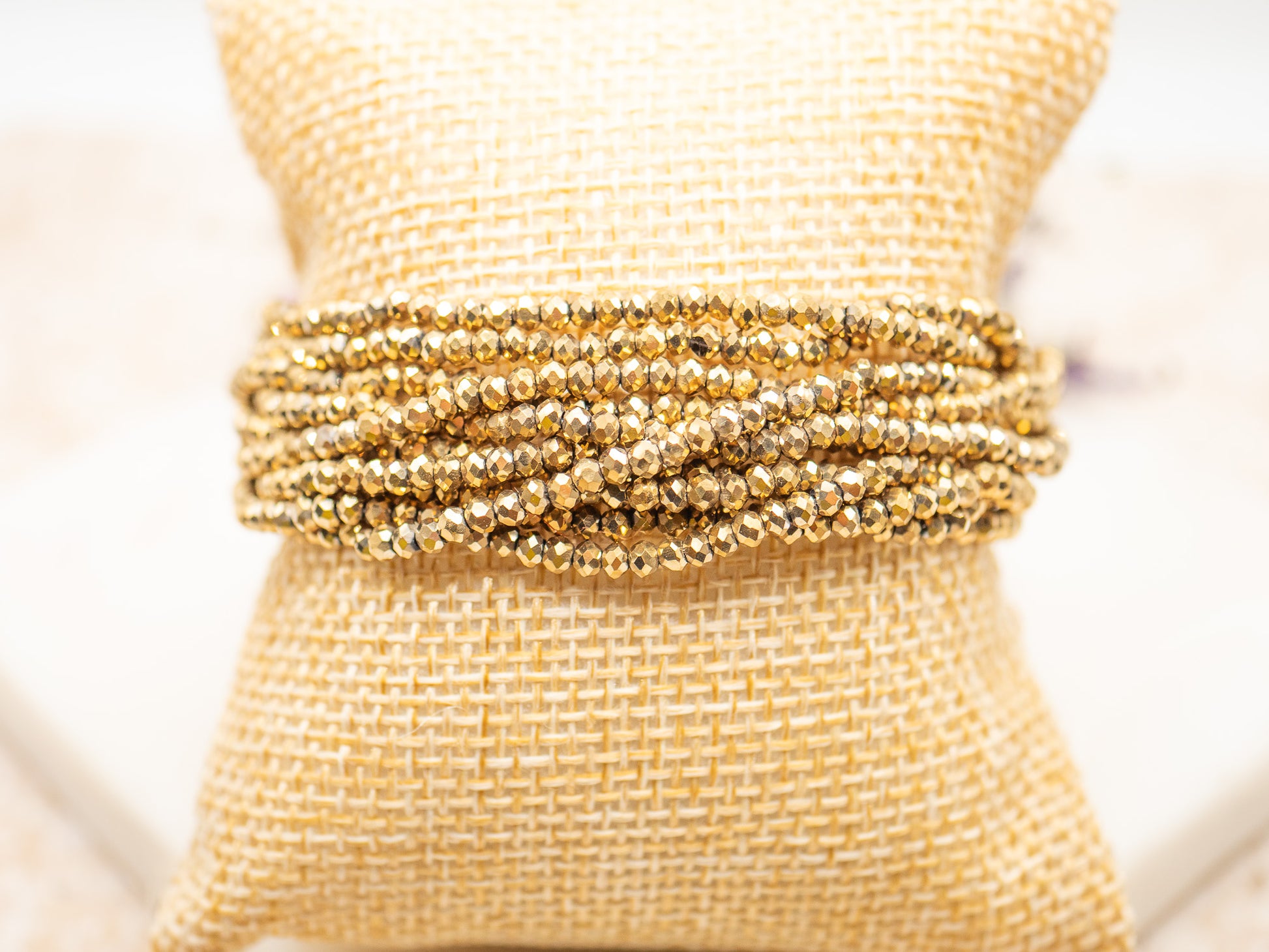 Goldust, c’est le rythme d’un dancefloor londonien, une pluie de lumière dorée qui habille le poignet comme une manchette de scène. Inspiré de la mouvance glam des années 70, ce bracelet multirangs réunit des dizaines de petites perles dorées à la brillance hypnotique, comme si chaque mouvement de main devenait chorégraphie.