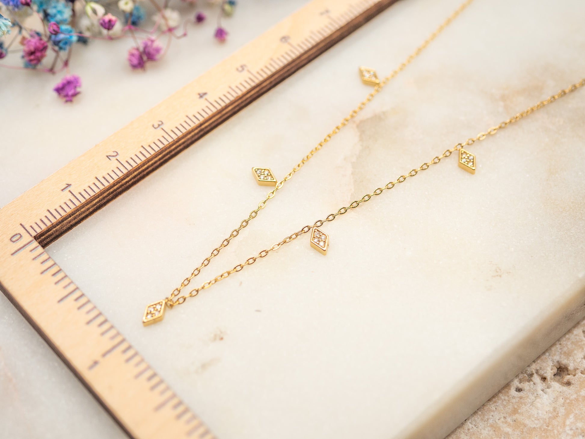 Helen capture l’élégance discrète d’un soir de Noël à la campagne anglaise. Ce collier raffiné en plaqué or 18 carats est orné de petits losanges incrustés de zirconiums, tels des flocons stylisés captant la lumière d’une guirlande scintillante.