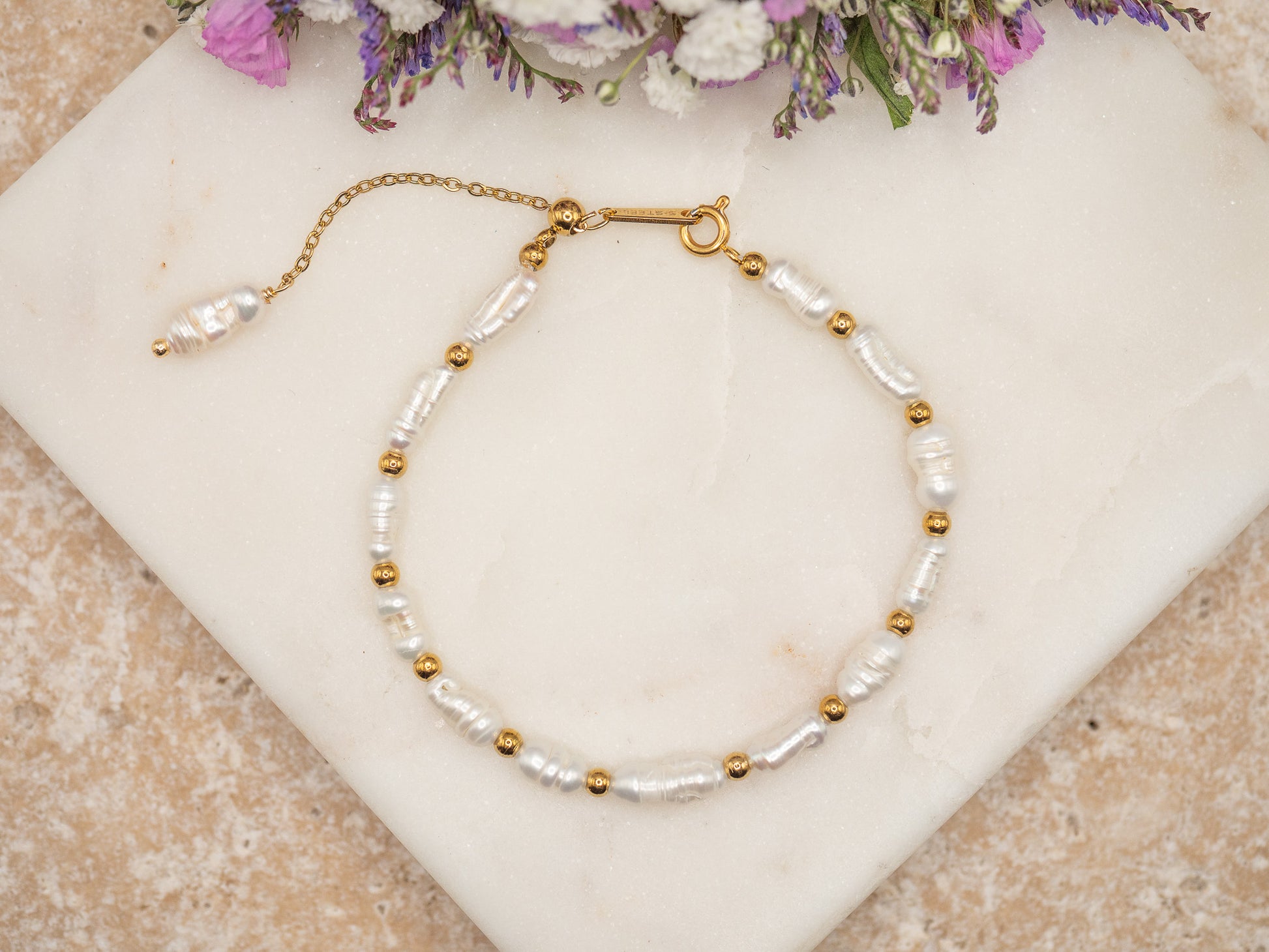 Il se compose de perles d’eau douce baroques, chacune unique, aux formes irrégulières pleines de charme, mesurant en moyenne 0,8 cm à 1 cm de long, séparées par de petites perles dorées en plaqué or 18 carats (environ 3 mm de diamètre). La longueur totale du bracelet est de 18 cm, ajustable jusqu’à 21 cm grâce à une chaînette d’extension terminée par deux jolies mini-perles nacrées.