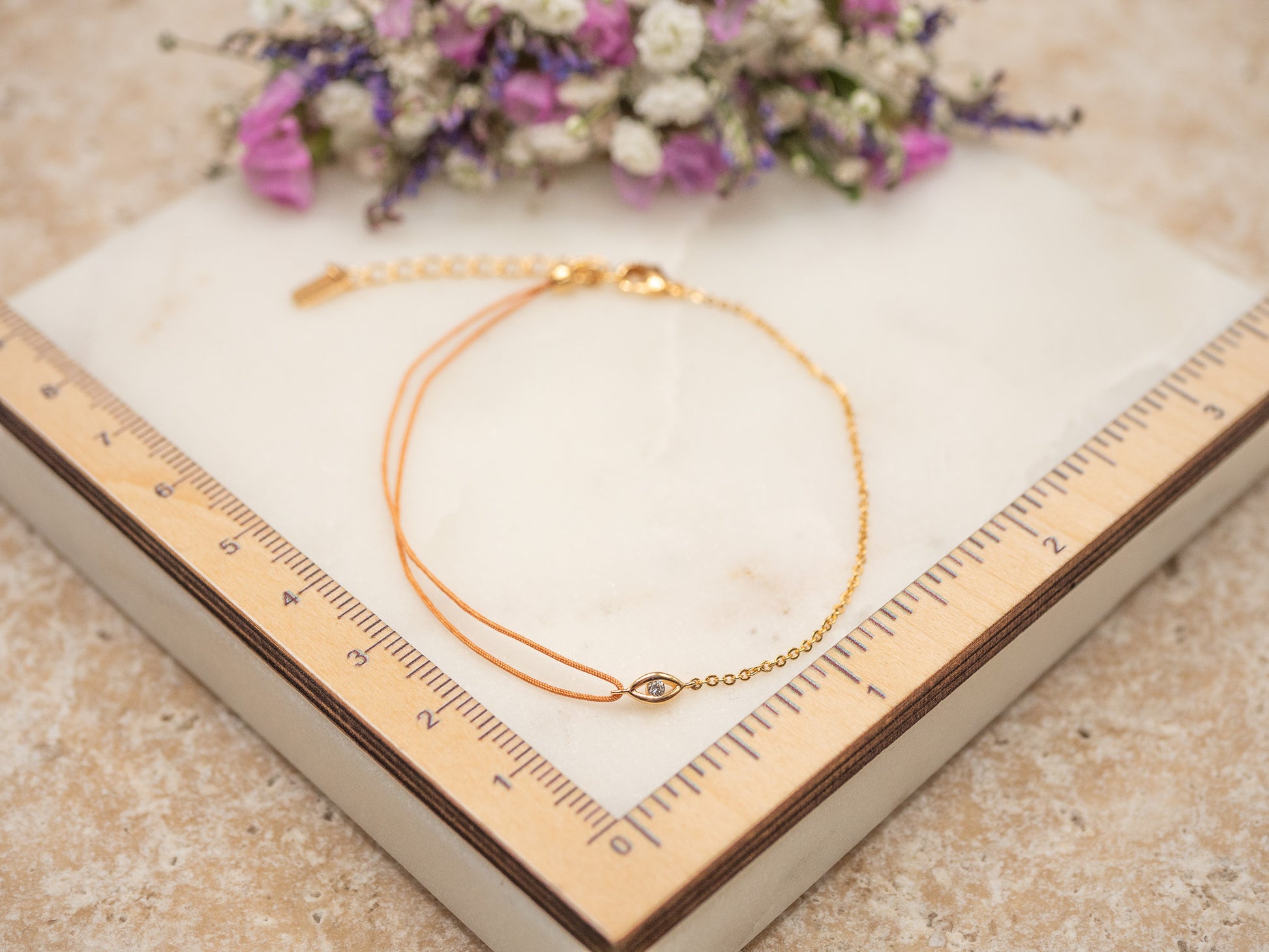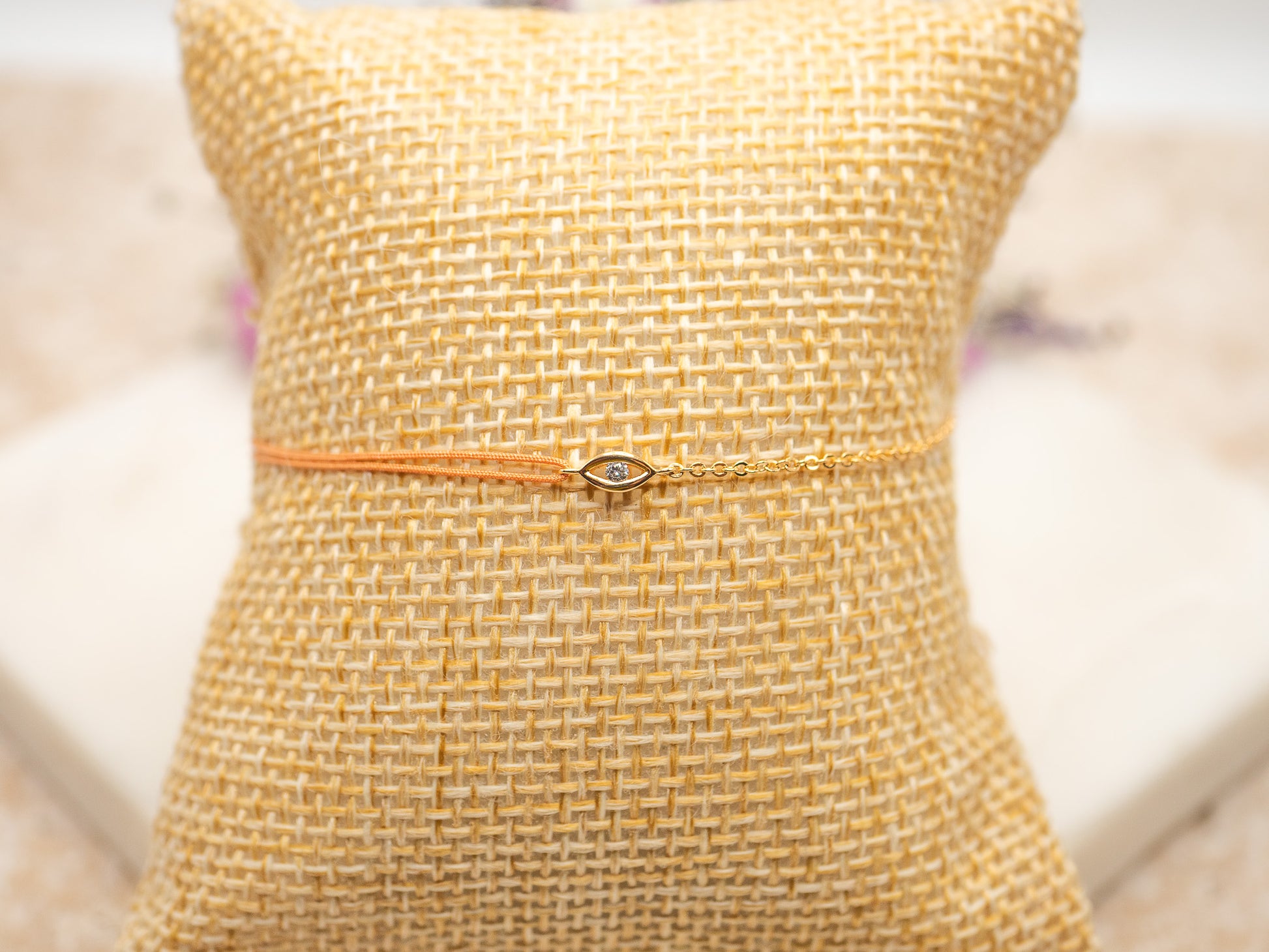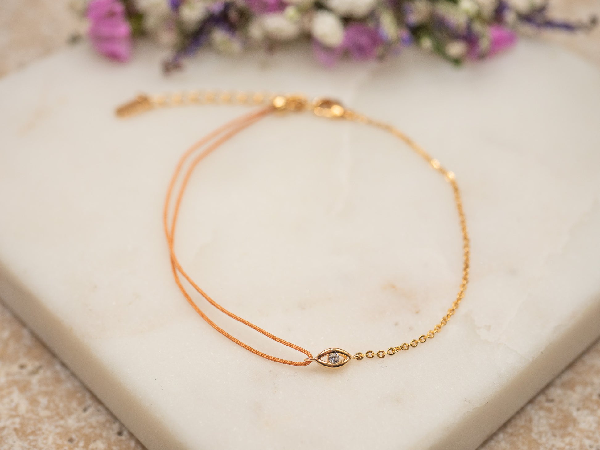 • Et d’un motif œil protecteur doré (environ 0,6 cm x 0,3 cm), serti en son centre d’un zirconium blanc scintillant.
