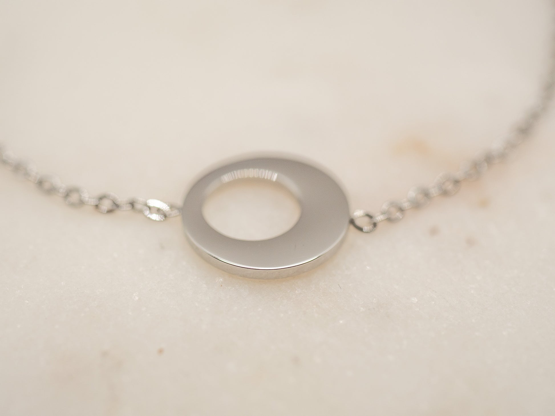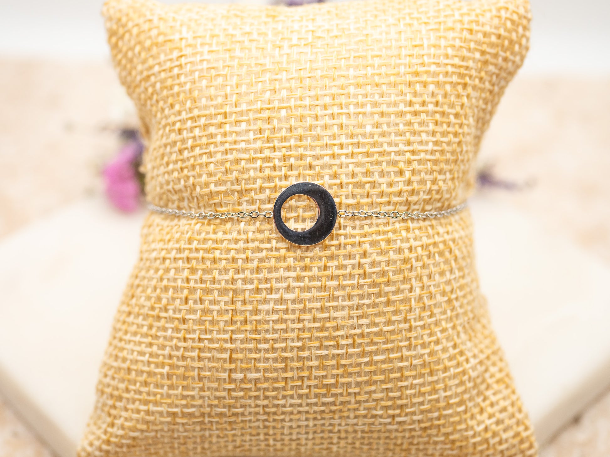 Longueur : 18 cm, ajustable jusqu’à 21 cm grâce à une chaînette d’extension terminée par un médaillon lisse.