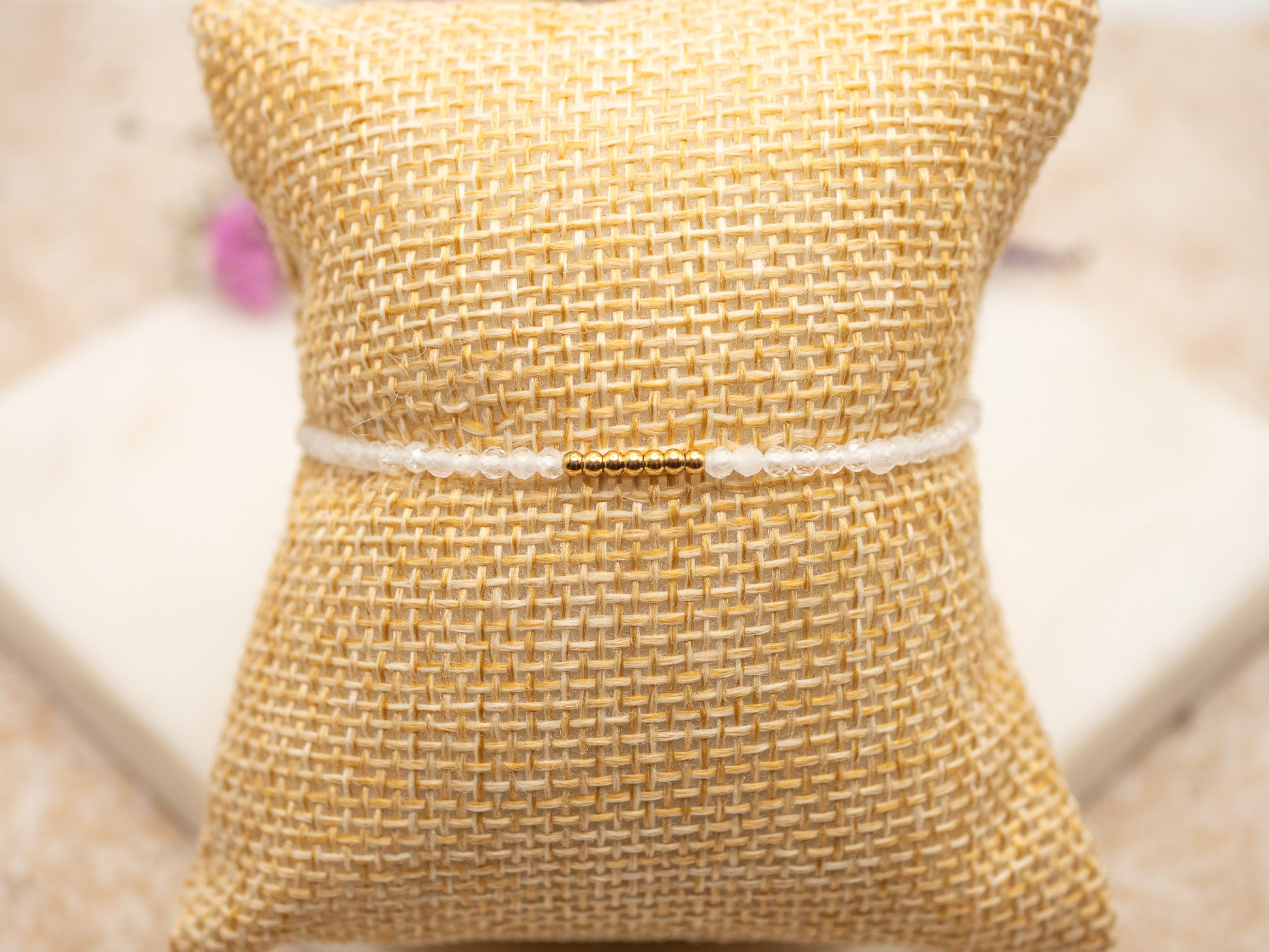 Ce bijou est composé de perles facettées en pierre de lune naturelle, d’un diamètre moyen de 2,5 mm, délicatement transparentes, montées sur un fil résistant et ajustable à l’aide d’un cordon de serrage blanc. En son centre, une séquence de 6 perles dorées en acier inoxydable ajoute une touche solaire et précieuse. De petites perles dorées ponctuent également le reste du fil pour un équilibre harmonieux et lumineux.