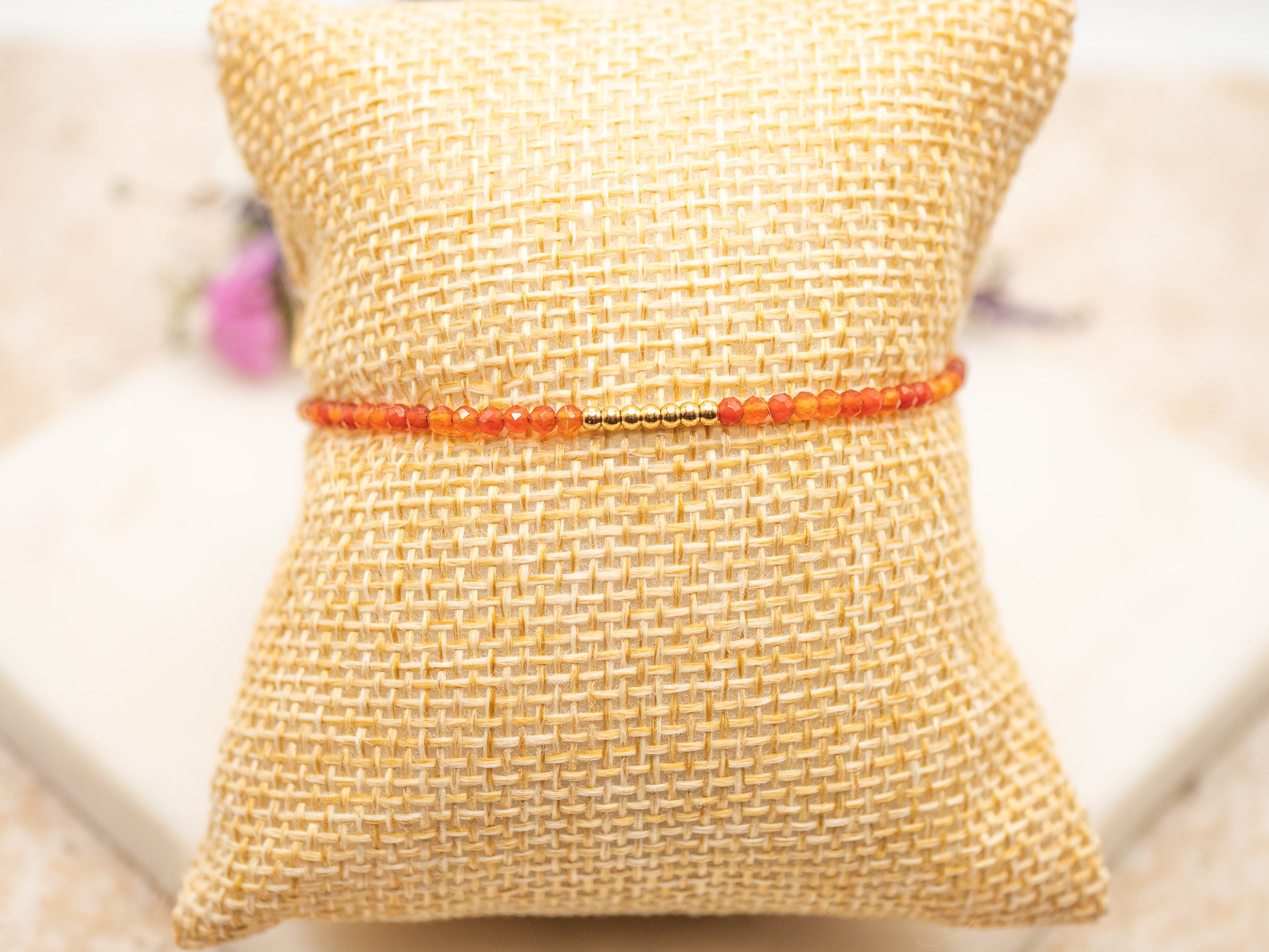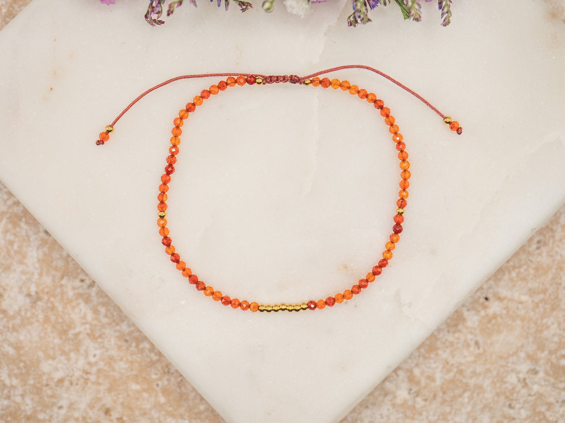 Ce bijou est composé de perles facettées en calcite orange, d’un diamètre moyen de 2,5 mm, délicatement transparentes, montées sur un fil résistant et ajustable à l’aide d’un cordon de serrage blanc. En son centre, une séquence de 6 perles dorées acier inoxydable ajoute une touche solaire et précieuse. De petites perles dorées ponctuent également le reste du fil pour un équilibre harmonieux et lumineux.