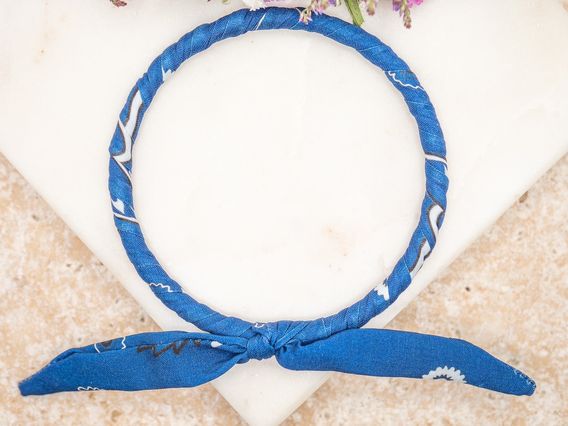 Peckham, c’est le bracelet twisté qui donne le ton. Recouvert d’un tissu vintage à motif cachemire dans un teinte bleue, il évoque à la fois les seventies et l’insolence bohème d’un look à la Twiggy. D’un diamètre d’environ 13,5 cm.