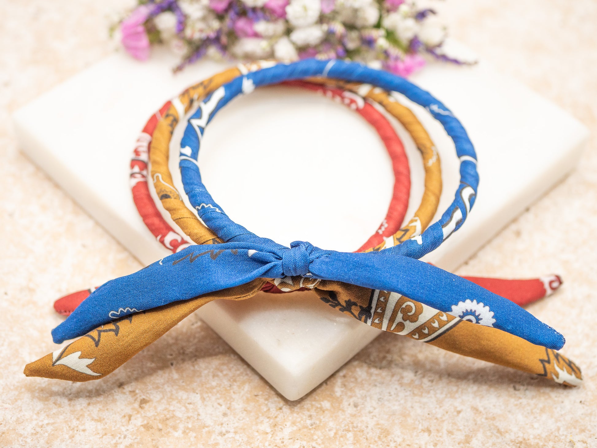 Peckham, c’est le bandeau twisté qui donne le ton. Recouvert d’un tissu vintage à motif cachemire dans des teintes ocre et ivoire, il évoque à la fois les vestes en suède des seventies et l’insolence bohème d’un look à la Twiggy. D’un diamètre d’environ 13,5 cm, il peut se porter en tour de cou ou noué en headband — selon l’envie, selon l’humeur.