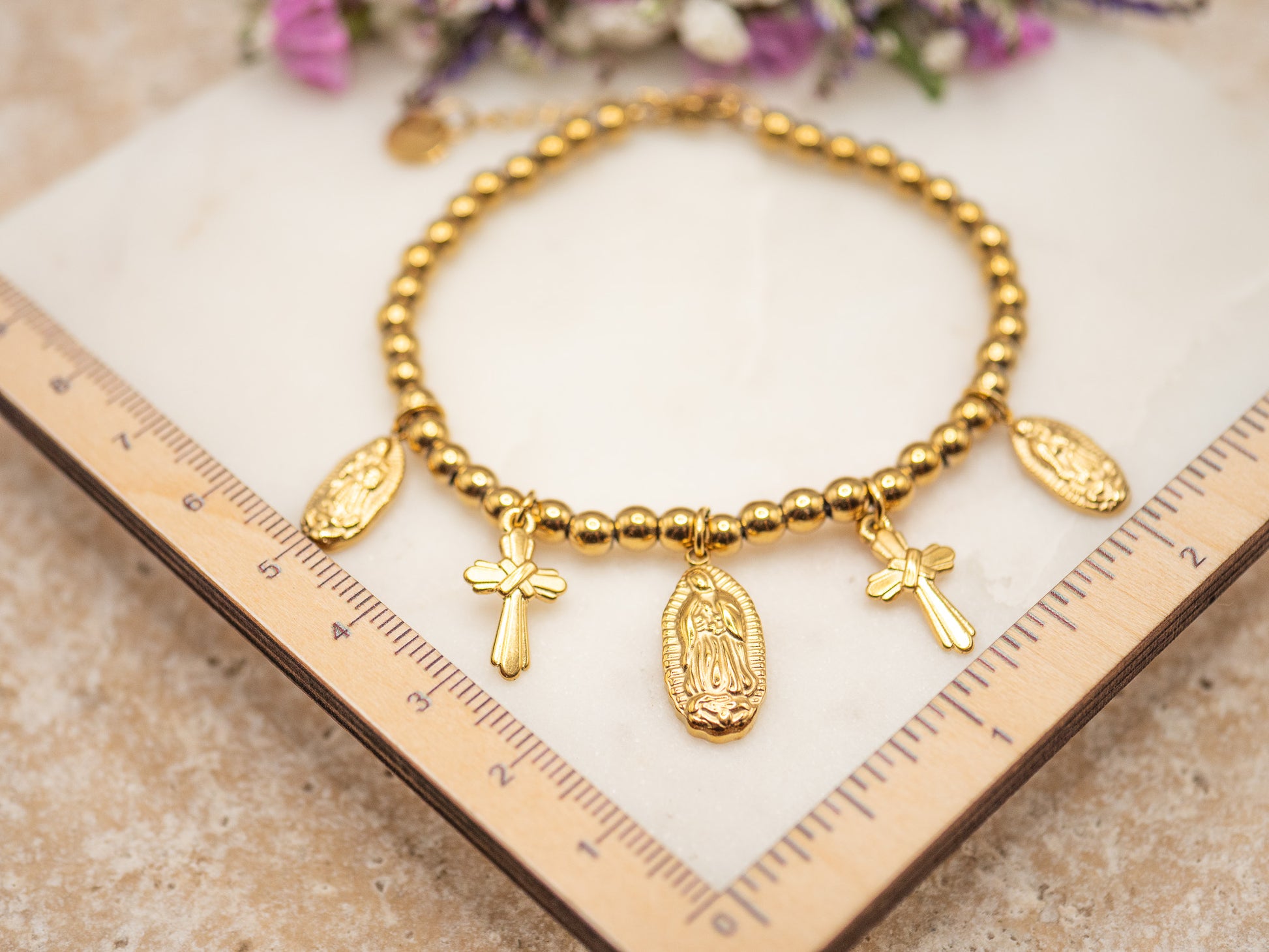 Monté sur un élastique résistant, il se compose de 30 perles rondes dorées d’environ 4 mm chacune, accompagnées de 5 pampilles dorées en relief :