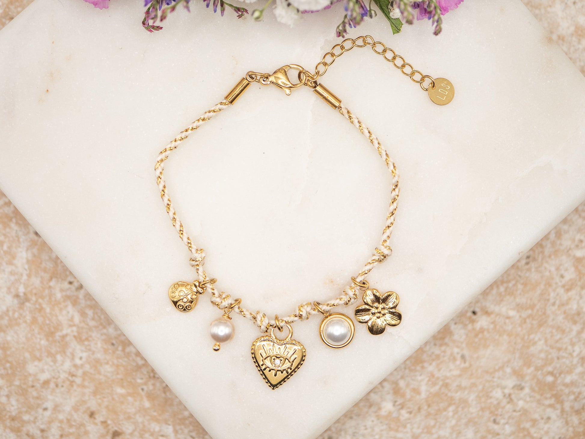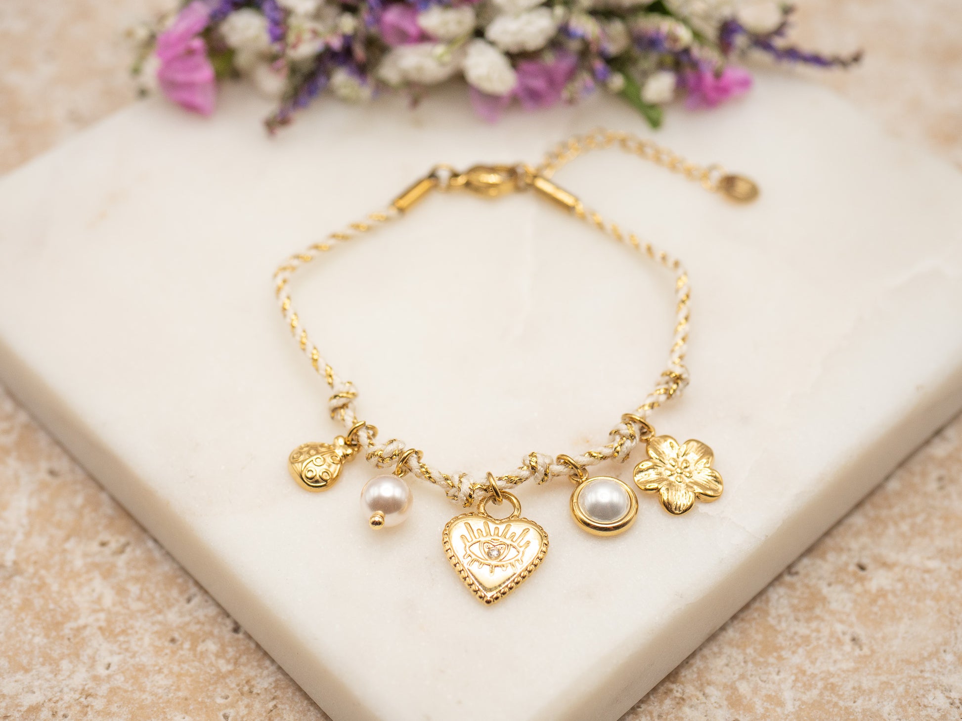 Seraphine est un bijou empreint de douceur mystique et de poésie bohème. Ce bracelet à breloques en acier inoxydable joue la carte du charme avec une délicatesse précieuse. Chaque pampille raconte une histoire : un cœur sacré orné d’un œil protecteur, une perle nacrée, une fleur en relief, un médaillon solaire…