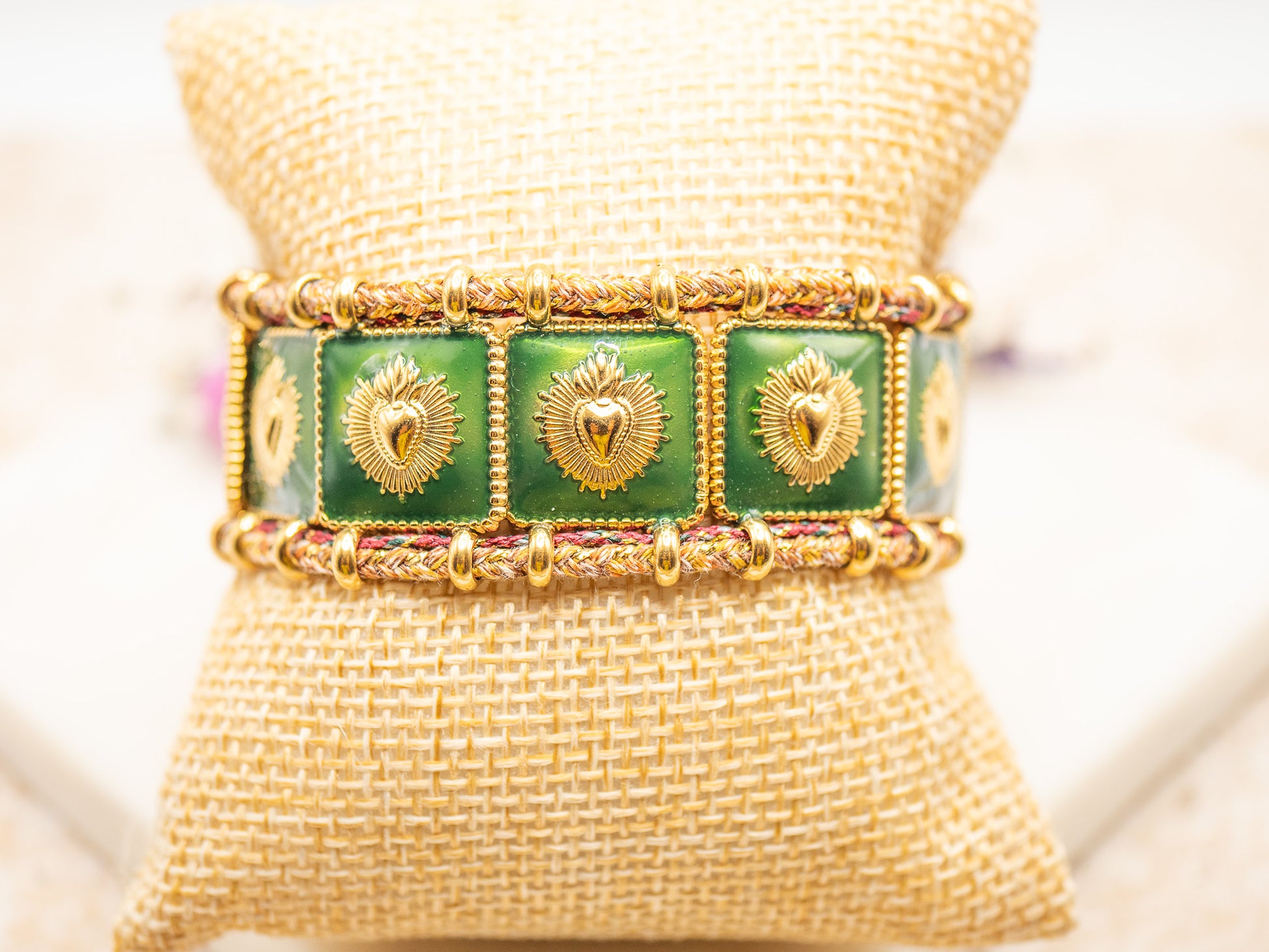 Ses maillons carrés émaillés vert profond, chacun orné d’un soleil en relief doré, évoquent à la fois les bijoux mystiques des festivals hippie et l’esthétique chargée, presque néo-victorienne, des créateurs underground de Soho. Les contours sont travaillés comme une broderie, bordés de filets dorés et de fils tissés rouges et cuivrés, pour un effet opulent, presque byzantin.