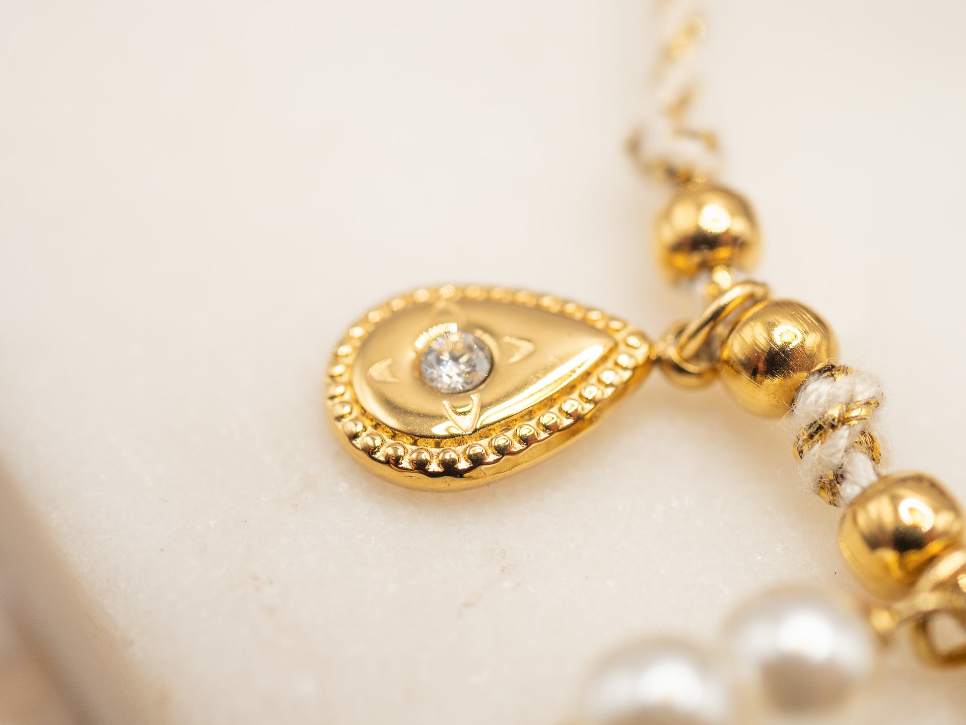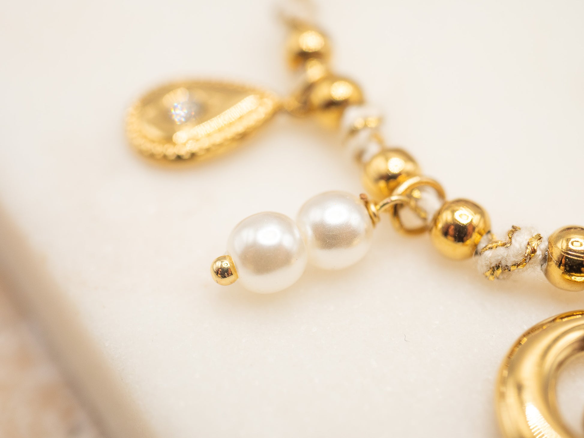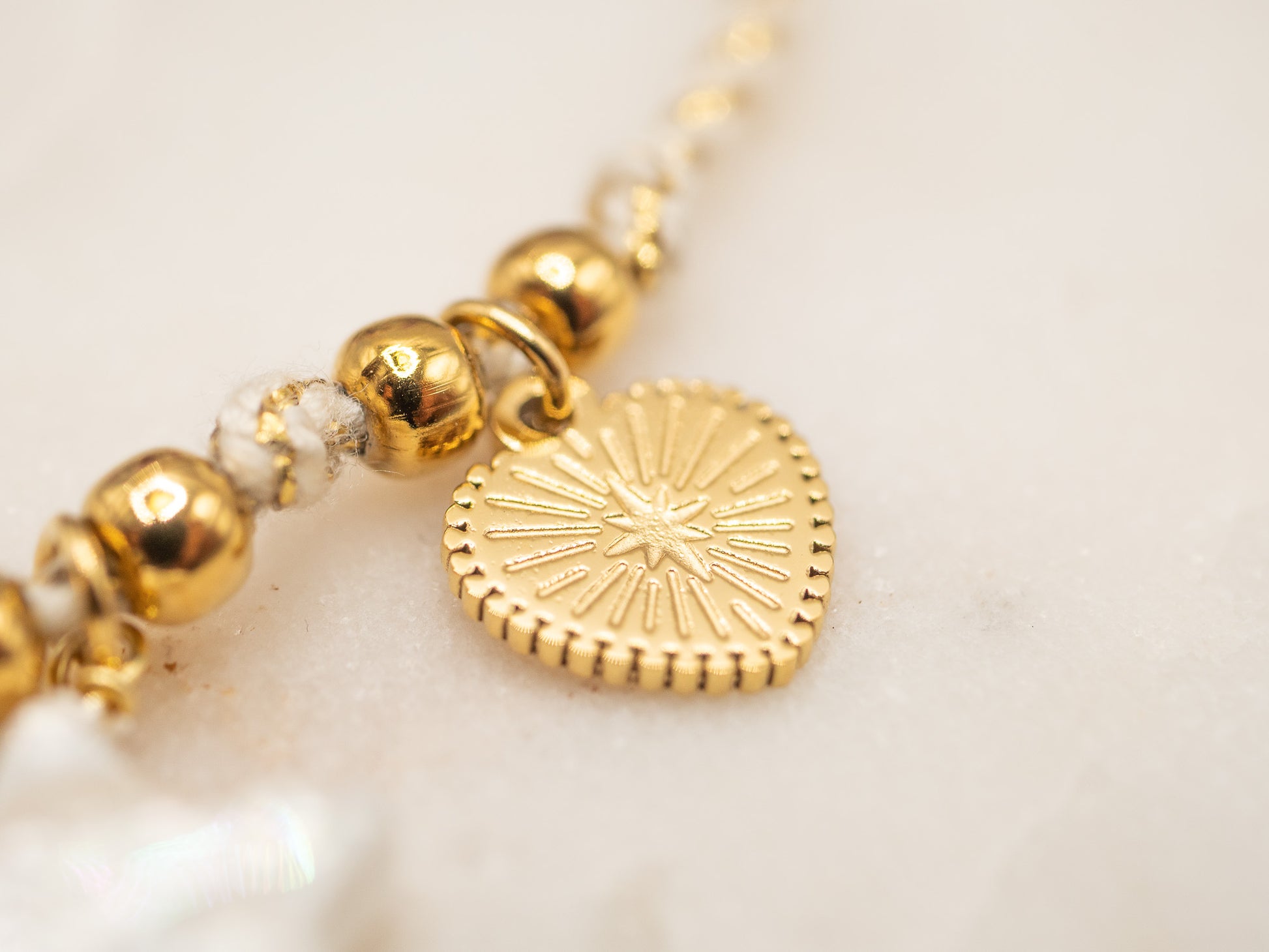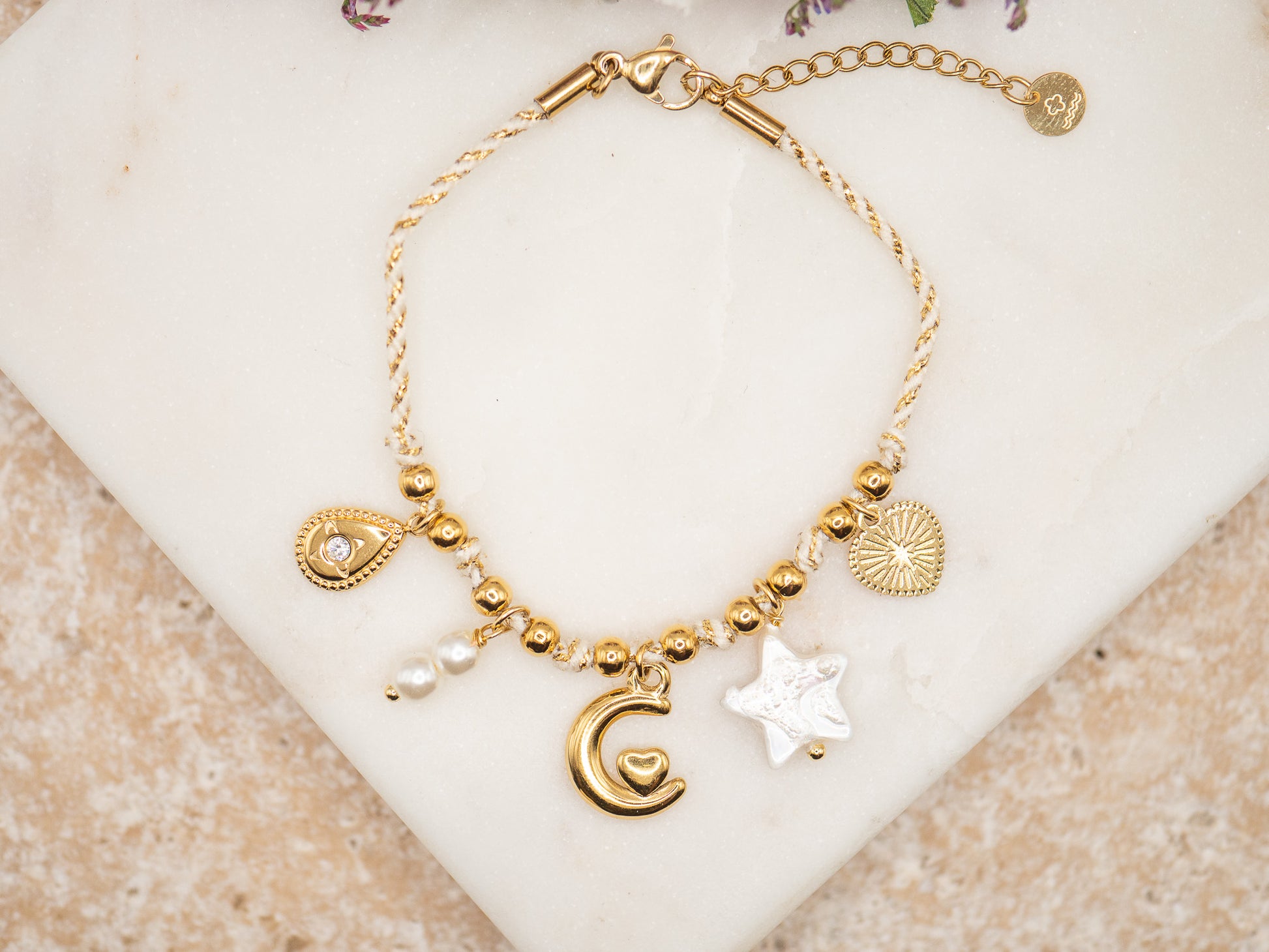 Entre perles nacrées, étoile en nacre blanche (1,1 cm x 1,1 cm), croissant de lune (0,9 cm x 1 cm), goutte dorée sertie d’un zircon transparent (0,9 cm x 0,6 cm), et médaillon martelé en forme de cœur solaire (0,9 cm de diamètre), chaque détail évoque la liberté, le glamour et la féminité insouciante de cette époque culte. Le bracelet mesure environ 18 cm (ajustable grâce à sa chaîne coulissante).