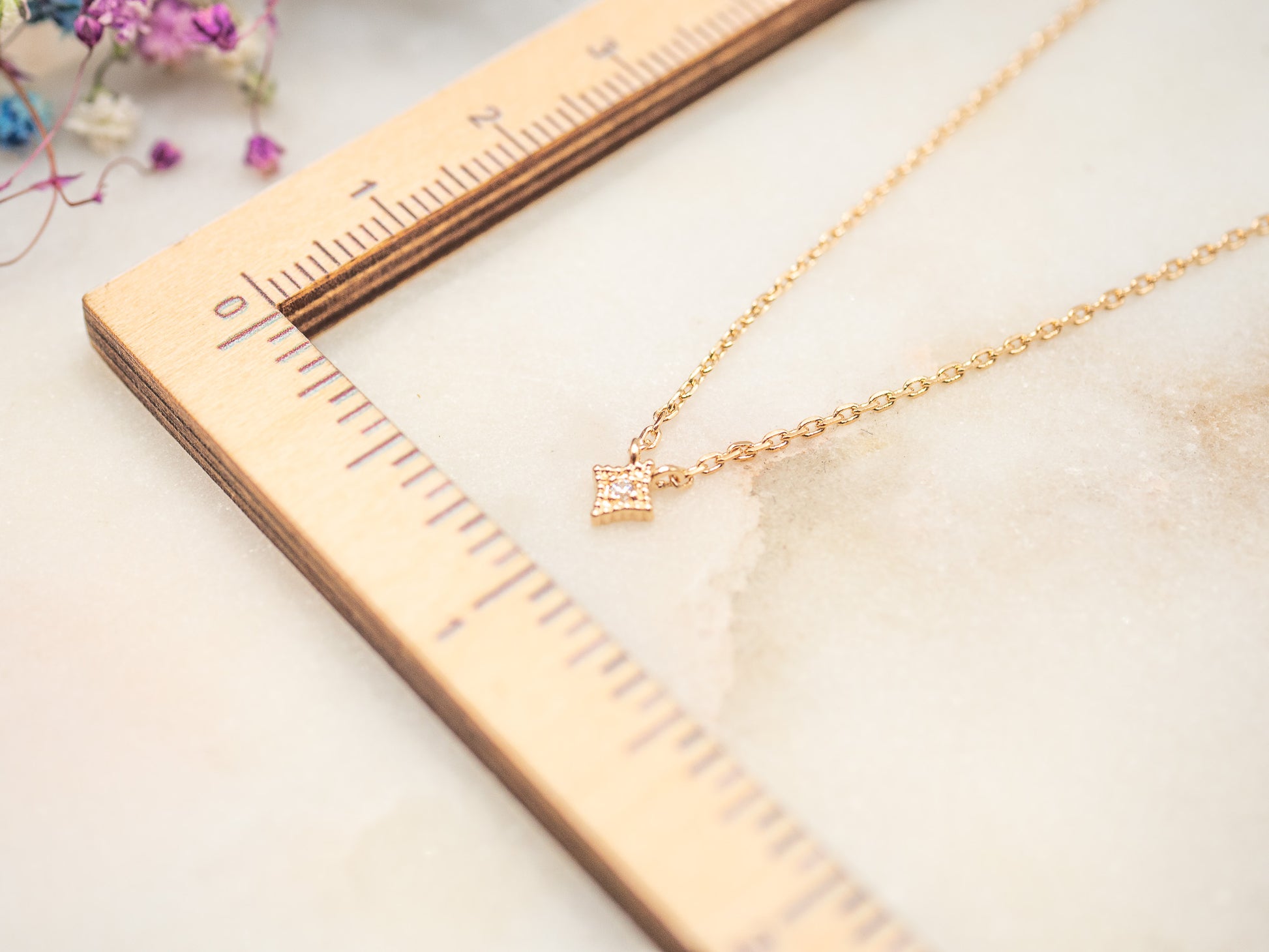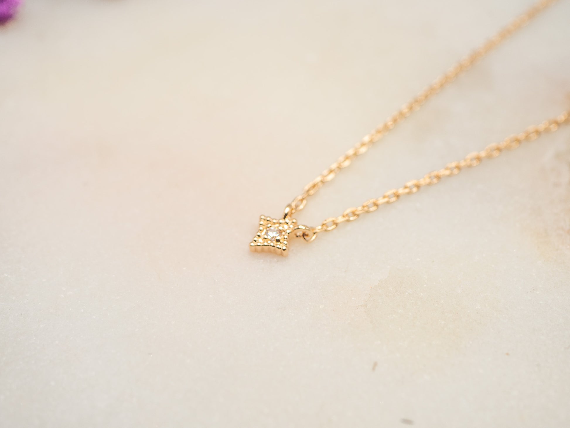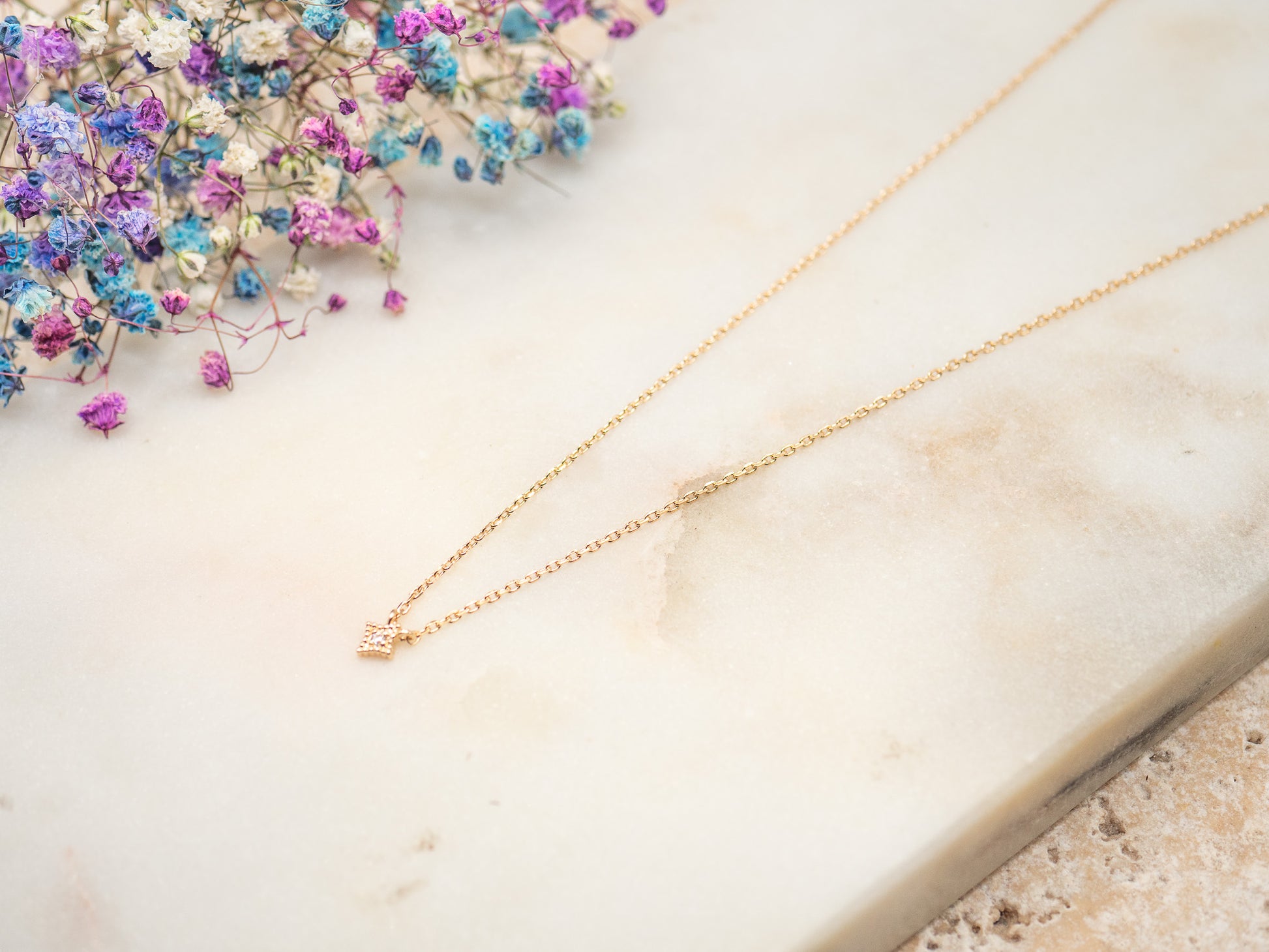 Minimaliste mais plein de charme, le collier Queen’s Whisper se distingue par son petit pendentif carré pavé de zircons, évoquant une étoile scintillante ou un flocon de givre stylisé. Suspendu à une fine chaîne dorée, il illumine le décolleté avec discrétion et sophistication.