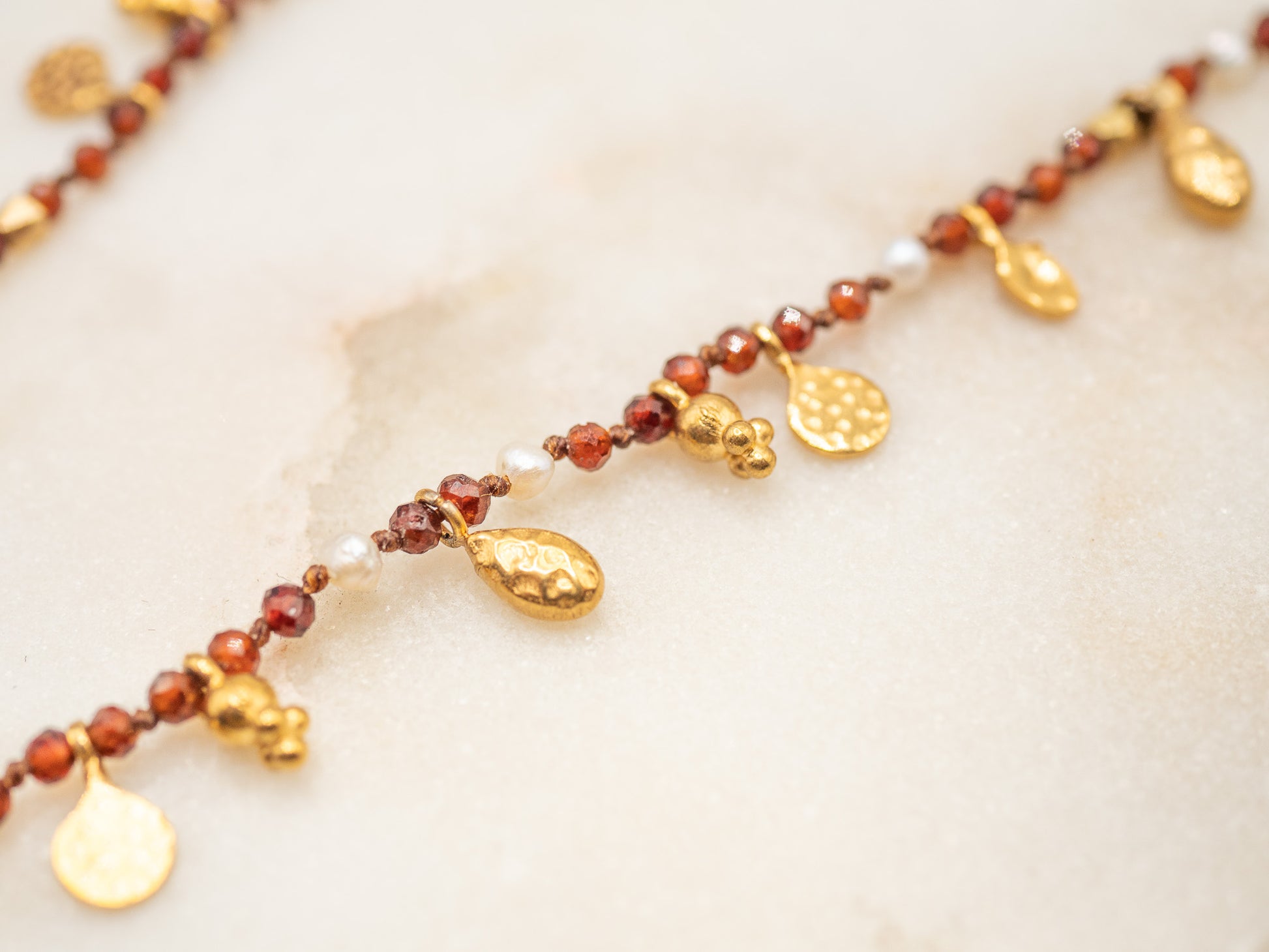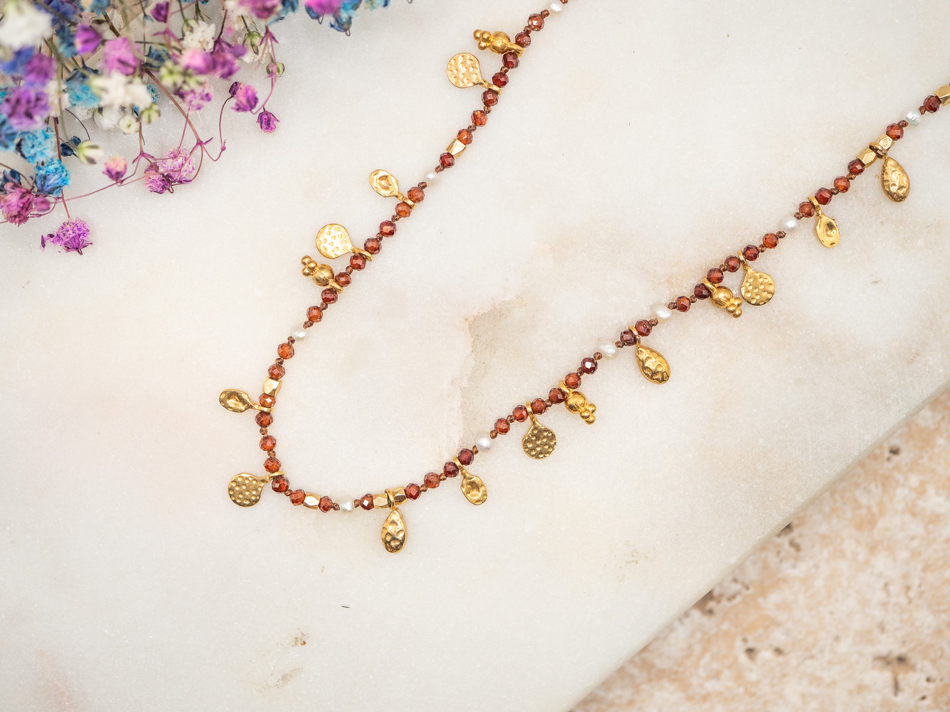 Avec ses nuances chaleureuses et son éclat festif, Annie est un collier qui évoque l’ambiance feutrée d’un salon anglais à Noël, empli des senteurs de vin chaud aux épices. Il est composé d’un délicat fil de perles facettées dans des tons rouges profonds rappelant le grenat, ponctué de mini perles nacrées et de breloques dorées texturées en plaqué or 18 carats, qui dansent autour du cou comme des gouttes de lumière.