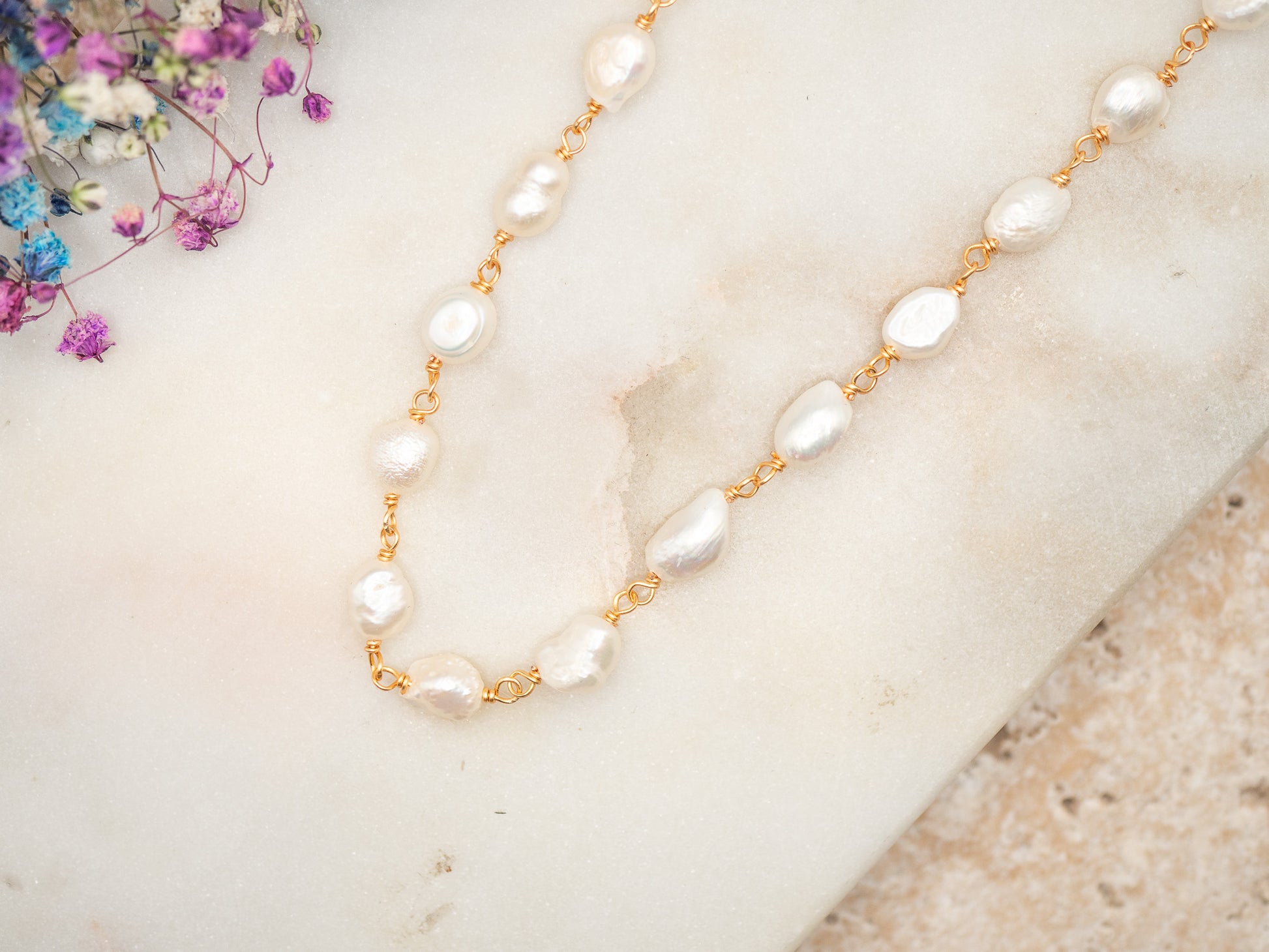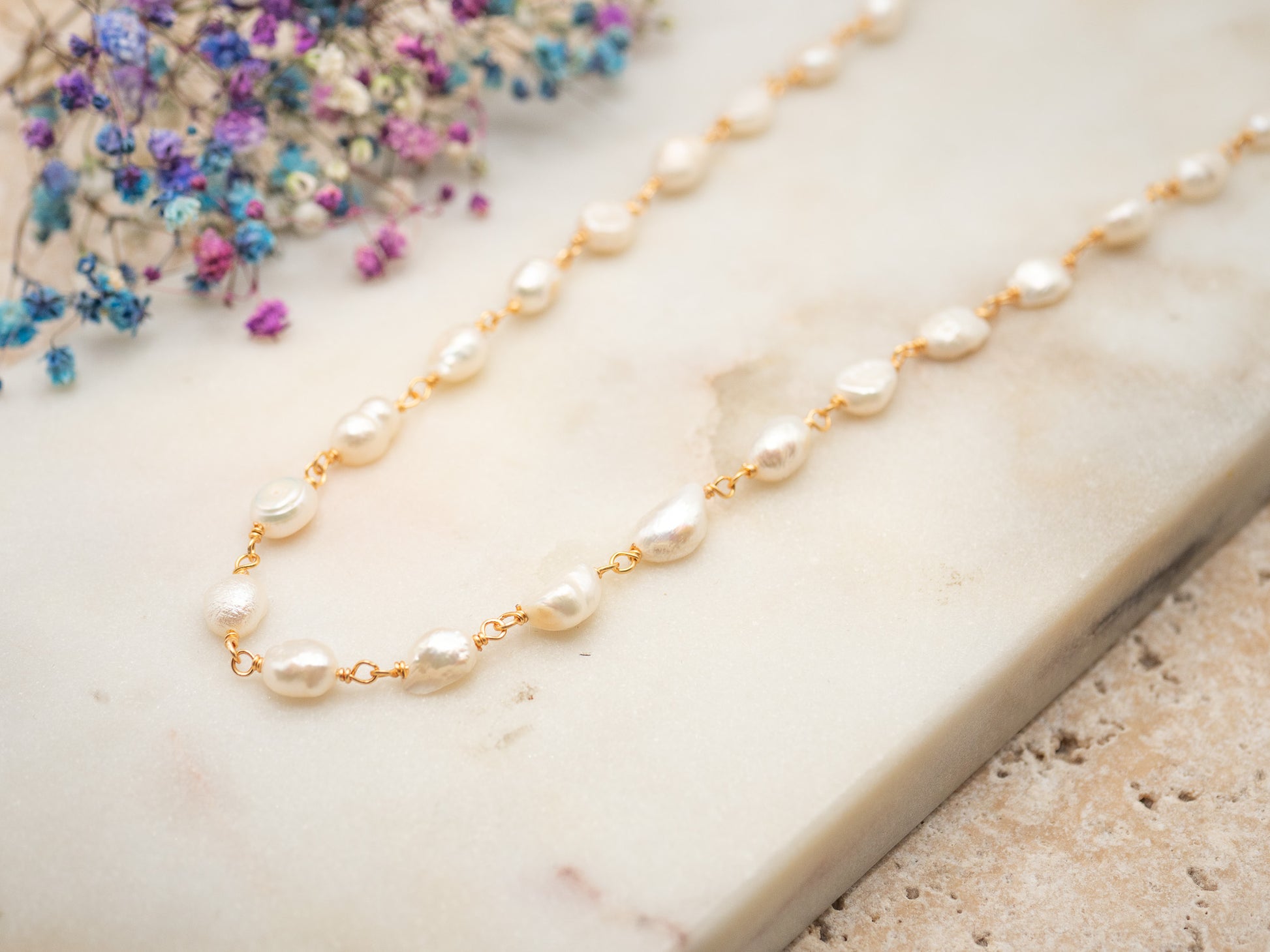 Élégance intemporelle et charme royal se rencontrent dans le collier Avery. Composé de véritables perles d’eau douce reliées par des maillons fins en plaqué or 18 carats, ce bijou évoque les réceptions feutrées dans un manoir anglais sous la neige.