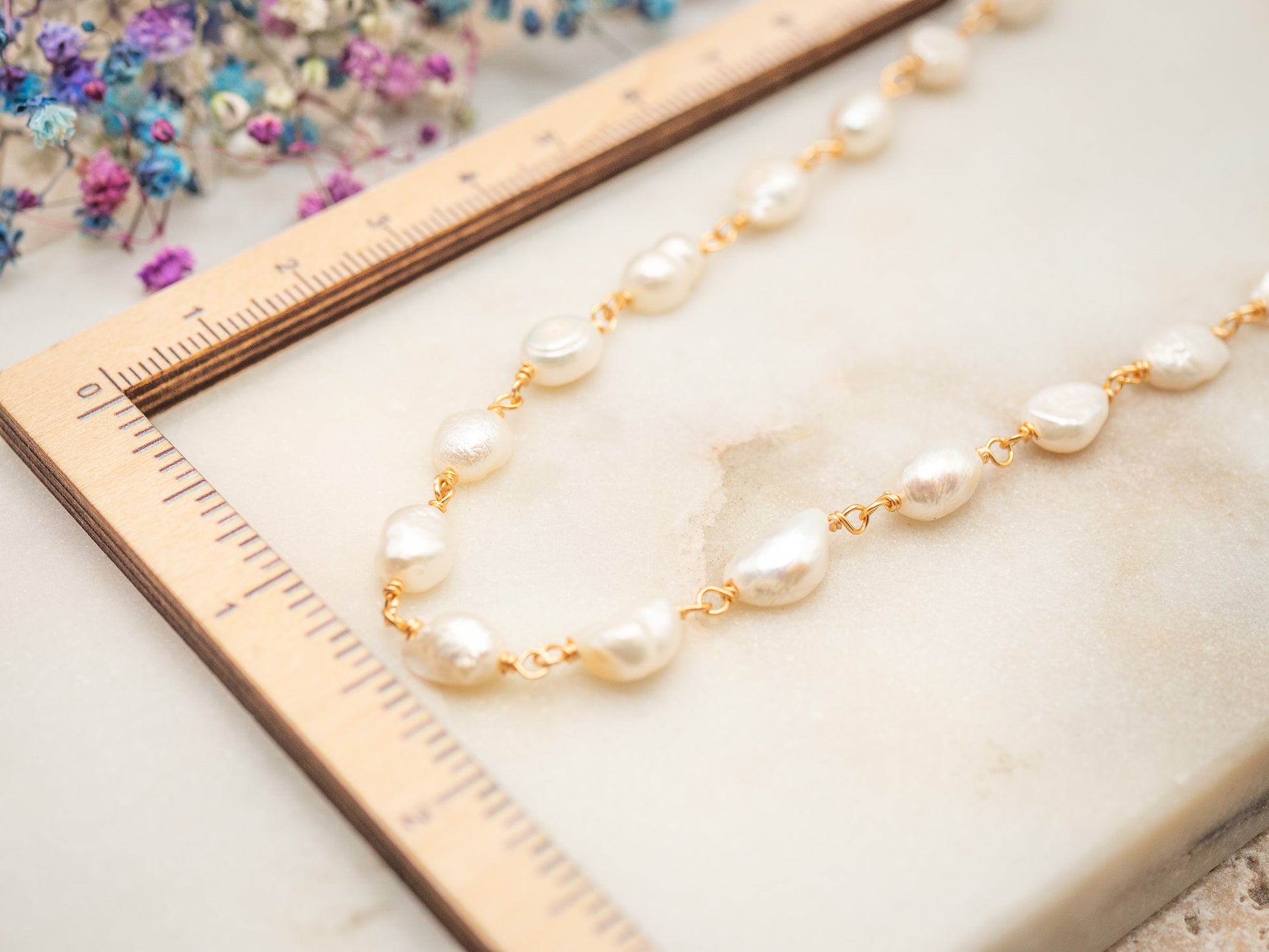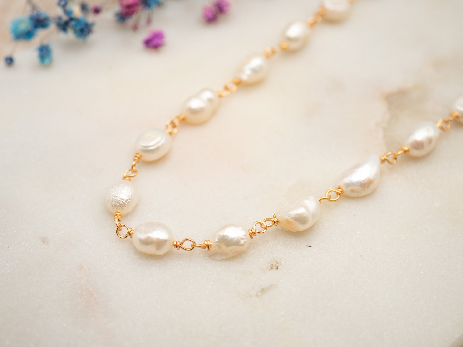 • Perles : Perles d’eau douce naturelles, formes baroques (~7 à 12 mm)