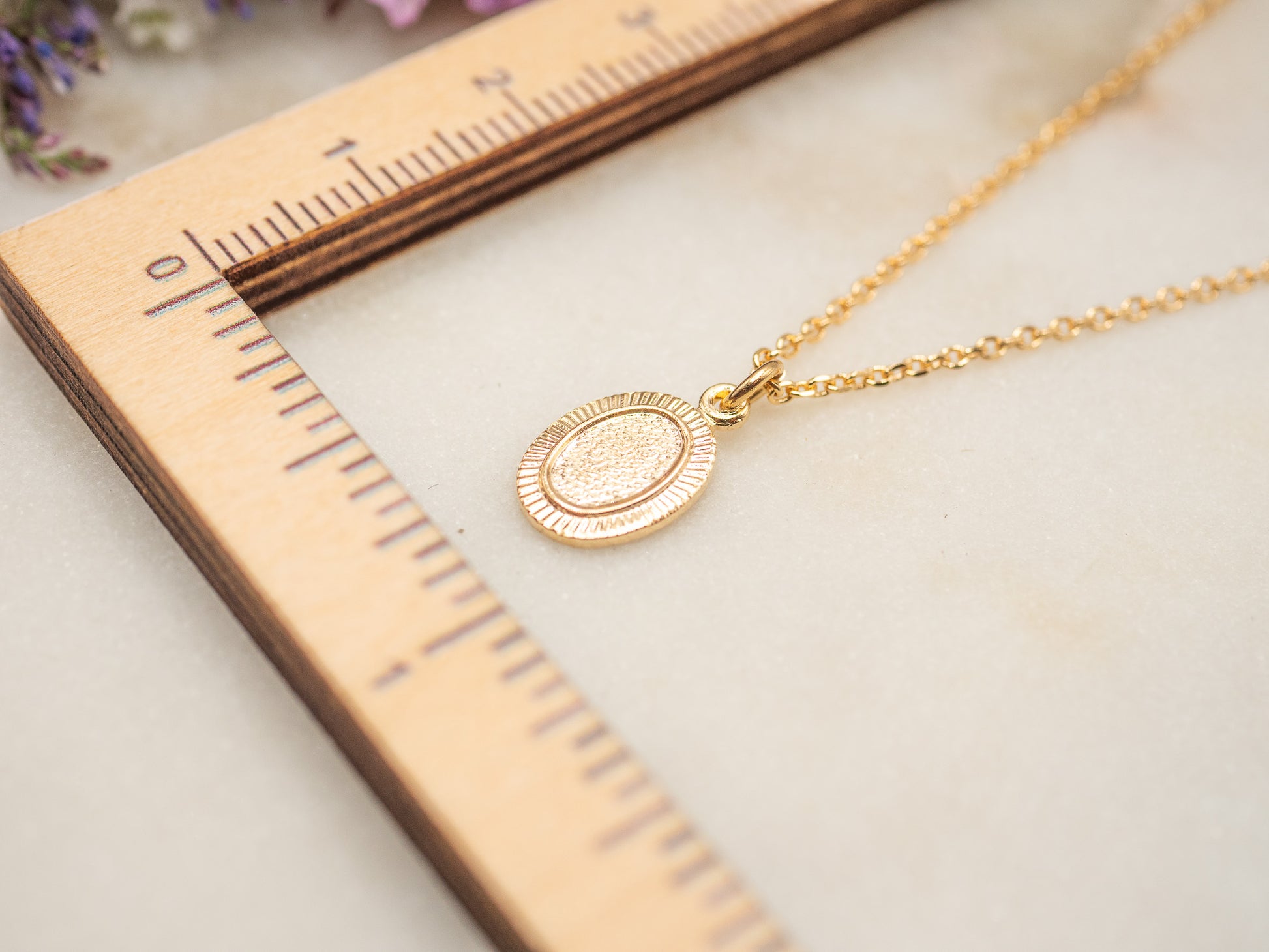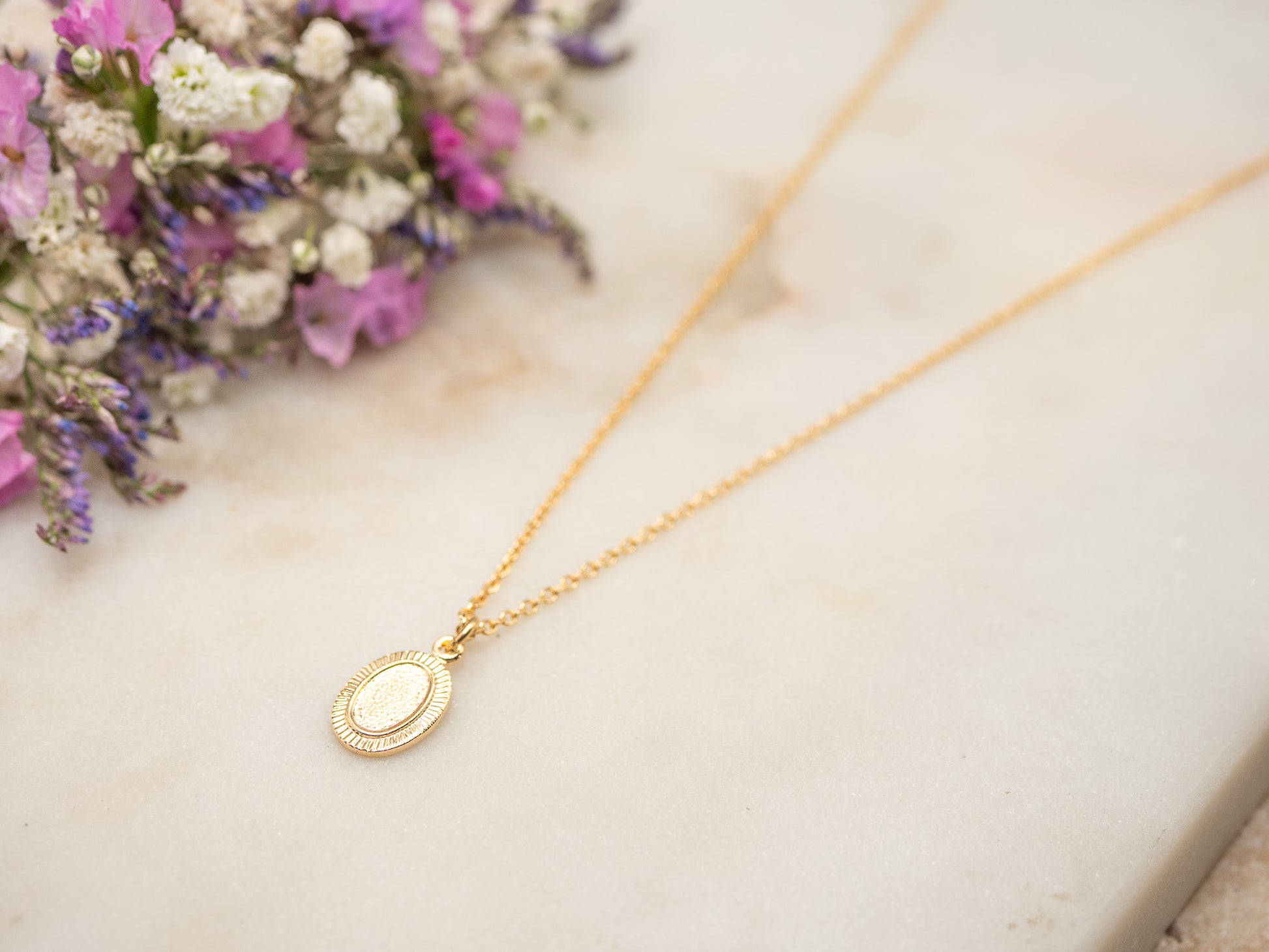 Le collier Beatrice séduit par son charme intemporel, à la croisée du style vintage londonien et de la finesse contemporaine. Son pendentif ovale (1,5 cm × 1,1 cm), travaillé en plaqué or 18 carats, présente un relief délicat entouré d’un contour finement ciselé qui capte la lumière avec élégance.
