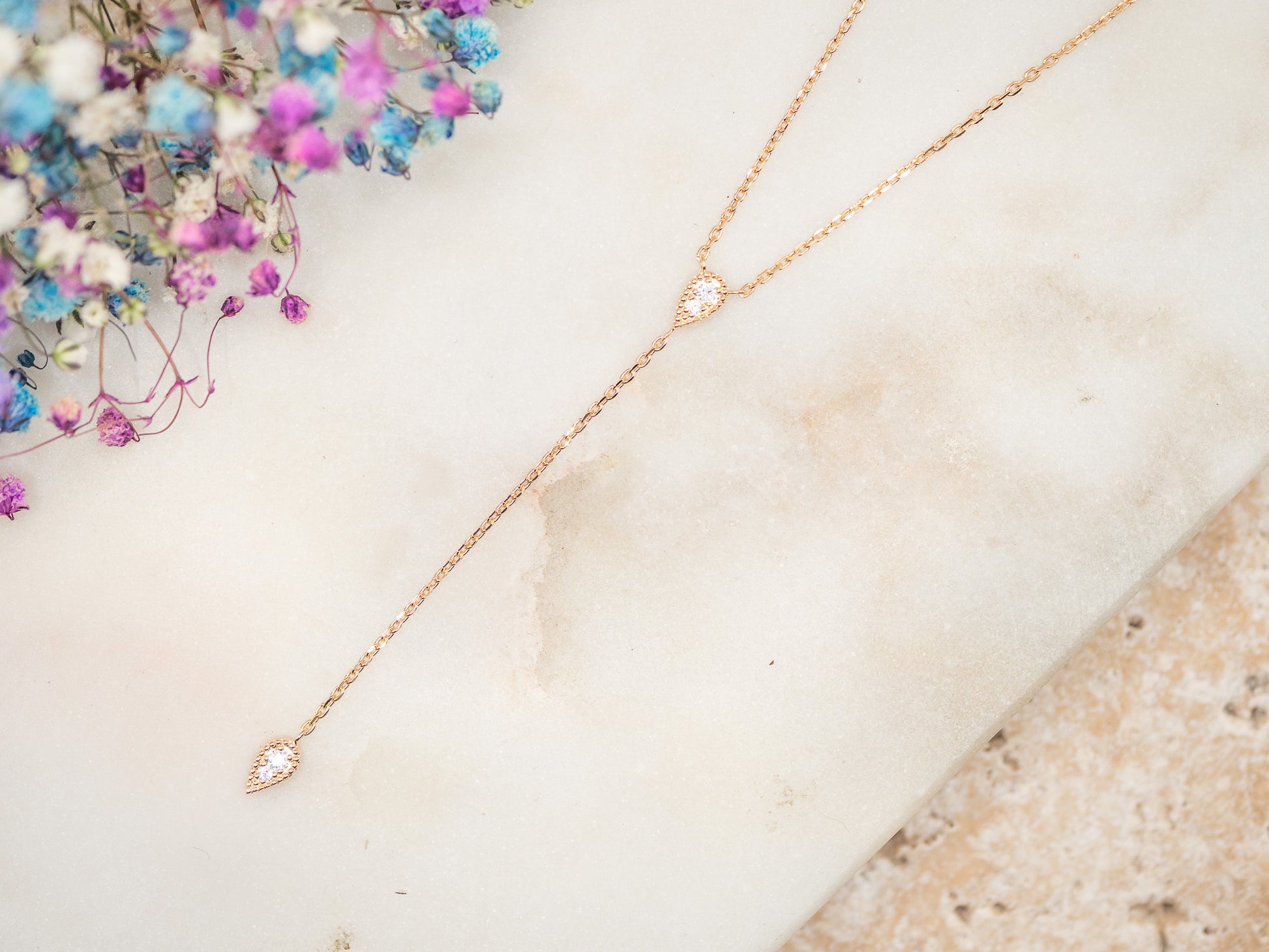 Charlie est un collier en Y aussi délicat que la première goutte de givre sur une vitre par un matin d’hiver. Sa forme élancée sublime le décolleté avec une touche de finesse et de lumière, grâce à ses deux pampilles en forme de gouttes serties de petits zircons scintillants. Une pièce subtile, féminine et élégante, idéale pour les fêtes de fin d’année ou les moments précieux.