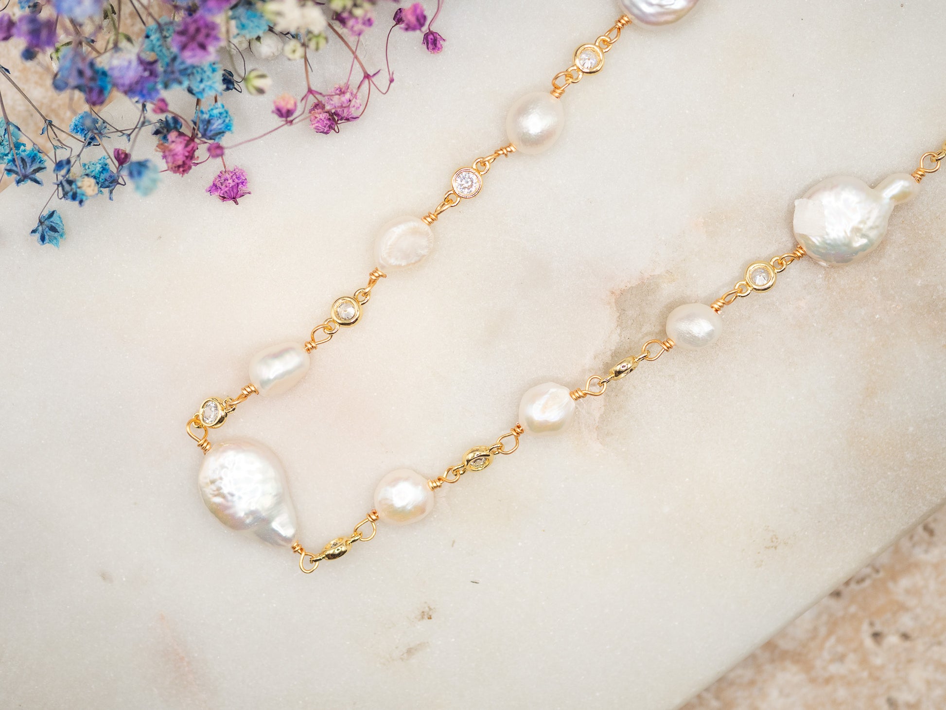 Le collier Cheryl est une ode à la délicatesse et au raffinement à l’anglaise. Sa composition mêle des perles d’eau douce naturelles aux formes irrégulières à de fins maillons dorés, ponctués de petits zirconiums éclatants.
