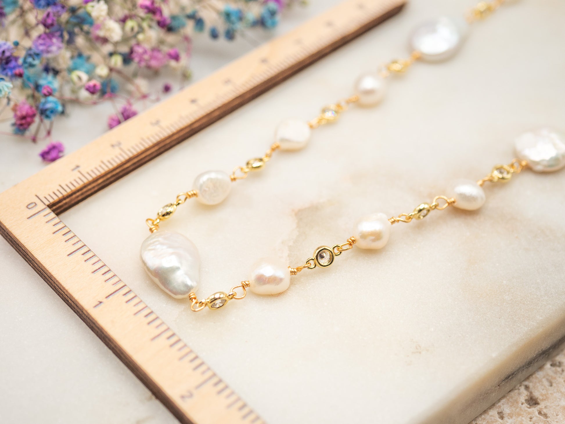 • Perles : Perles d’eau douce naturelles (~7–13 mm), formes baroques et rondes