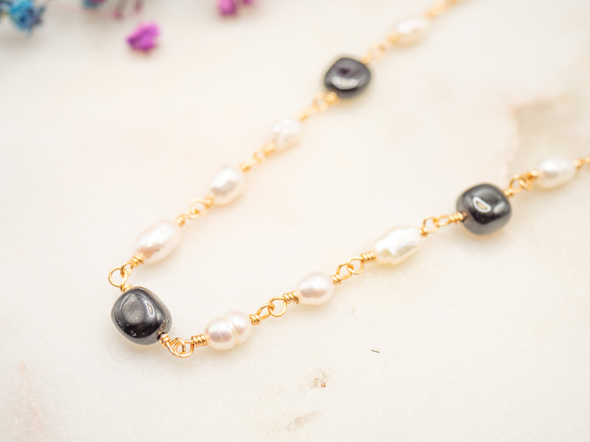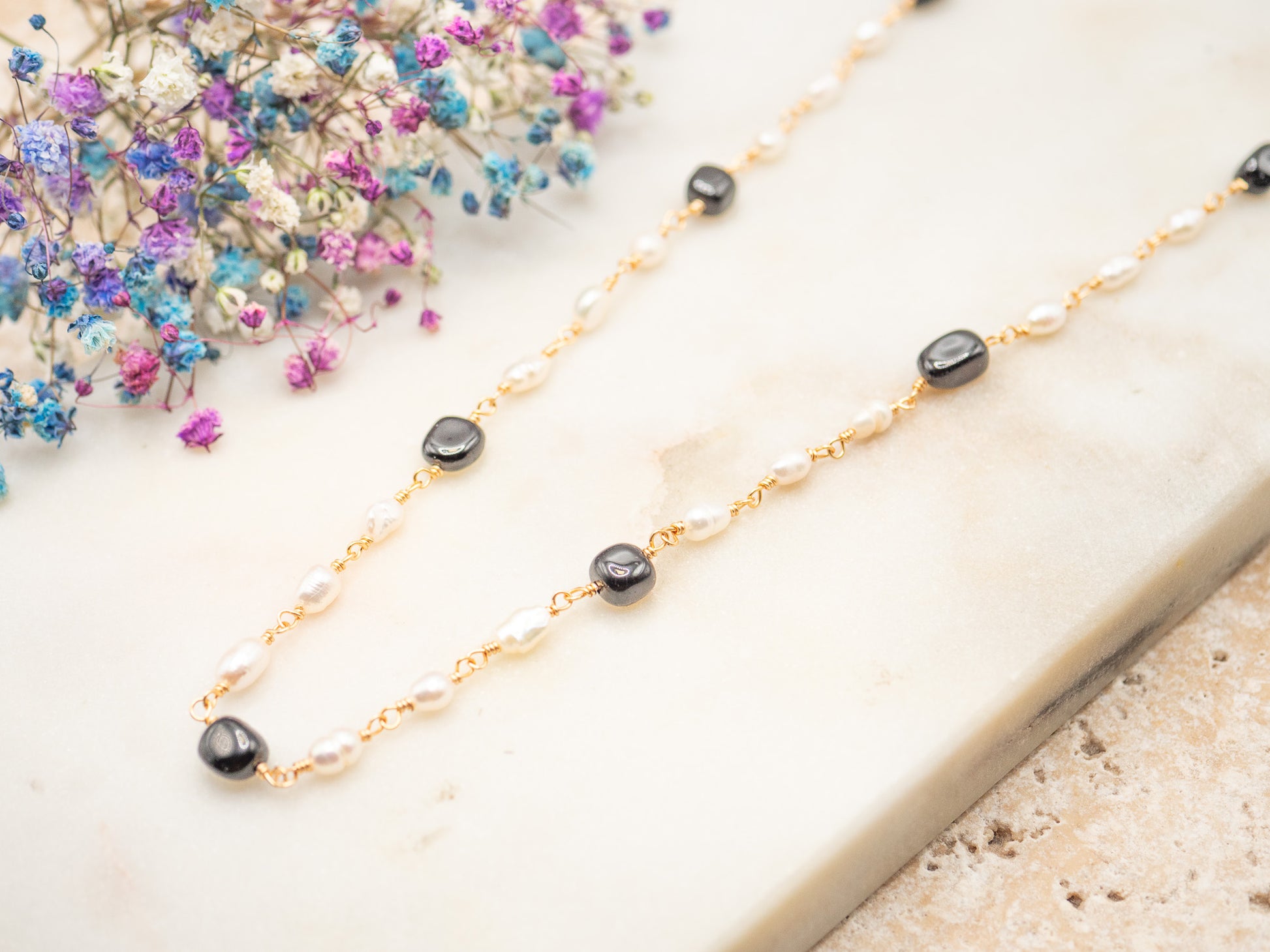 Les perles sont délicatement montées à la main sur une chaîne en plaqué or 18 carats, avec des irrégularités assumées qui soulignent la beauté naturelle de chaque élément. Chaque perle noire semble capturer une étoile dans sa brillance subtile, contrastant avec la douceur crémeuse des perles blanches.