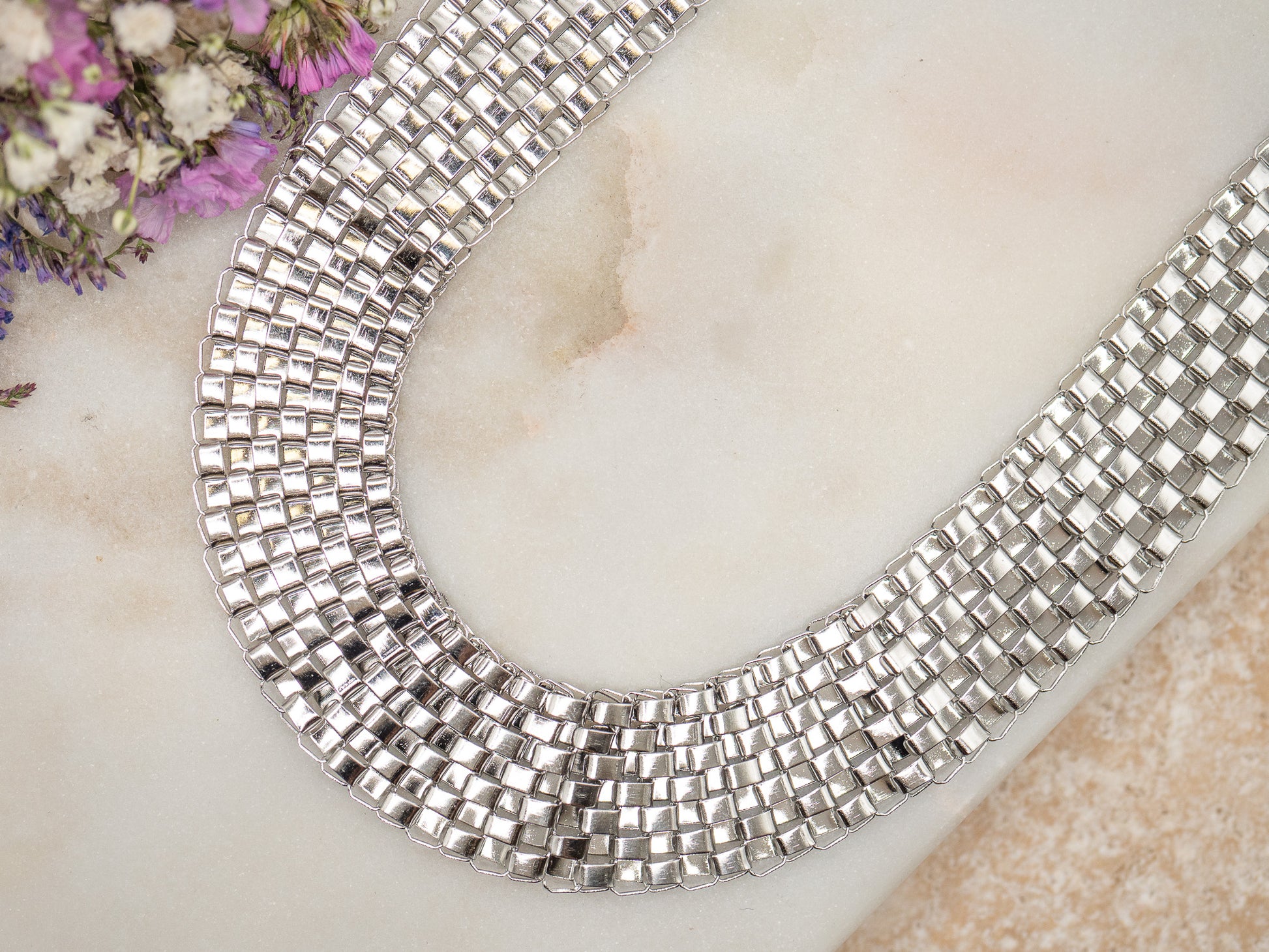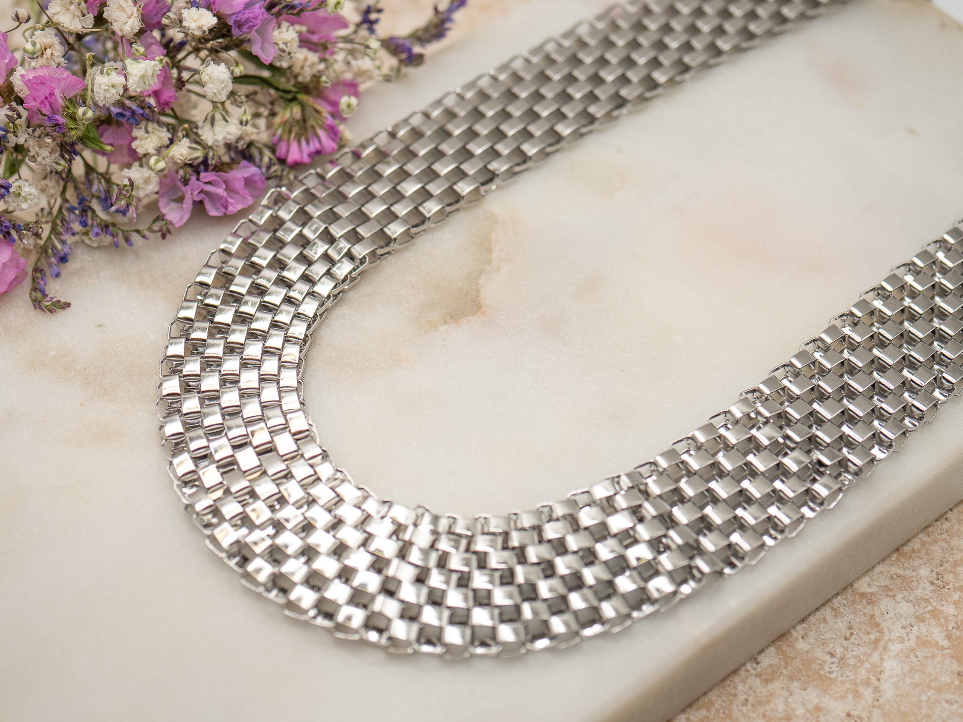 Son maillage tressé en acier inoxydable argenté épouse le cou avec souplesse tout en affichant une présence forte et sculpturale. Large de 3,5 cm et ajustable pour s’adapter parfaitement à votre encolure, il joue avec la lumière et capte tous les regards.