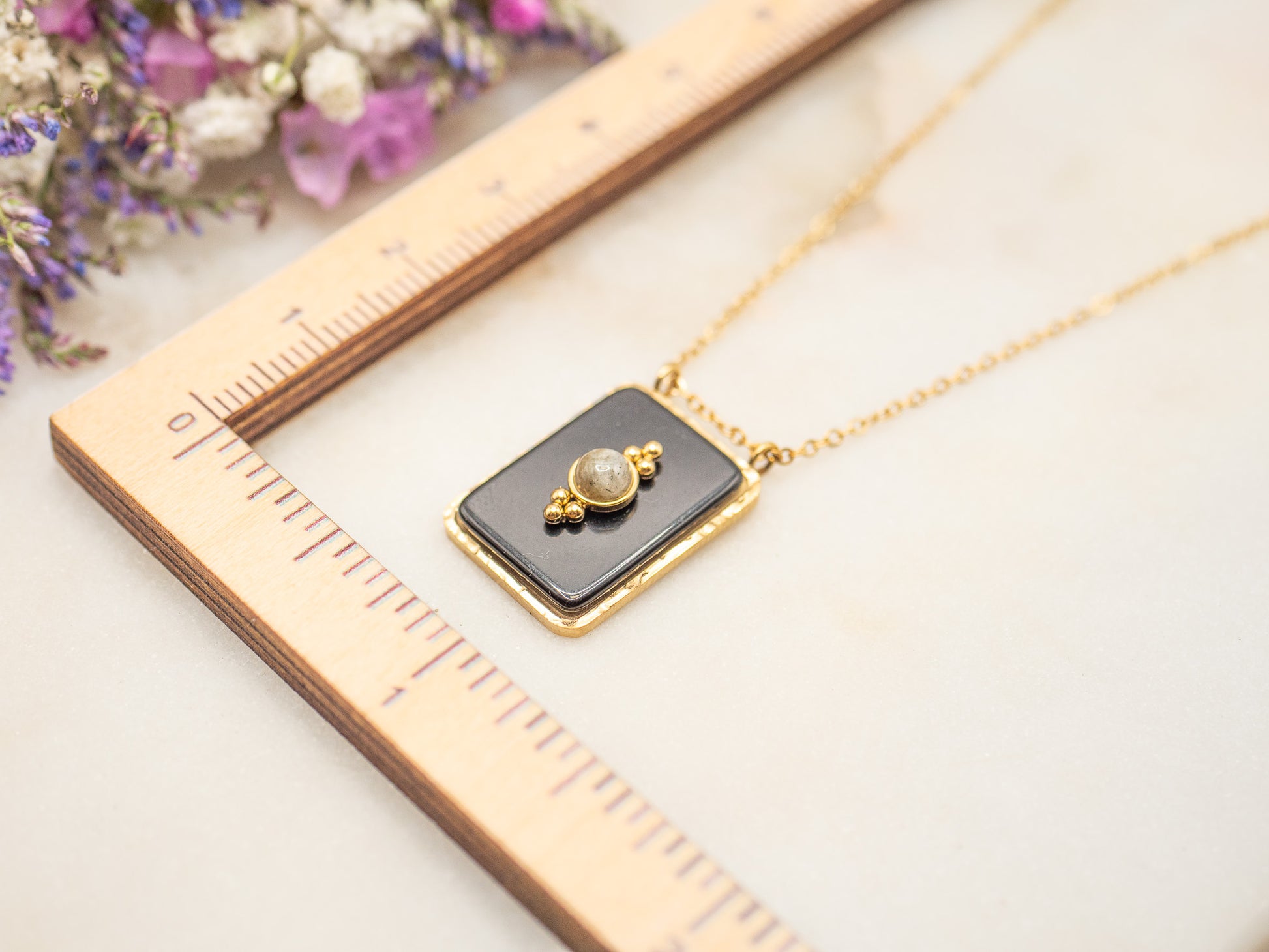 Épuré et audacieux, le collier Daphne capture l’esprit graphique et avant-gardiste du Londres des seventies. Son pendentif rectangulaire (2,5 cm × 1,6 cm) se compose d’une plaque en onyx noir sertie sur un contour en acier inoxydable. En son centre, une perle grise nacrée de 1 cm apporte une touche subtile de lumière, renforcée par deux petites perles dorées qui l’encadrent comme des accents précieux.