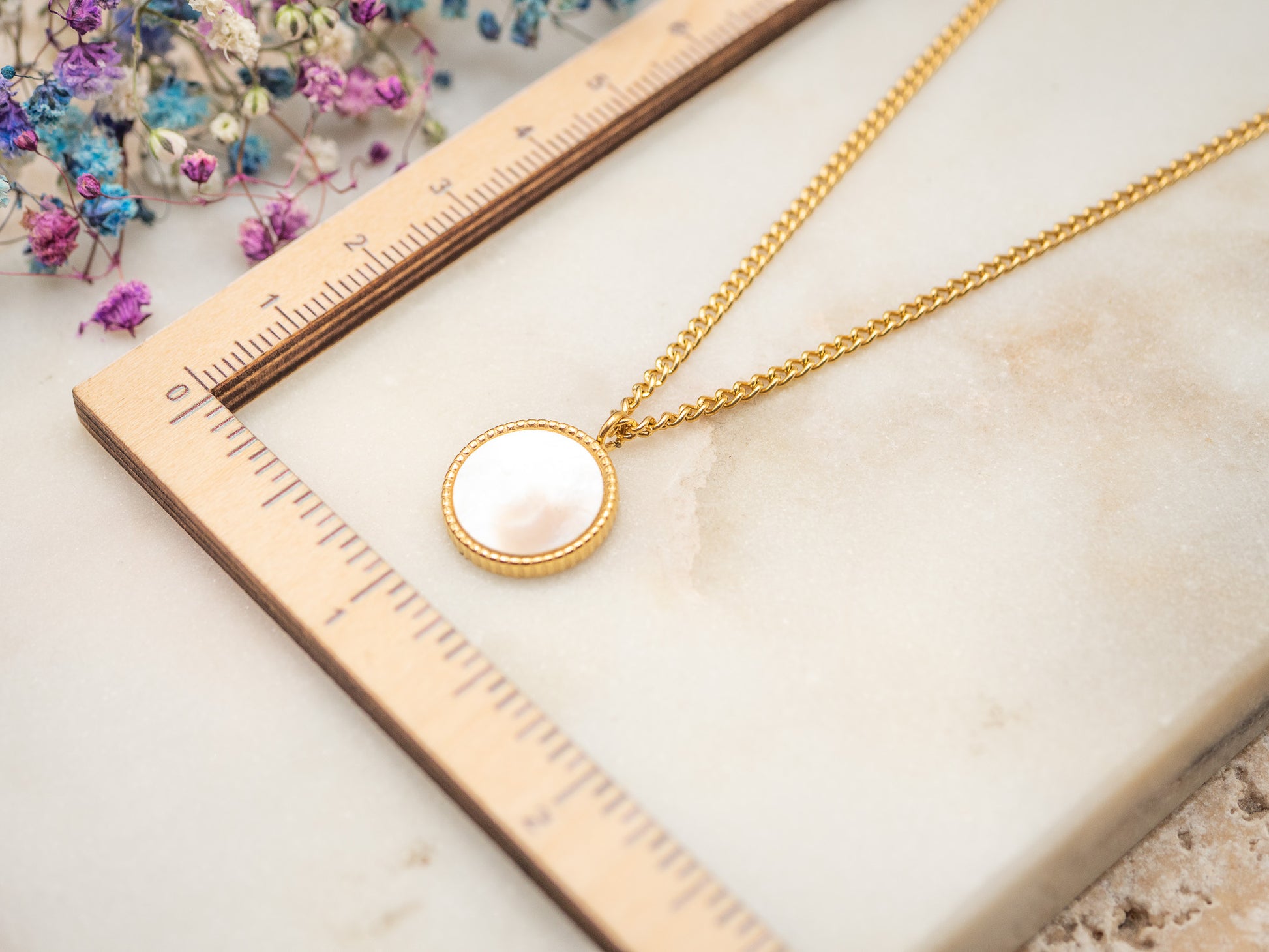 Élégant et délicieusement rétro, Moonlight Pudding est un collier qui évoque le raffinement des traditions anglaises de Noël, entre argenterie brillante et douceur nacrée. Son médaillon rond en nacre naturelle est bordé d’une monture finement perlée en acier inoxydable, qui lui donne l’allure d’un trésor ancien transmis de génération en génération.
