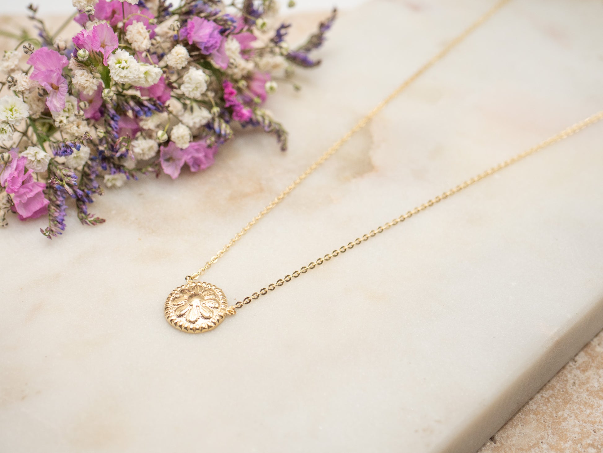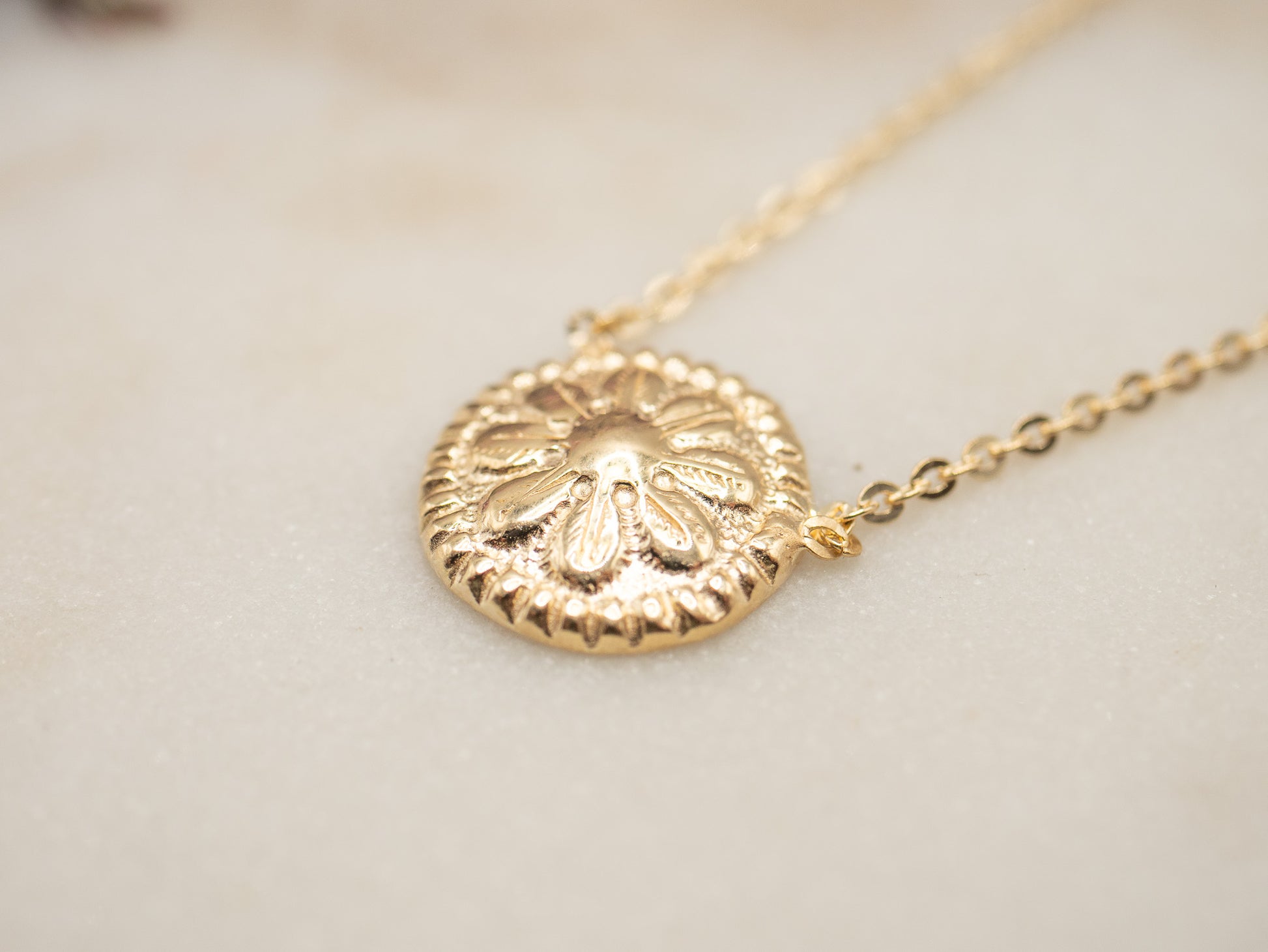 Le collier Dorothy est une pièce lumineuse et raffinée, dont le pendentif rond (1,5 cm de diamètre) en plaqué or 18 carats présente un motif en relief délicatement ciselé, évoquant une fleur solaire ou un médaillon ancien revisité.