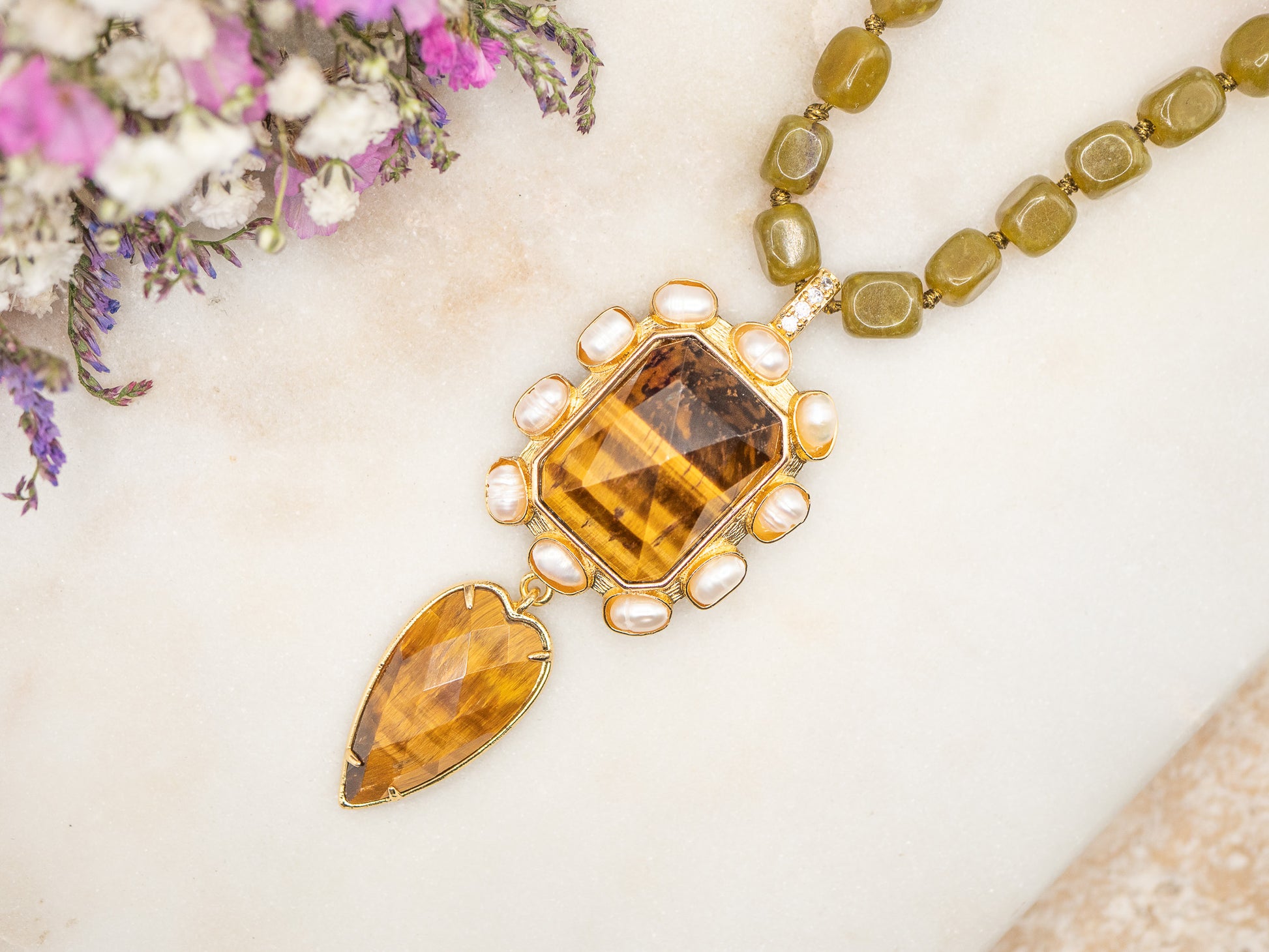 • Pierres semi-précieuses : œil de tigre & perles baroque