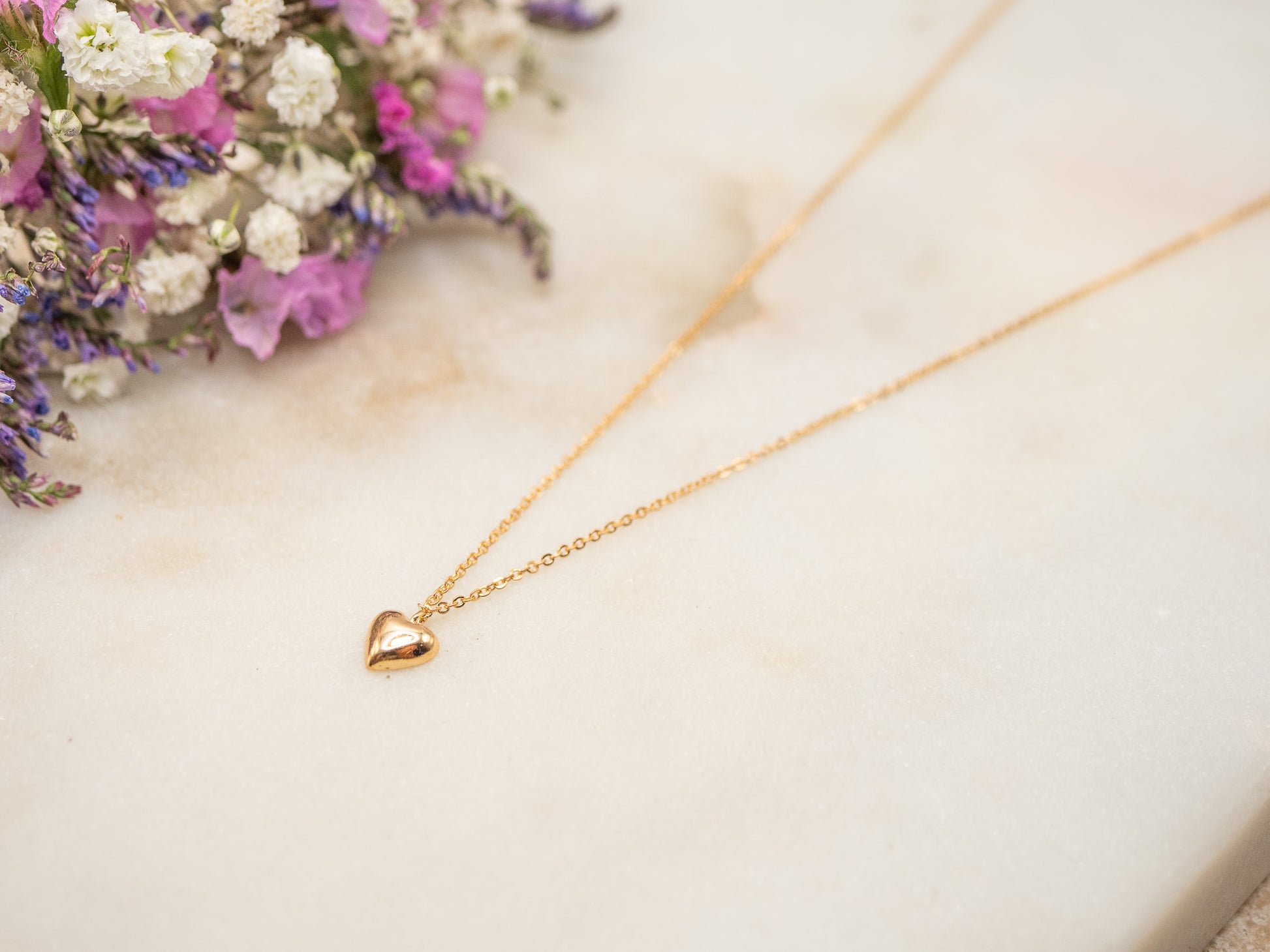Le collier Emma est la quintessence de la délicatesse : un petit pendentif en forme de cœur (0,9 cm × 0,8 cm), finement travaillé en plaqué or 18 carats. Minimaliste et intemporel, il capte la lumière avec douceur et se pose sur la peau comme une caresse subtile.