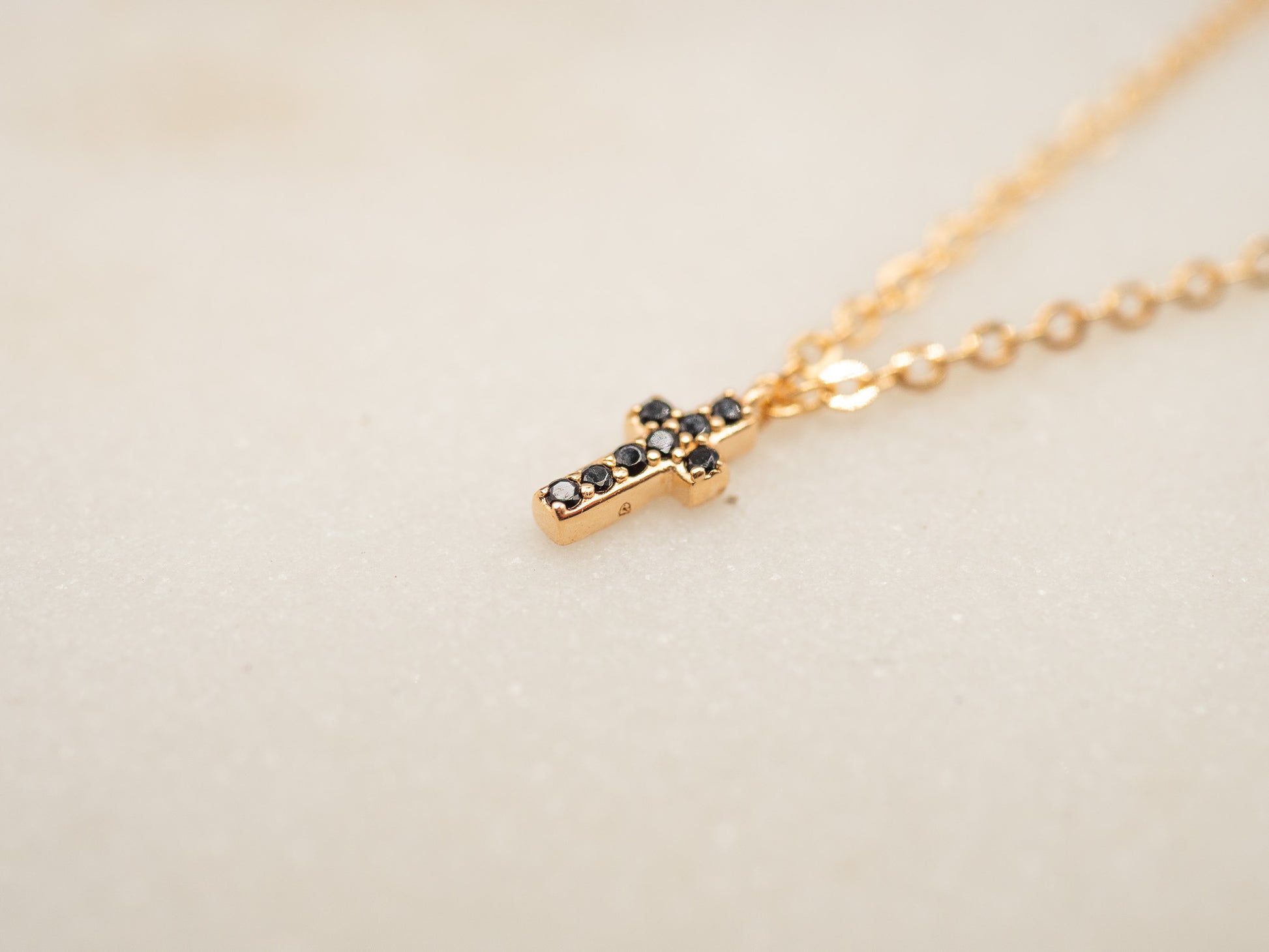 Le collier Esther se distingue par la finesse et la puissance de son symbole : une petite croix (1,2 cm × 0,7 cm) en plaqué or 18 carats, délicatement sertie de minuscules pierres d’onyx noir (environ 0,1 cm chacune).