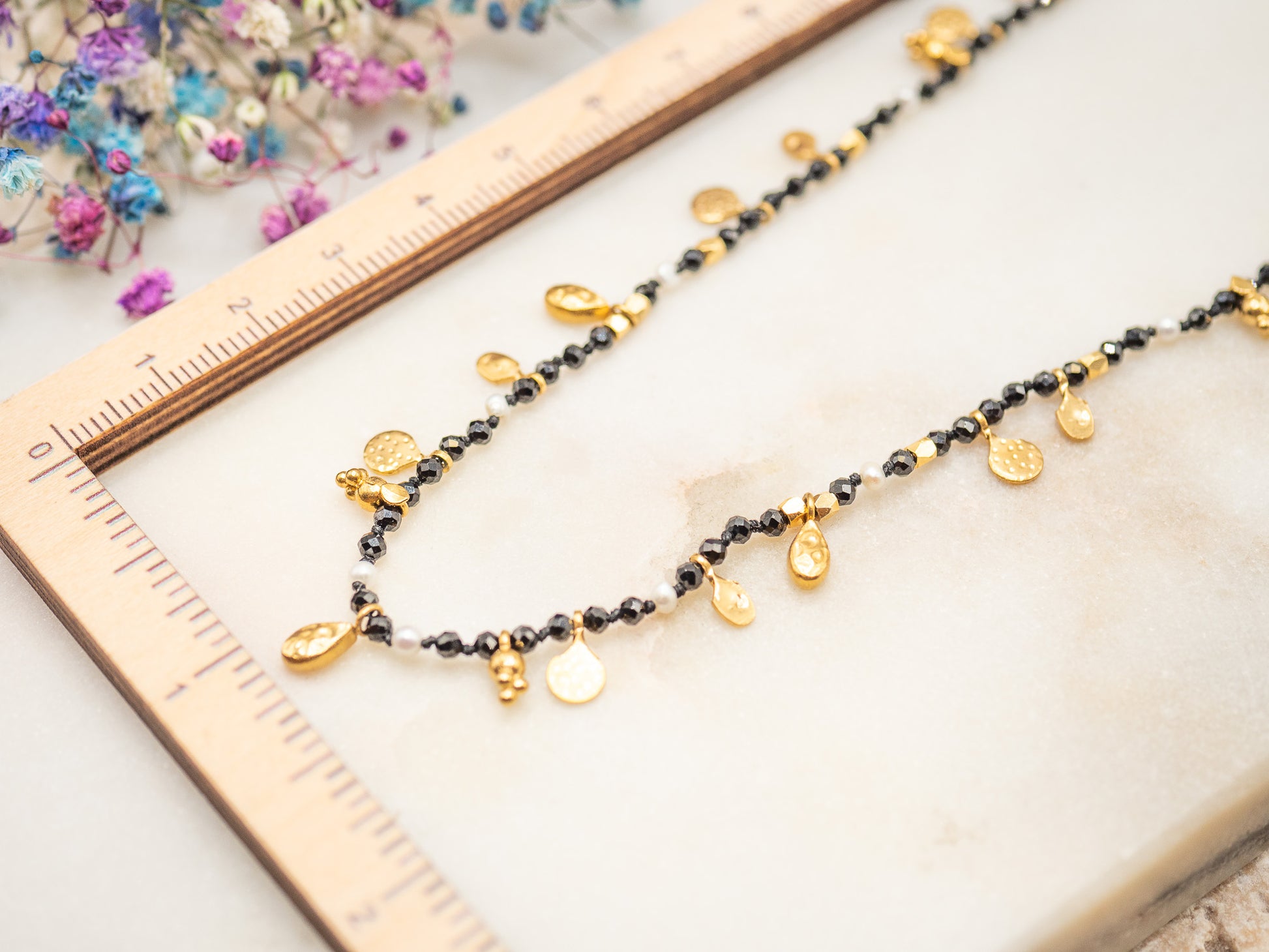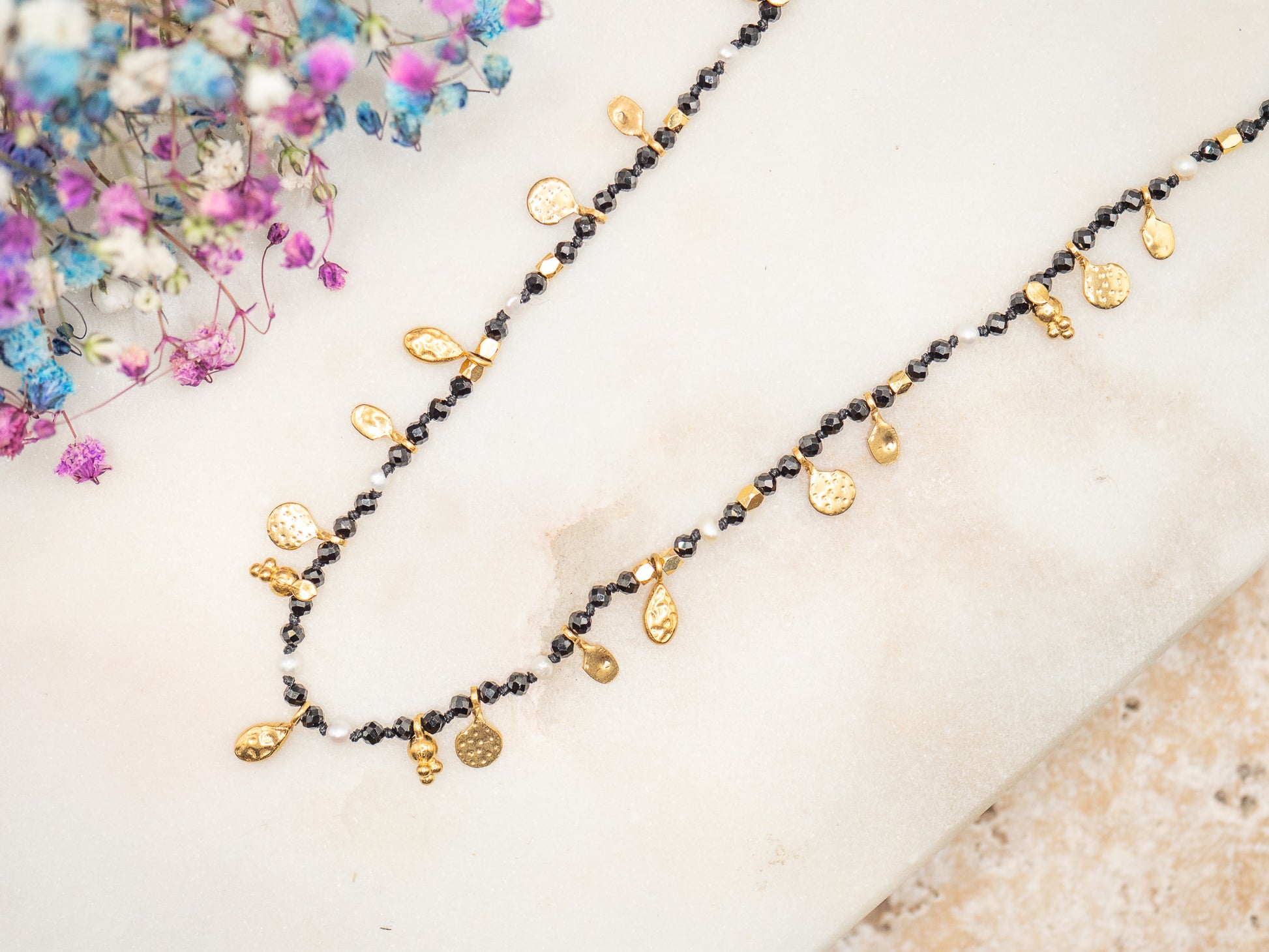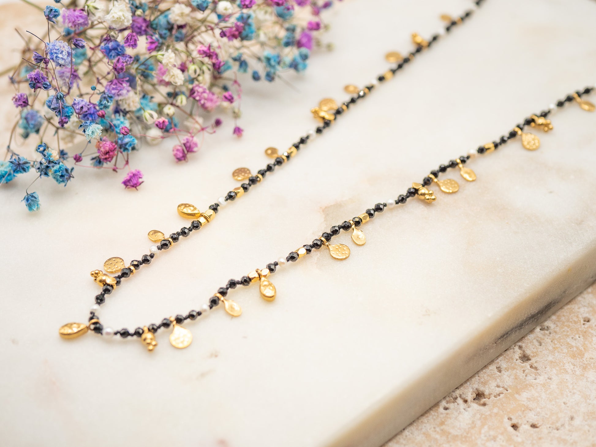 Le collier Everleigh s’inspire des longues soirées hivernales au coin du feu, où l’on savoure un vin chaud aux mûres et aux épices. Ses perles noires facettées scintillent comme la nuit d’hiver, tandis que les petites touches dorées rappellent les reflets des flammes et les guirlandes lumineuses.