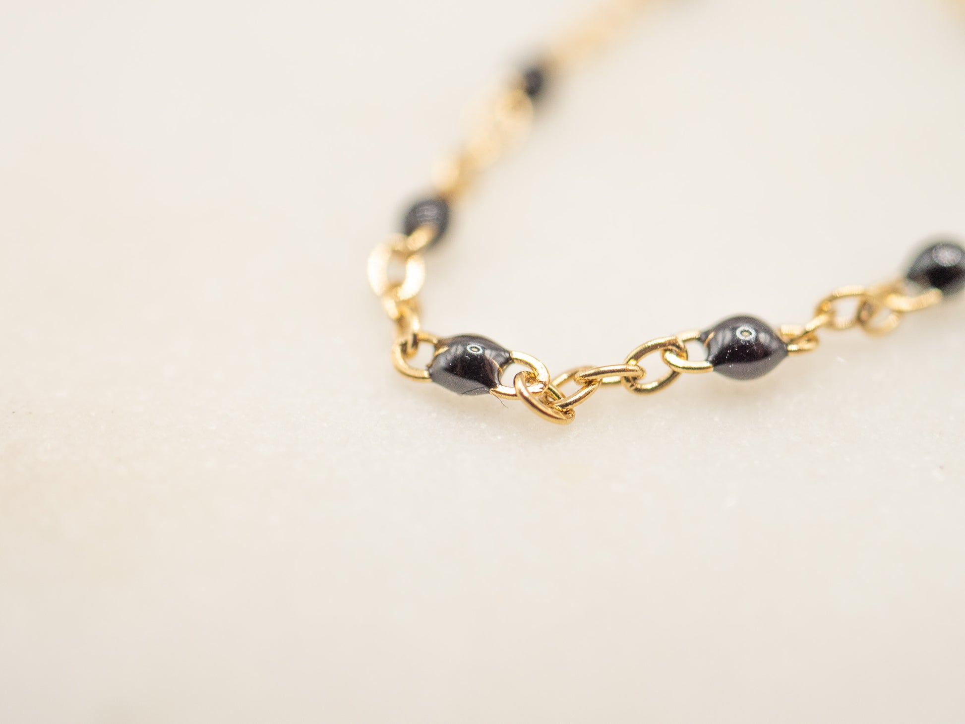 Chic et envoûtant, le collier Faithfull joue avec les contrastes grâce à ses fines chaînes dorées rehaussées de perles noires délicates. Ses rangs multiples créent un effet de cascade élégant qui attire la lumière et habille le décolleté avec caractère. Un bijou à la fois sophistiqué et bohème, qui reflète l’esprit libre et audacieux des sixties londoniennes.