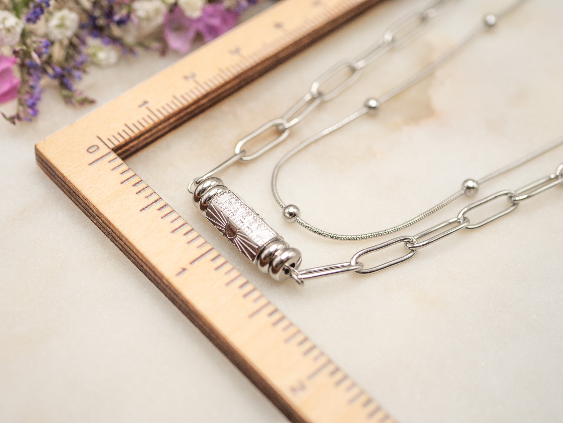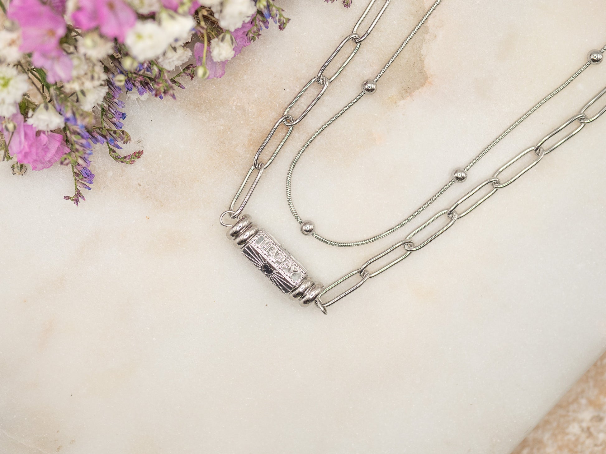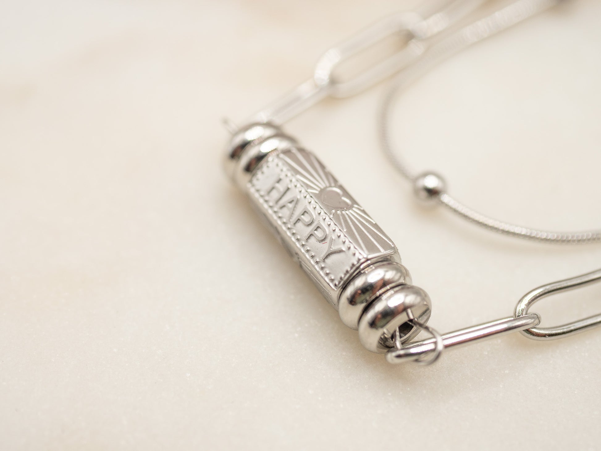 Audacieux et lumineux, Happy est un collier chaine double en acier inoxydable qui insuffle une énergie joyeuse à vos looks. Son pendentif cylindrique gravé du mot Happy, associé à un jeu de chaînes contrastées, l’une fine et perlée, l’autre à larges maillons – lui donne une allure contemporaine et pleine de caractère.