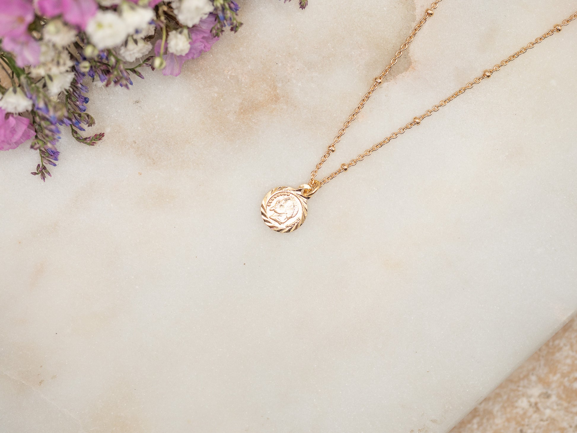 Le collier Helena évoque la noblesse et l’élégance intemporelle des médaillons anciens revisités avec modernité. Son pendentif rond (1,4 cm de diamètre) en plaqué or 18 carats est délicatement gravé d’un profil féminin entouré d’une couronne de laurier, symbole de force et de victoire.