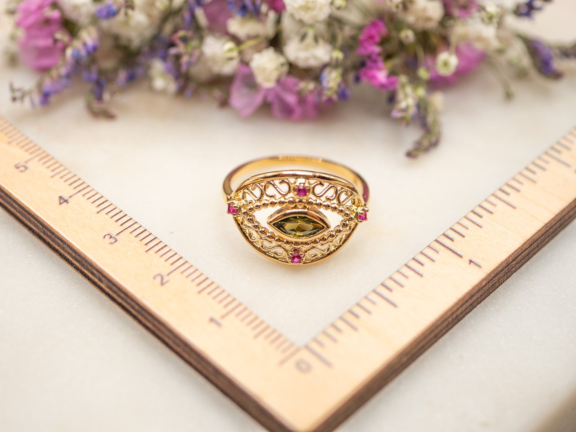 En son centre, un cristal vert taille navette (0,8 × 0,3 cm) capte la lumière avec intensité, entourée de délicates incrustations de cristaux roses (0,2 cm chacune) qui apportent une touche de douceur et d’éclat. Les détails ciselés du motif donnent à cette bague une allure précieuse et unique.