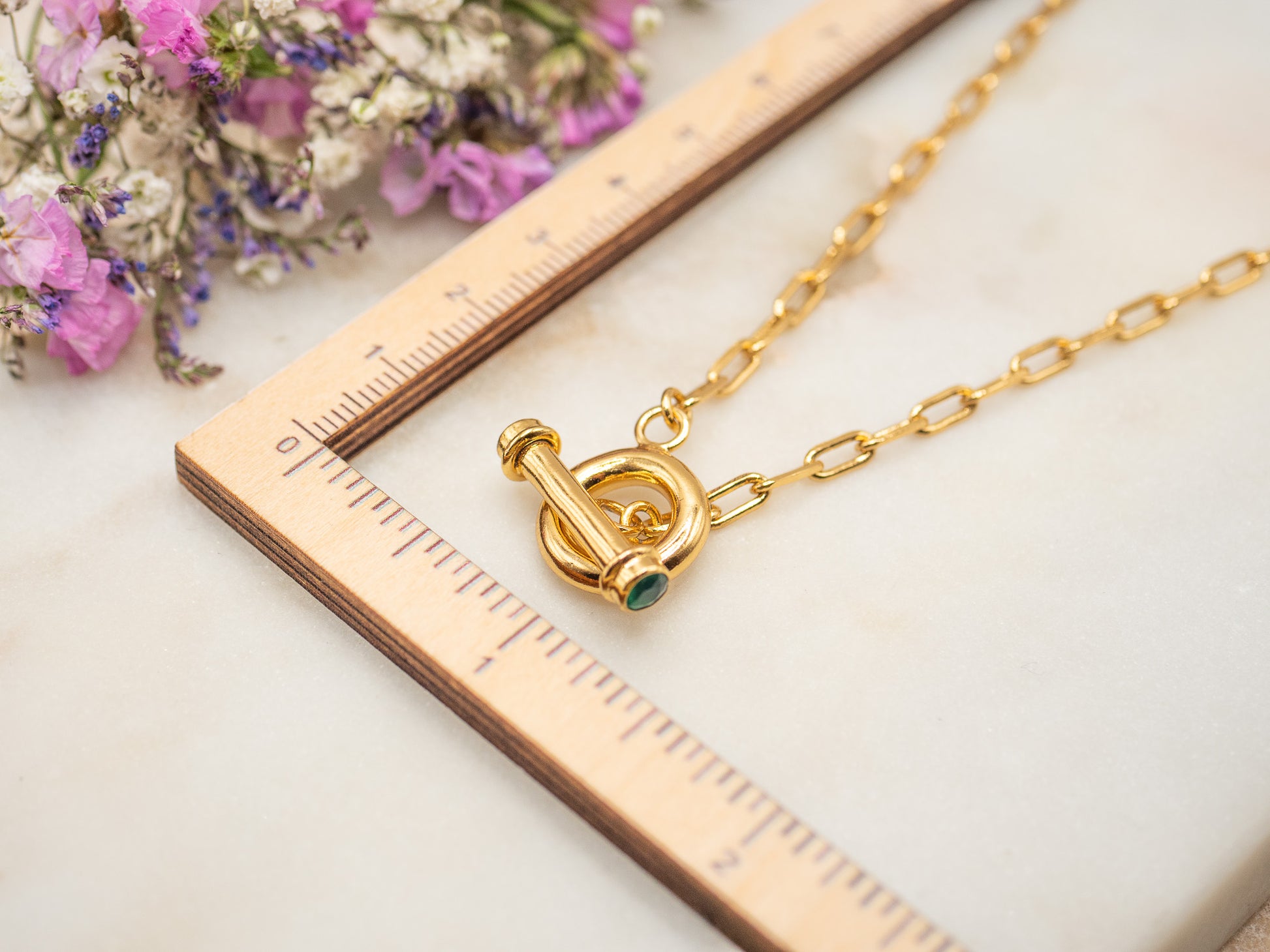 Minimaliste et audacieux, Ladbroke est un collier qui détourne les codes pour les transformer en détail chic. Sa chaîne à maillons rectangulaires en acier inoxydable doré se ferme à l’avant grâce à un fermoir toggle circulaire (1,5 cm), orné d’une pierre de malachite naturelle (4 mm).