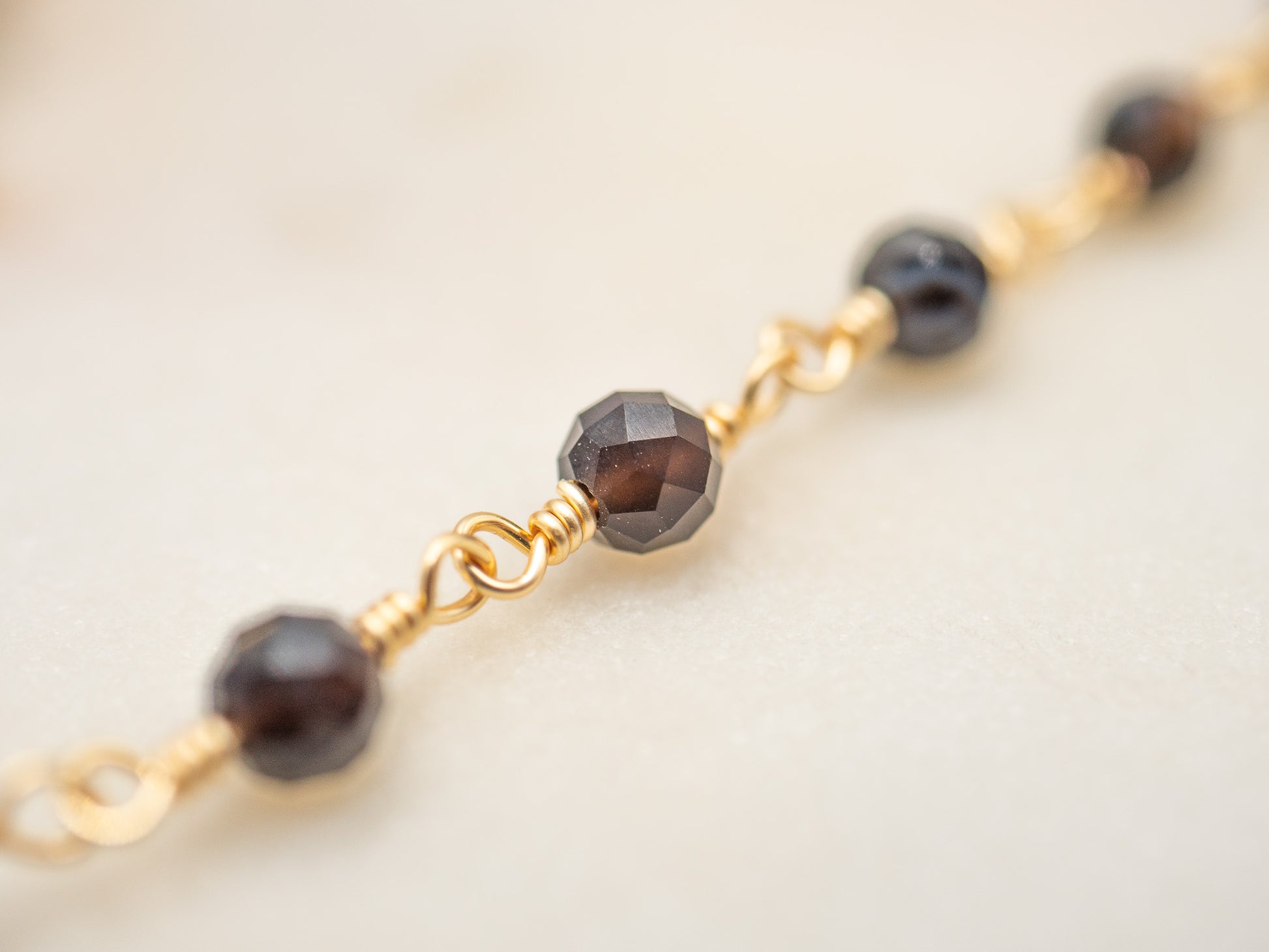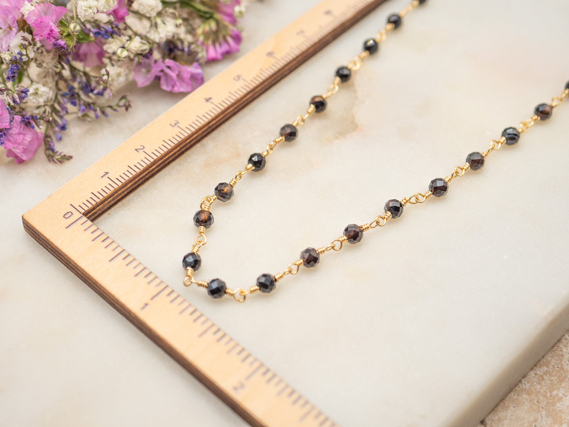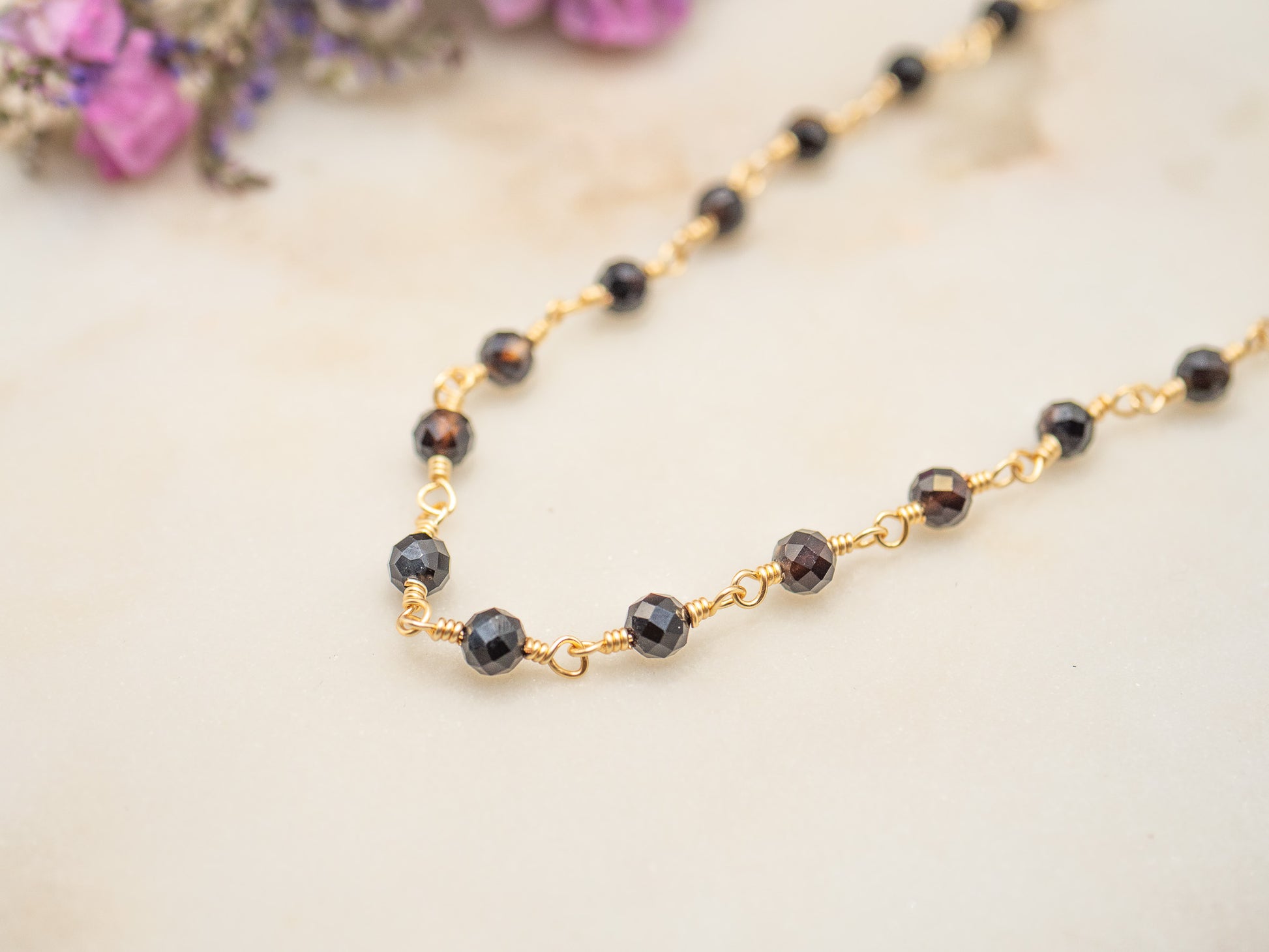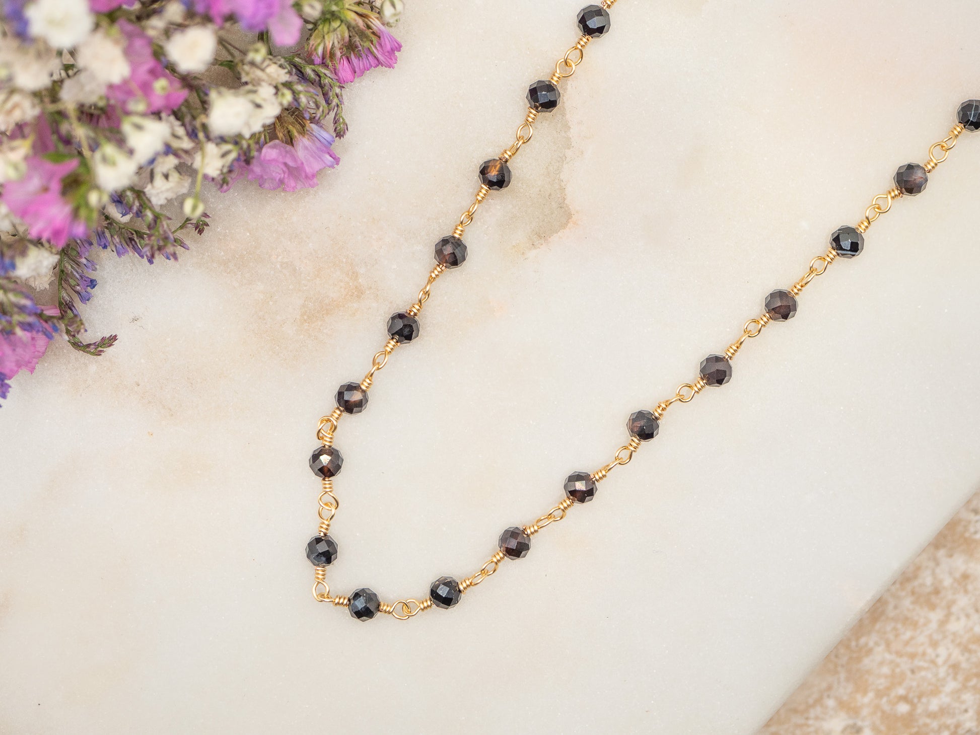 Osez l’élégance audacieuse avec Lennox, un collier au charme rétro-chic inspiré du Londres des sixties. Ses perles d’onyx noir facettées (environ 5 mm) captent la lumière avec subtilité et contrastent magnifiquement avec la finesse de la chaîne en acier inoxydable doré.
