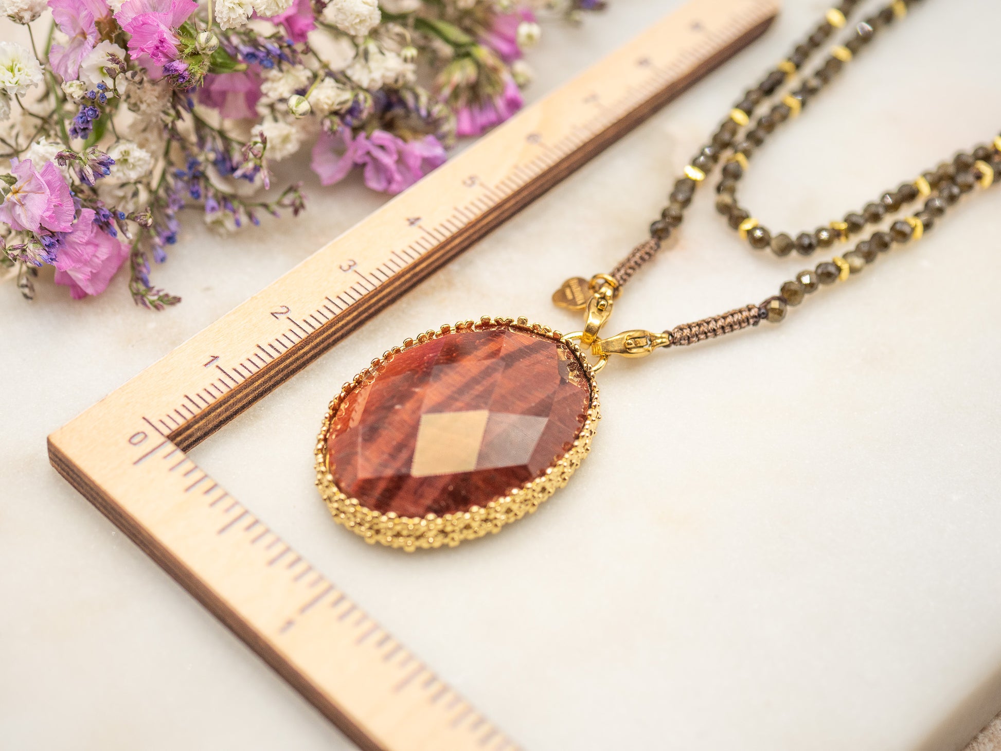 Intense et hypnotique, Marble est un collier pensé pour celles qui aiment les bijoux qui attirent le regard. Son pendentif en agate naturelle facettée (4,5 x 3,2 cm) révèle de magnifiques nuances brunes et rouges, mises en valeur par un serti texturé en acier inoxydable doré. Le pendentif repose sur un collier de perles semi-précieuses facettées (3-4 mm) aux reflets chauds.