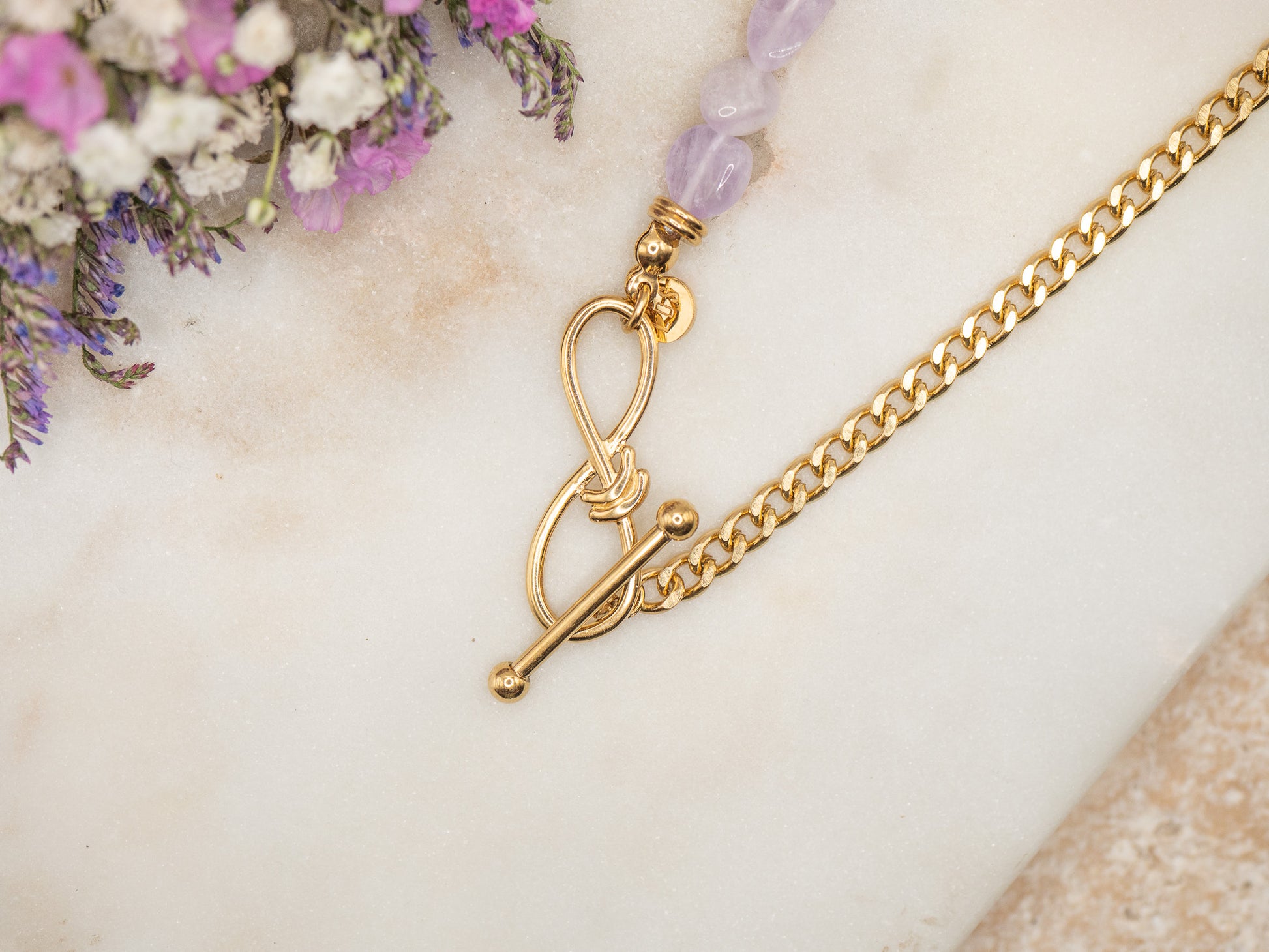 Russell est un collier qui réinvente l’alliance des contrastes avec raffinement. Sa chaîne gourmette en acier inoxydable doré affirme son caractère solaire, tandis qu’une succession de perles d’améthyste aux nuances lilas diffuse une douceur lumineuse.