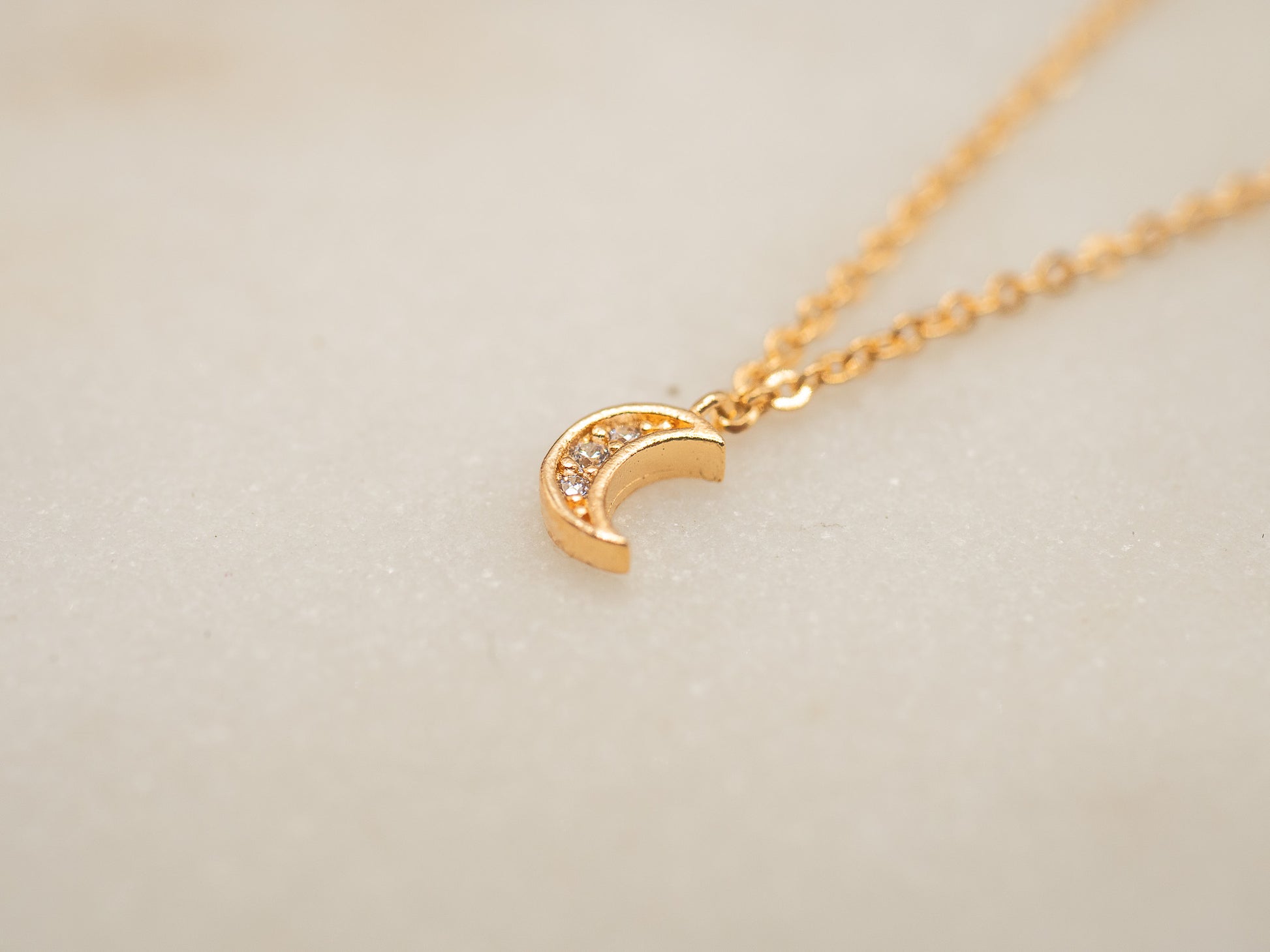 Le collier Selina brille comme une étoile discrète, porté par un pendentif en croissant de lune (0,9 cm × 0,7 cm) façonné en plaqué or 18 carats. Sertie de petits zirconium lumineux (0,1 cm chacun), cette lune délicate symbolise la féminité mystérieuse, la douceur et le renouveau.