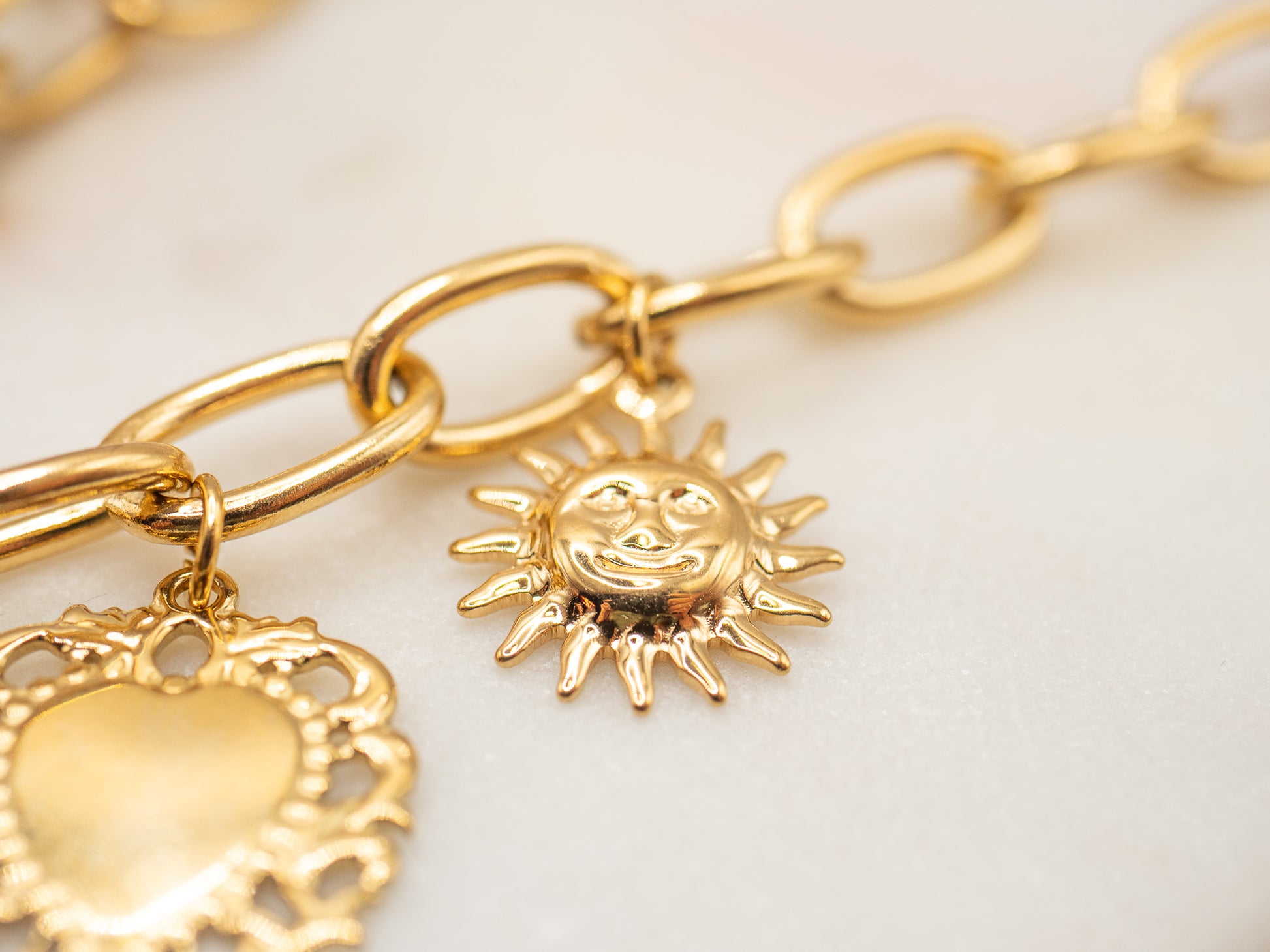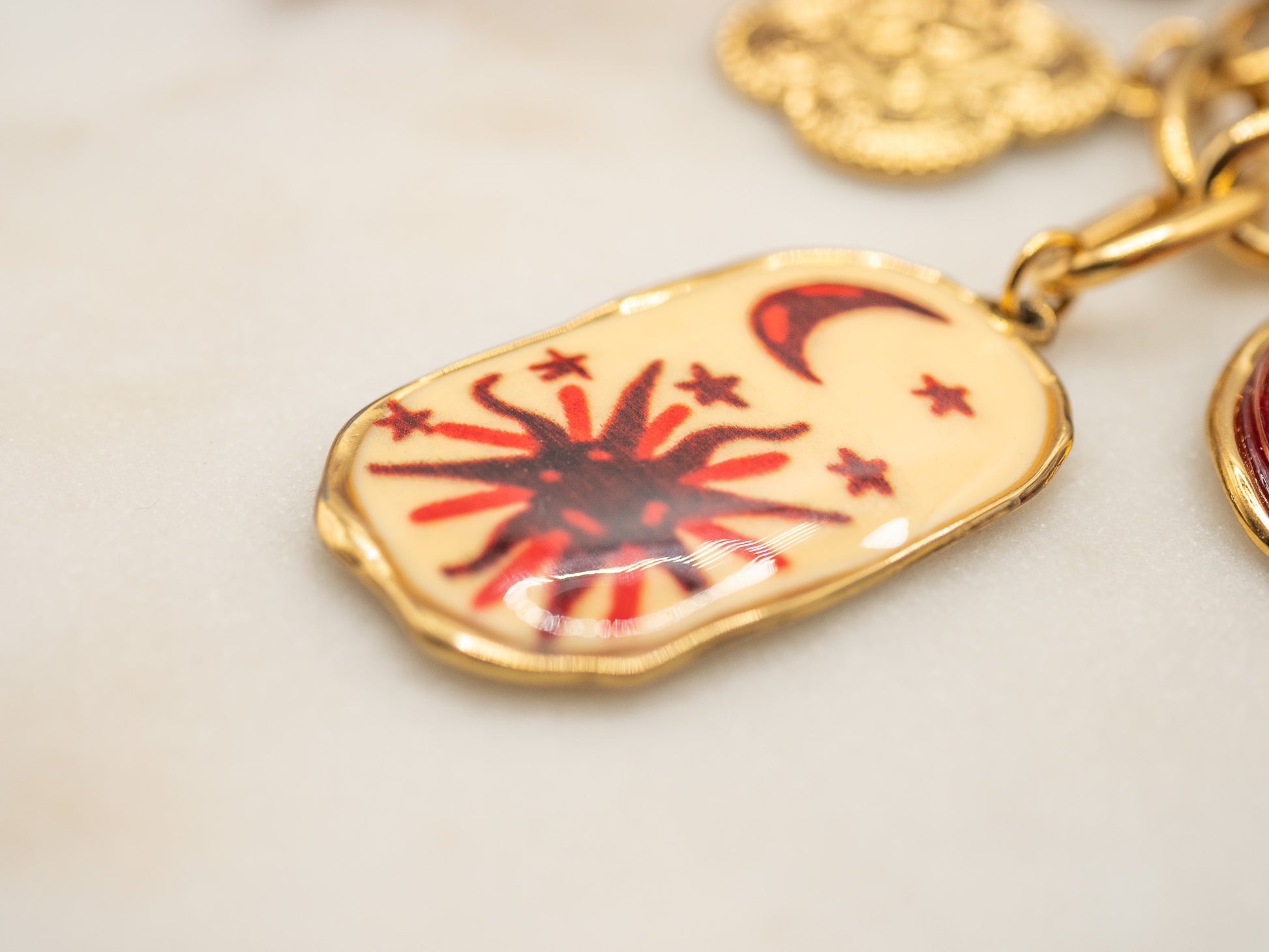 Audacieux et lumineux, Shrimpton est un collier qui capture l’esprit fantasque et créatif du Swinging London. Sa chaîne à larges maillons dorés en acier inoxydable s’orne de multiples pendentifs porte-bonheur : un soleil rayonnant, un cœur ajouré, un médaillon, ou encore une pierre rouge vibrante. Chaque détail semble raconter une histoire, entre poésie et excentricité.