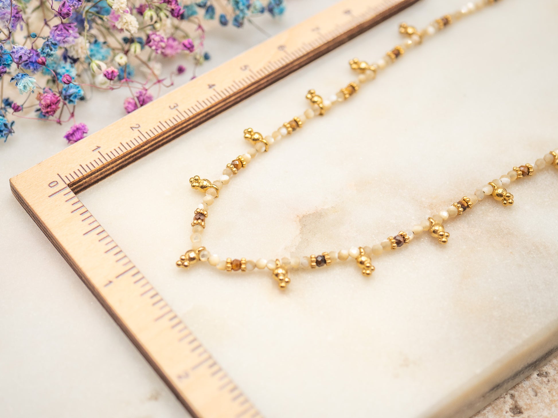 Le collier Snow Biscuit est une ode aux douceurs hivernales, inspiré des sablés anglais au beurre qu’on dévore à Noël, bien au chaud. Ses perles nacrées, dans des tons crème et miel, rappellent les biscuits saupoudrés de sucre glace, tandis que les éléments dorés apportent une touche précieuse et festive.