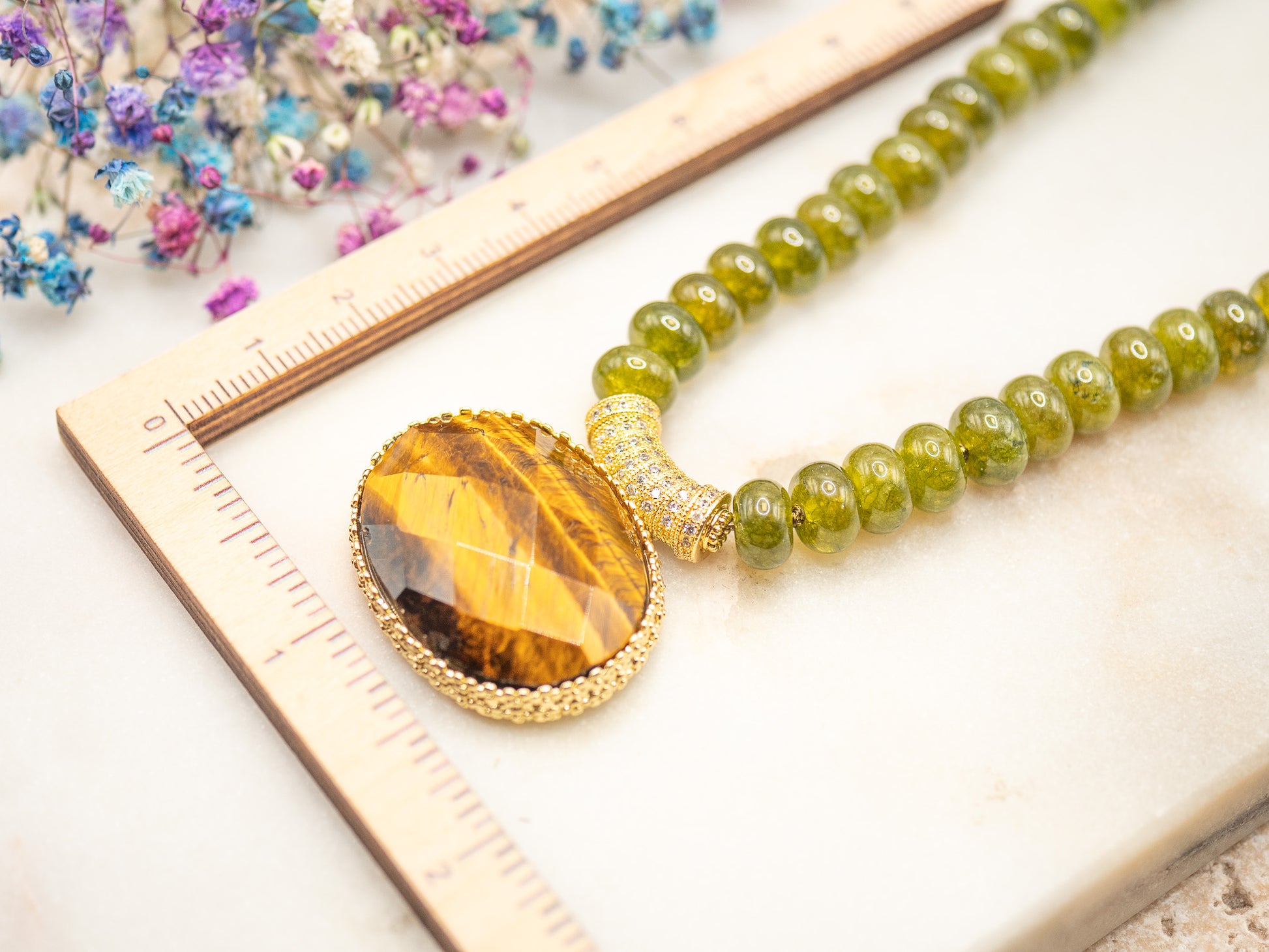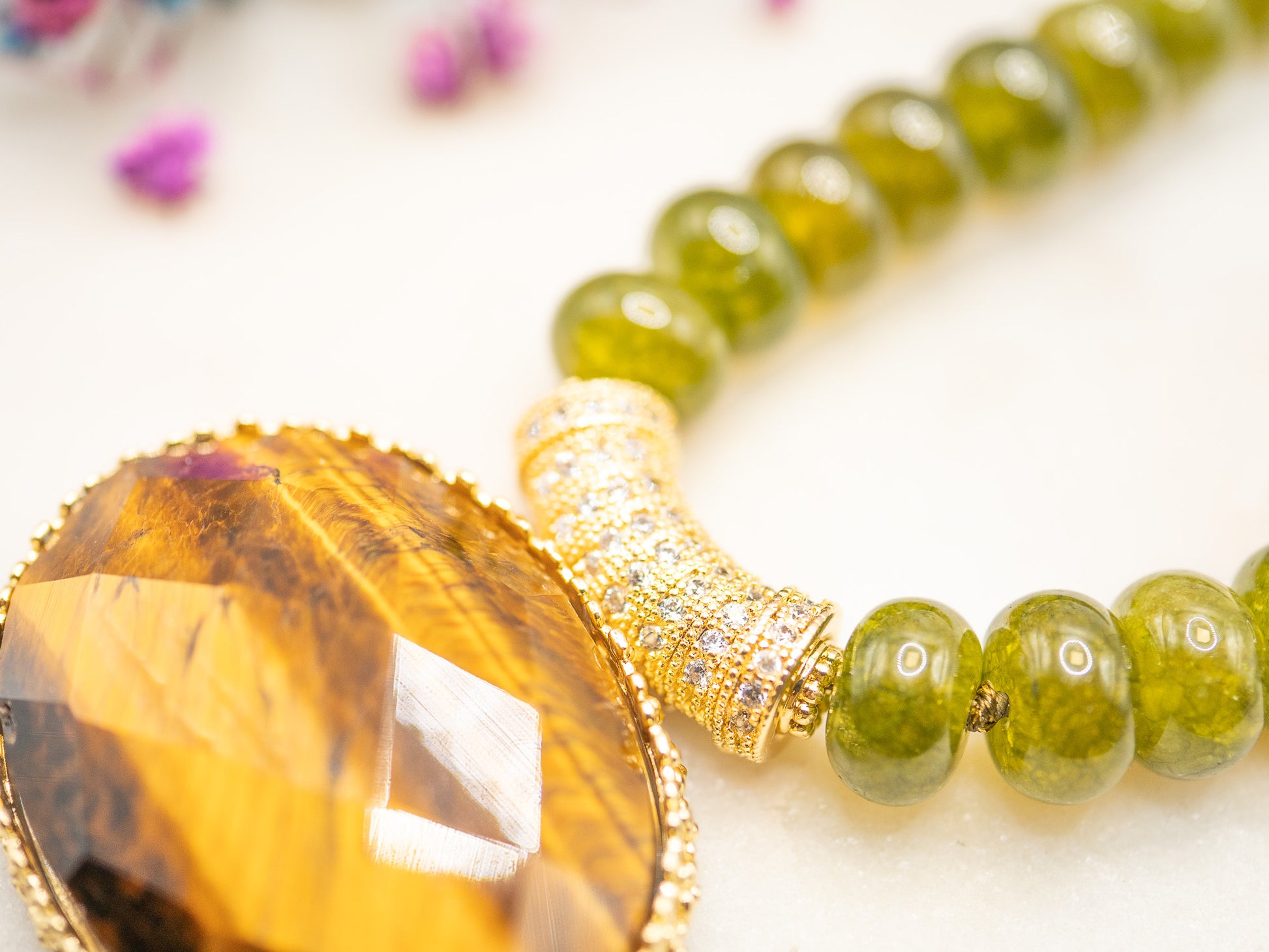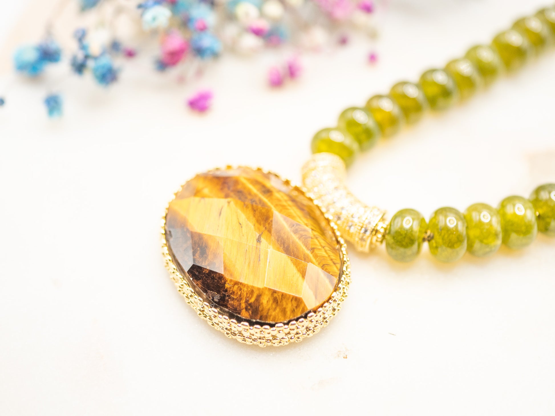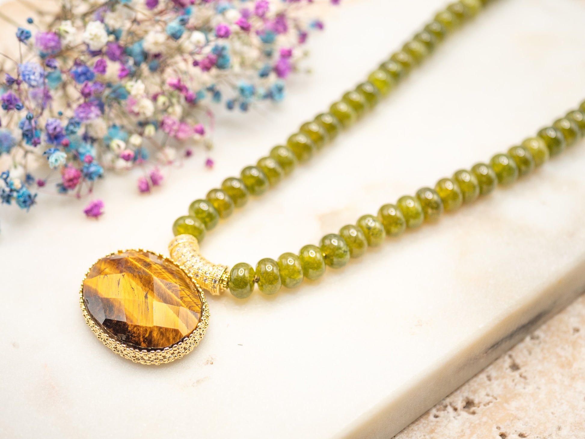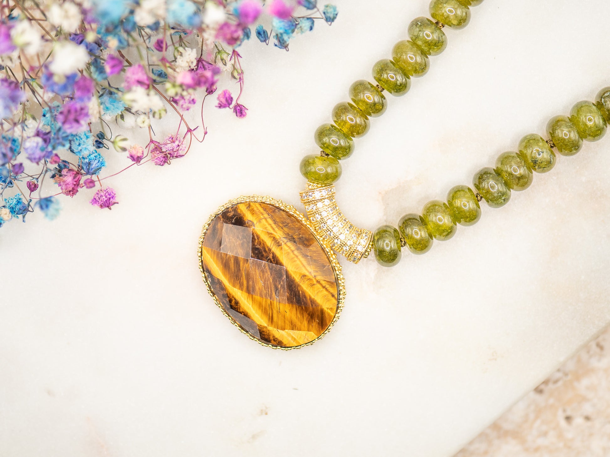 Il se compose de perles rondes en pierre semi-précieuse vert mousse, brillantes et lumineuses, enfilées sur une base résistante. Au centre trône un large pendentif ovale facetté en œil de tigre flamboyant, serti dans un encadrement en plaqué or 18 carats richement texturé.